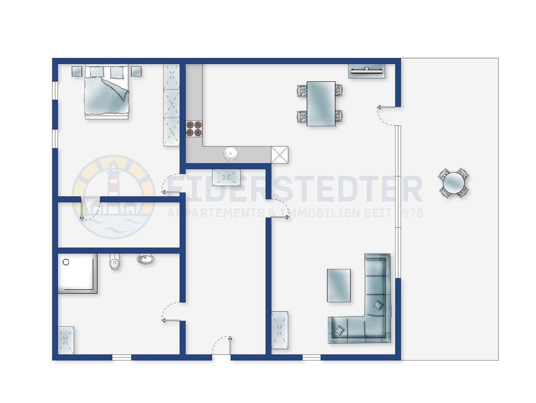 Komfortable 2-Zimmer-Ferienwohnung Spatzennest mit ca. 46m² auf 1 Ebene (EG) für bis zu 3 Personen. In ruhiger Lage in der Nähe des Leuchtturms im Ortsteil Böhl in St. Peter-Ording. Bei passenden Windbedingungen kann man das Meeresrauschen hören. Hunde (bis 59cm) sind herzlich willkommen.