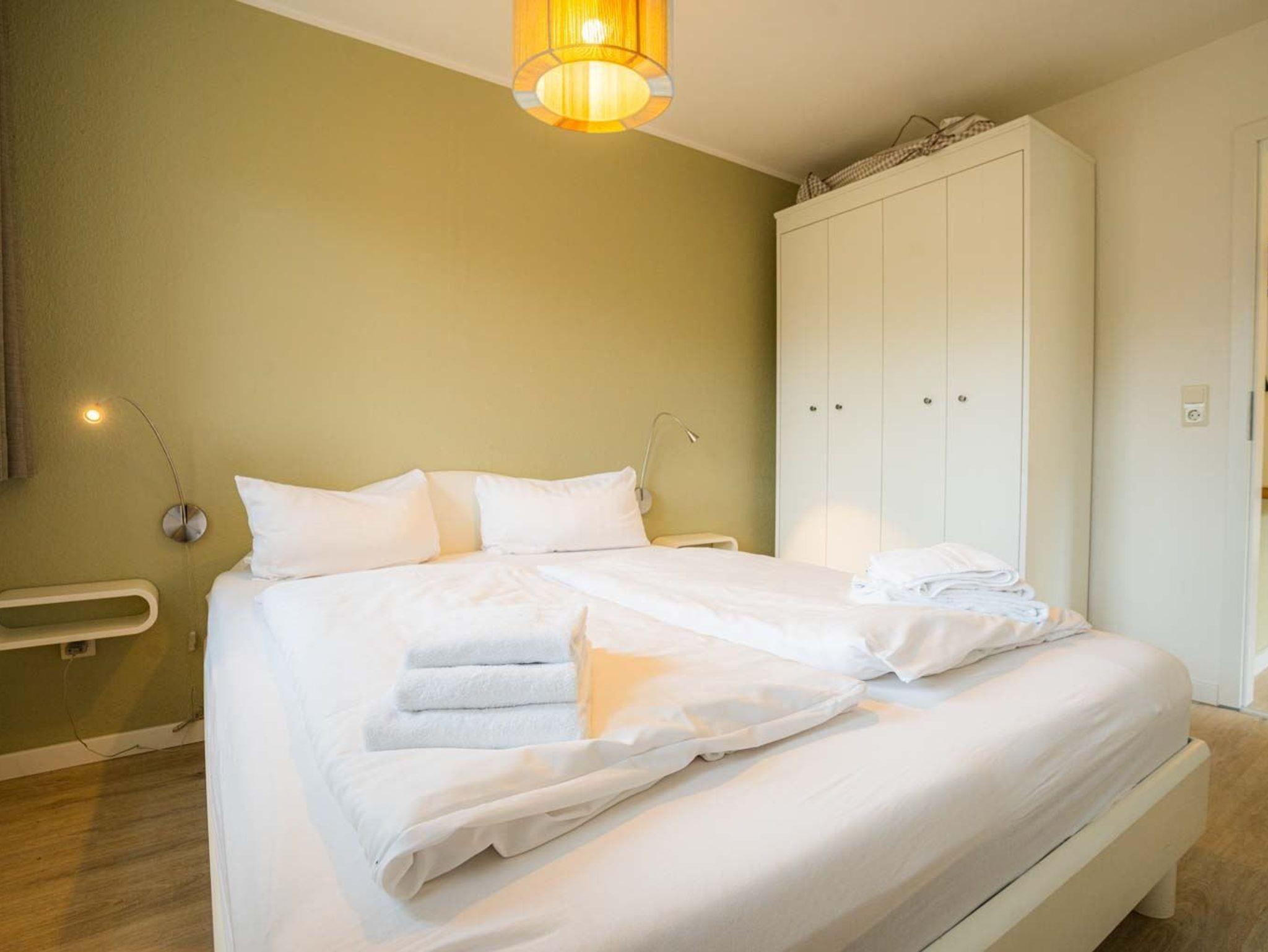 Schlafzimmer mit Doppelbett (2x 80x200cm) und Kleiderschrank. Daran anschließend ein Abstellraum für Koffer, Staubsauger und Garderobe.