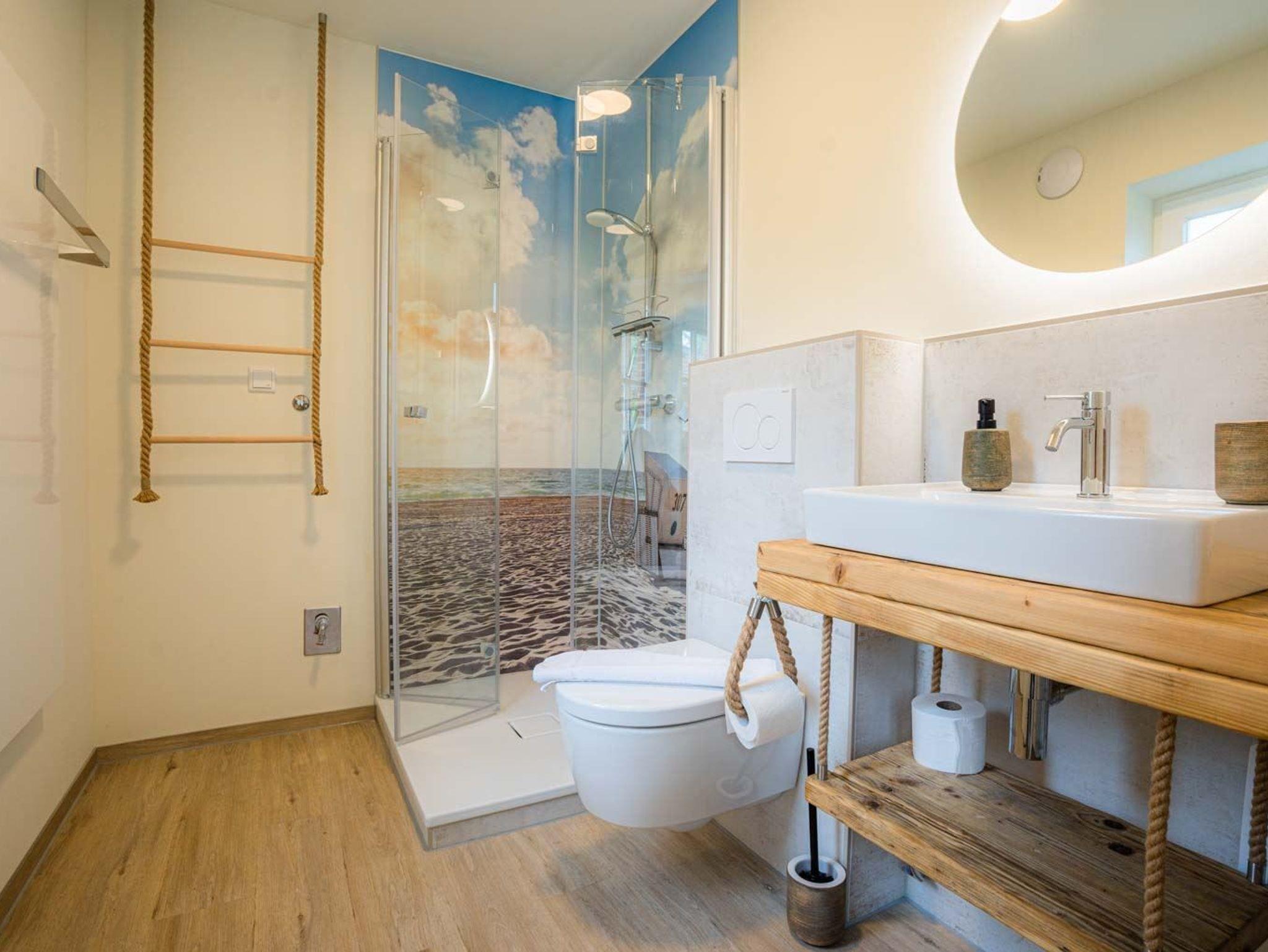 Badezimmer (Duschbad) mit Dusche, WC, Tageslicht und Föhn.