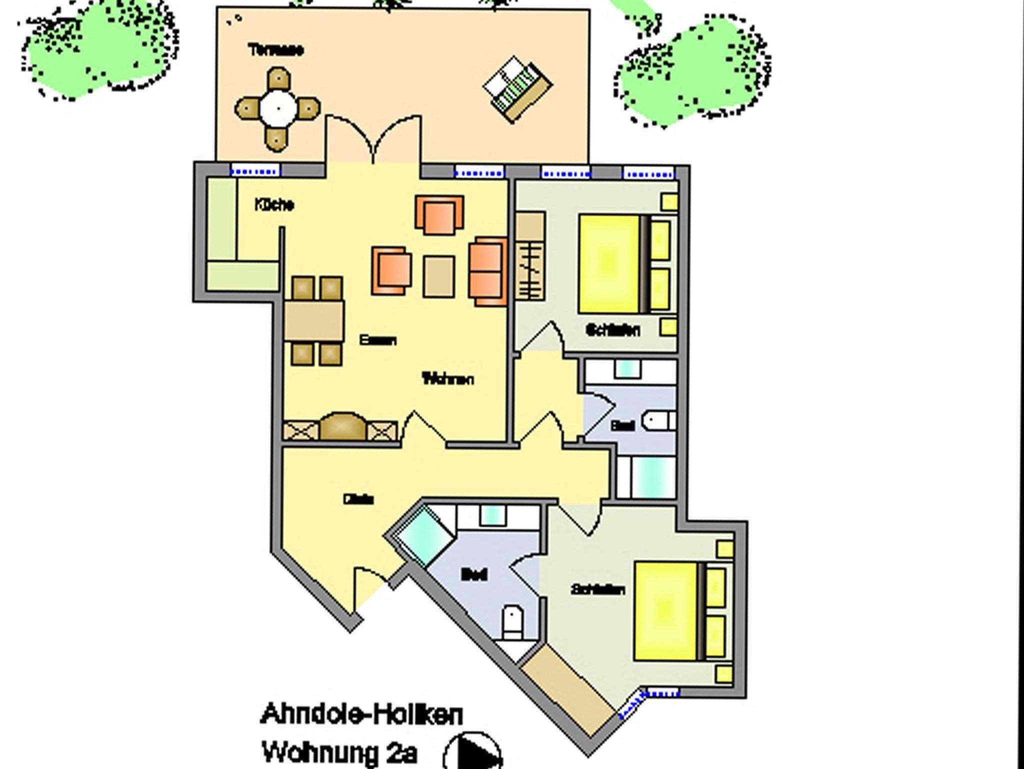 Eingangsdiele mit Garderobe, großzügiger Wohn-Essbereich mit direktem Zugang auf eine große, durch Friesenwälle und Gehölze abgeschirmte Terrasse in Westlage mit Gartenmöbeln und einem Strandkorb, zwei Schlafzimmer mit Doppelbetten, zwei Duschbäder/WC, separate Küche. Im Untergeschoss befindet sich eine Gemeinschaftssauna mit Ruheraum, verschiedenen Duschen, Fußbäder, WC. Umkleideraum, Solarium, Fitnessraum, Tischtennis. Im Außenbereich befindet sich ein Spielplatz für die Kleinsten, Stellplatz, Fahrradständer und ein wunderschön angelegtes Gartengelände umsäumt von Grünland.