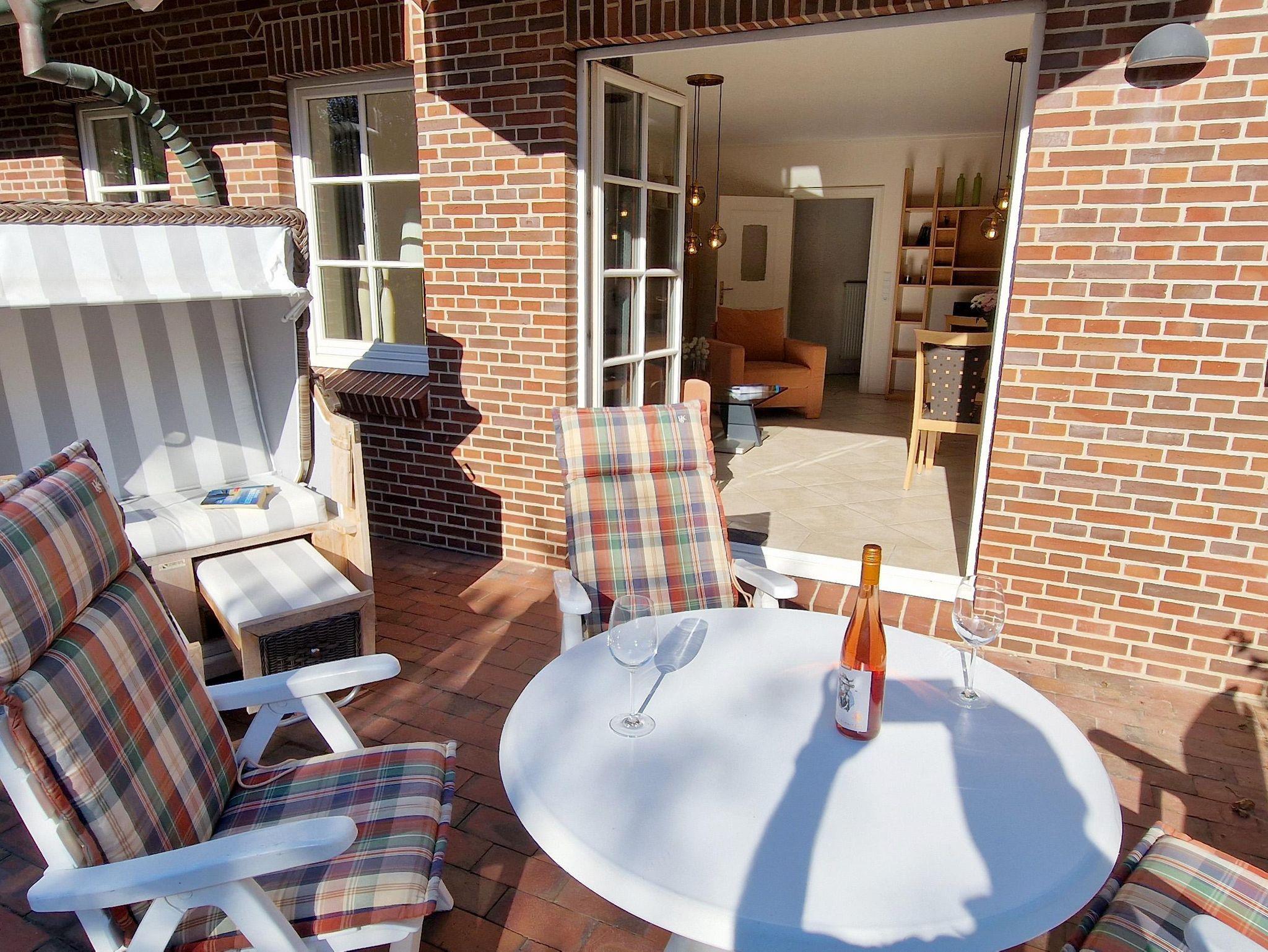 • Terrasse mit Gartenmöbeln und Strandkorb