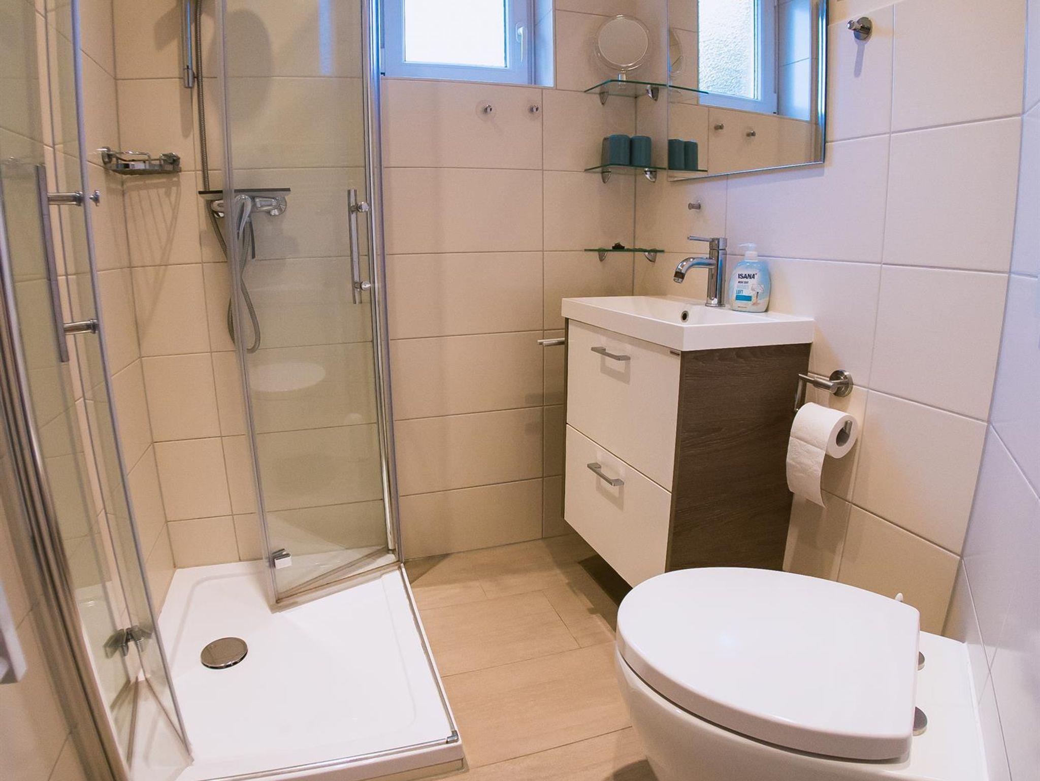 Das Badezimmer bietet eine Dusche, Waschtisch und WC.