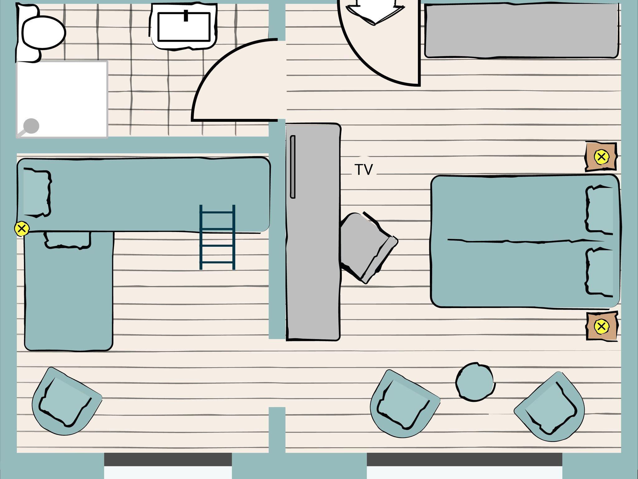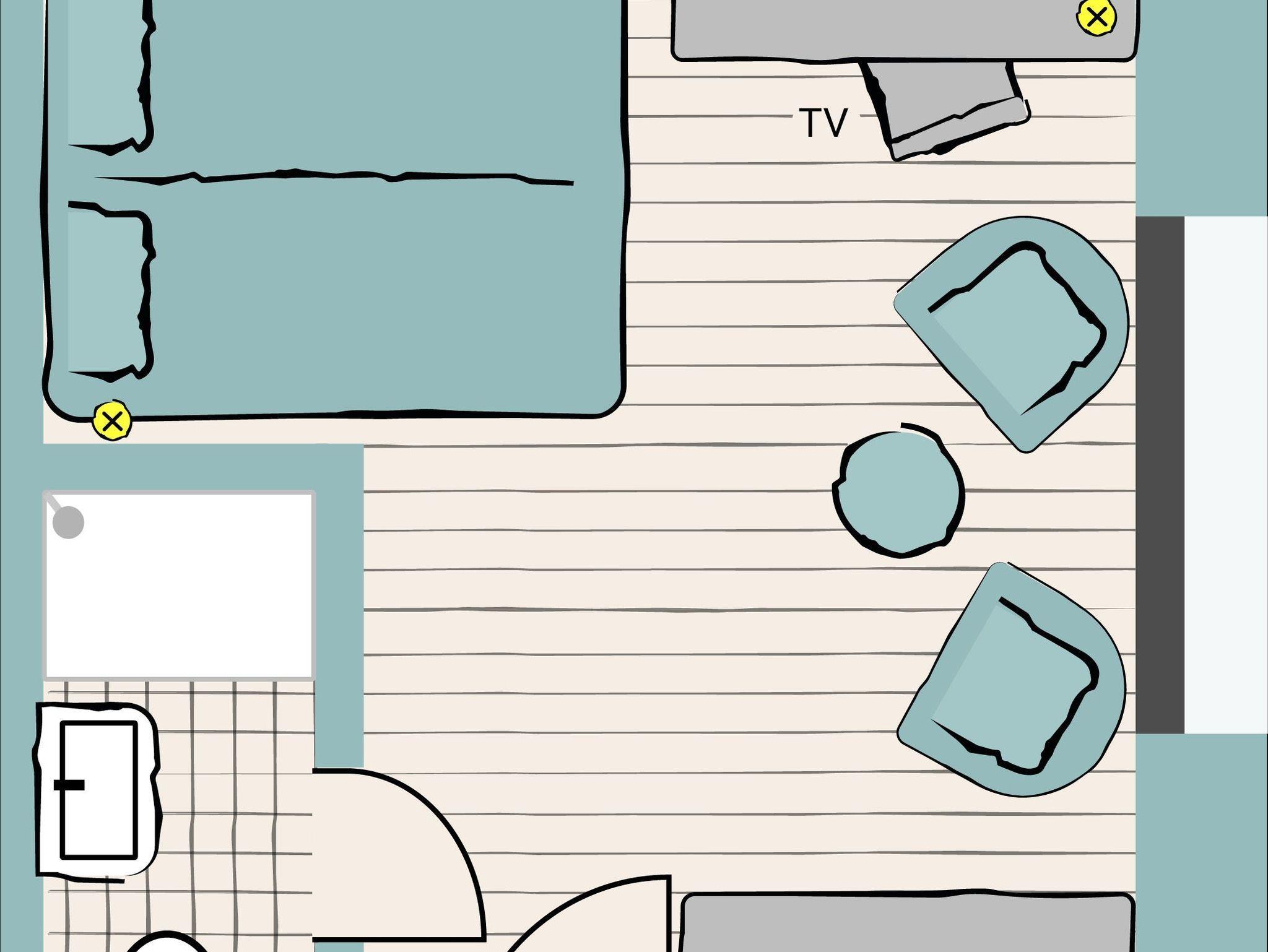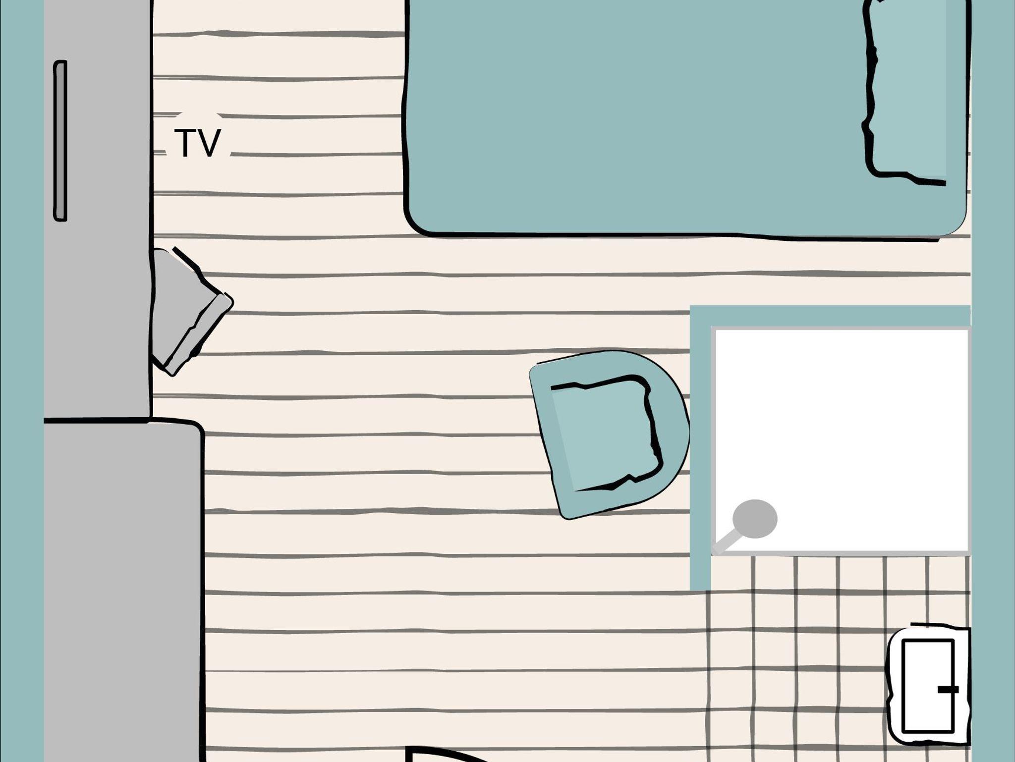 - Wohn/Schlafzimmer (Vorhangtrennung) mit Doppelbett (1,80m breit),