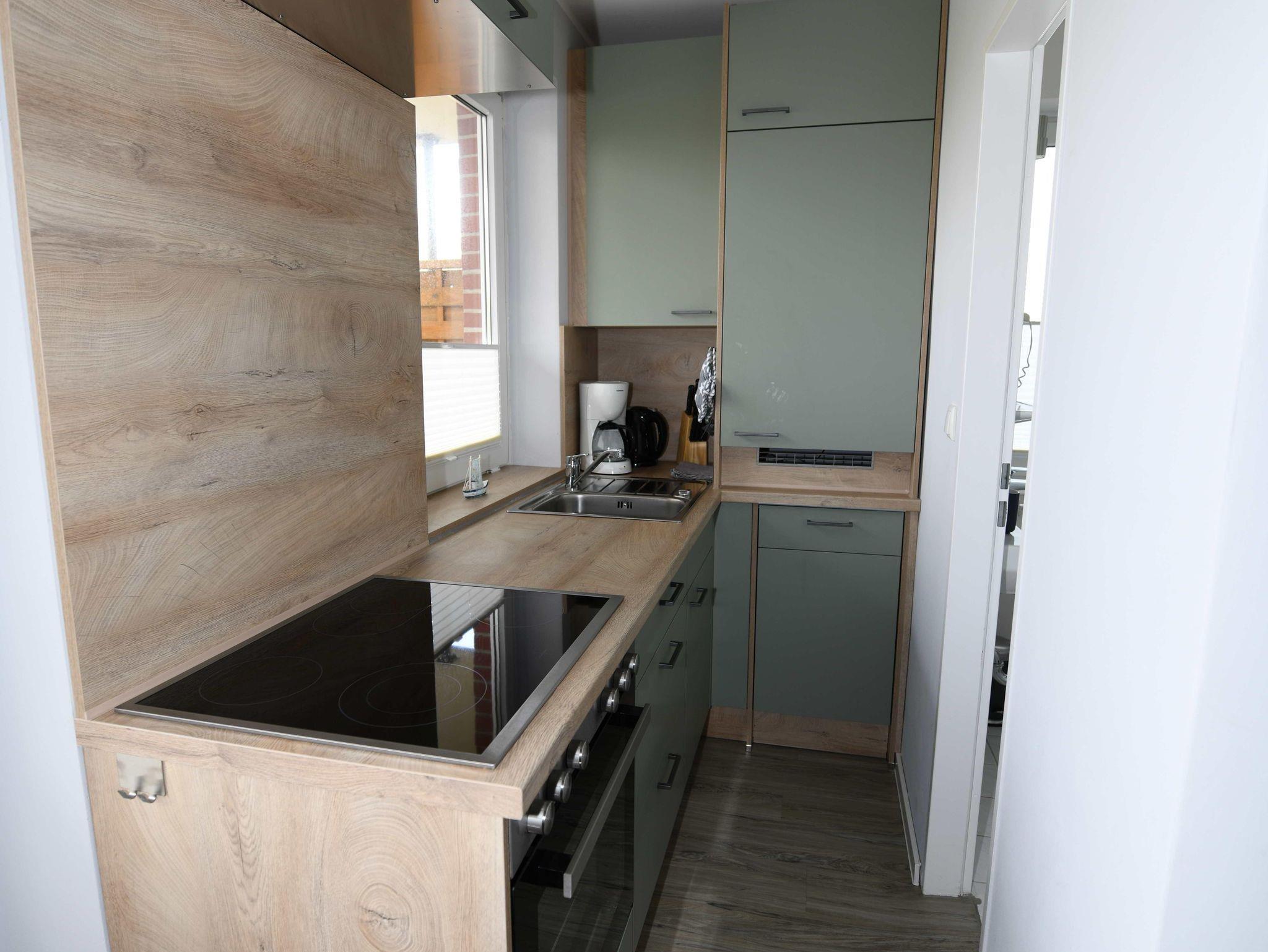 - Küchenzeile mit Kühlschrank, Spülmaschine, Herd, Backofen, Kaffeemaschine, Toaster und Wasserkocher