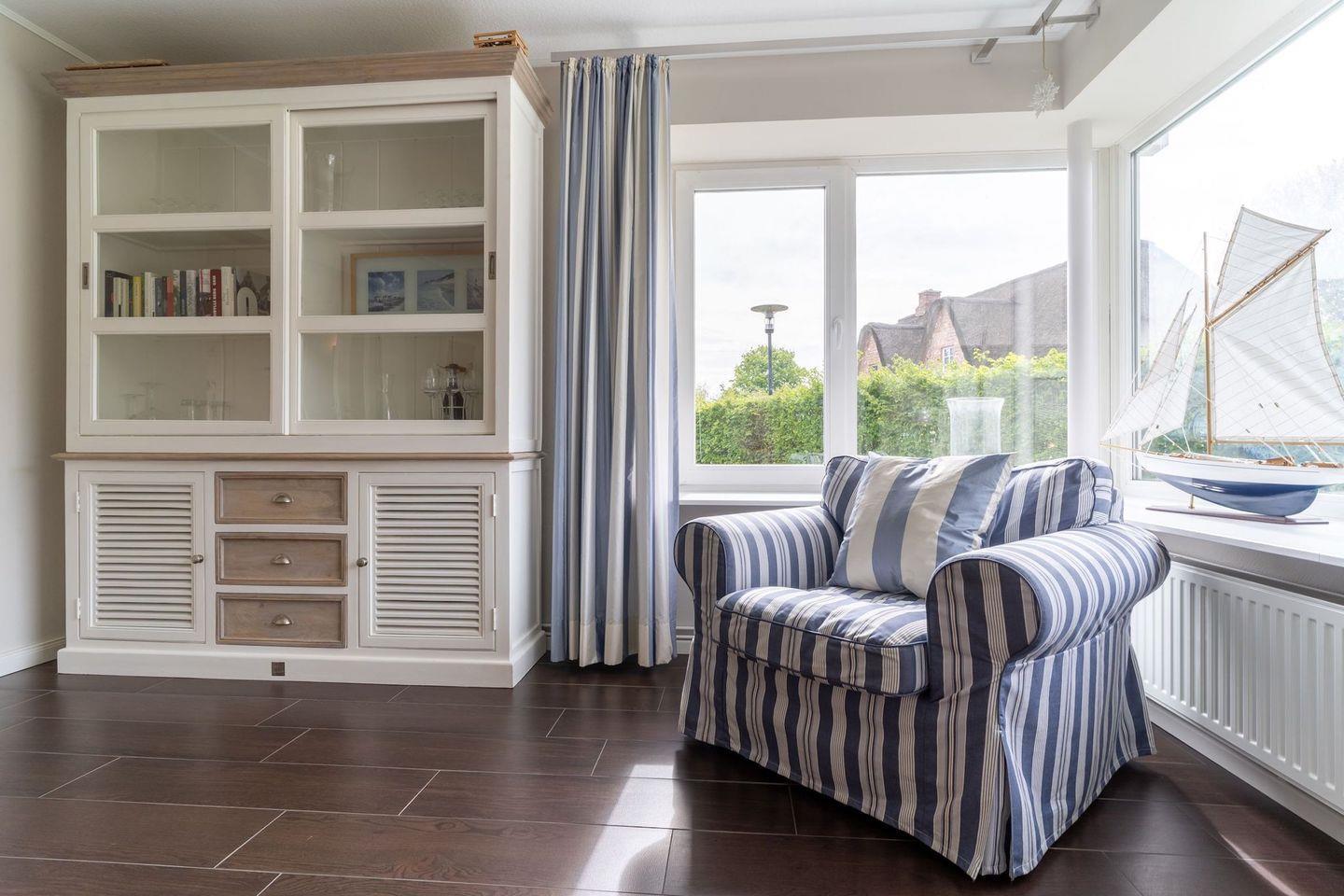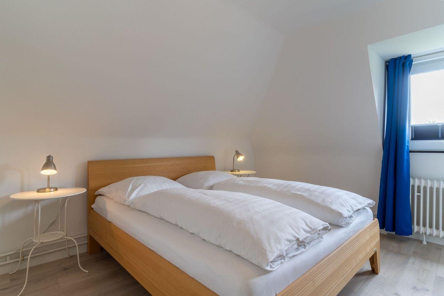 Im Erdgeschoss befindet sich der lichtdurchflutete Wohnraum mit TV und einem großzügigen Essbereich. Die Wohnräume sind mit Möbeln im shabby look ausgestattet. Vom Flur aus gelangt man in die voll ausgestattete Küche mit gemütlichen Sitzbänken. Außerdem ist im Erdgeschoss ein Duschbad und ein Einzelschlafzimmer mit Schreibtisch und einer Infrarot-Wärmekabine. Über eine Treppe gelangt man in das Obergeschoss. Die drei Schlafzimmer, zwei mit einem Doppelbett und eins mit einem Etagenbett sorgen für ruhmvolle Erholung. Darüber hinaus befindet sich im Obergeschoss ein weiteres Duschbad mit einer Badewanne.