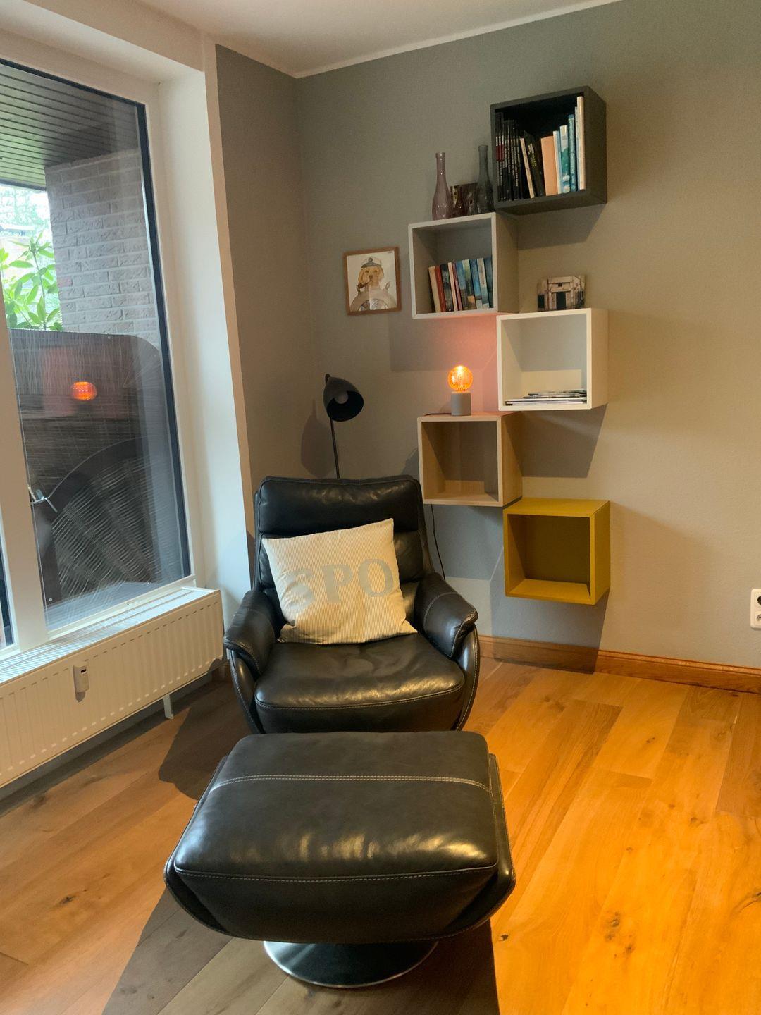Die ca. 50 m² große Ferienwohnung im Erdgeschoss ist gut ausgestattet und gemütlich eingerichtet. Das geräumige Wohnzimmer verfügt über einen Kamin und komfortable Ledersessel, die zum Entspannen einladen. Der Essbereich bietet einen schönen Ausblick in den Garten, und WLAN steht zur Verfügung.