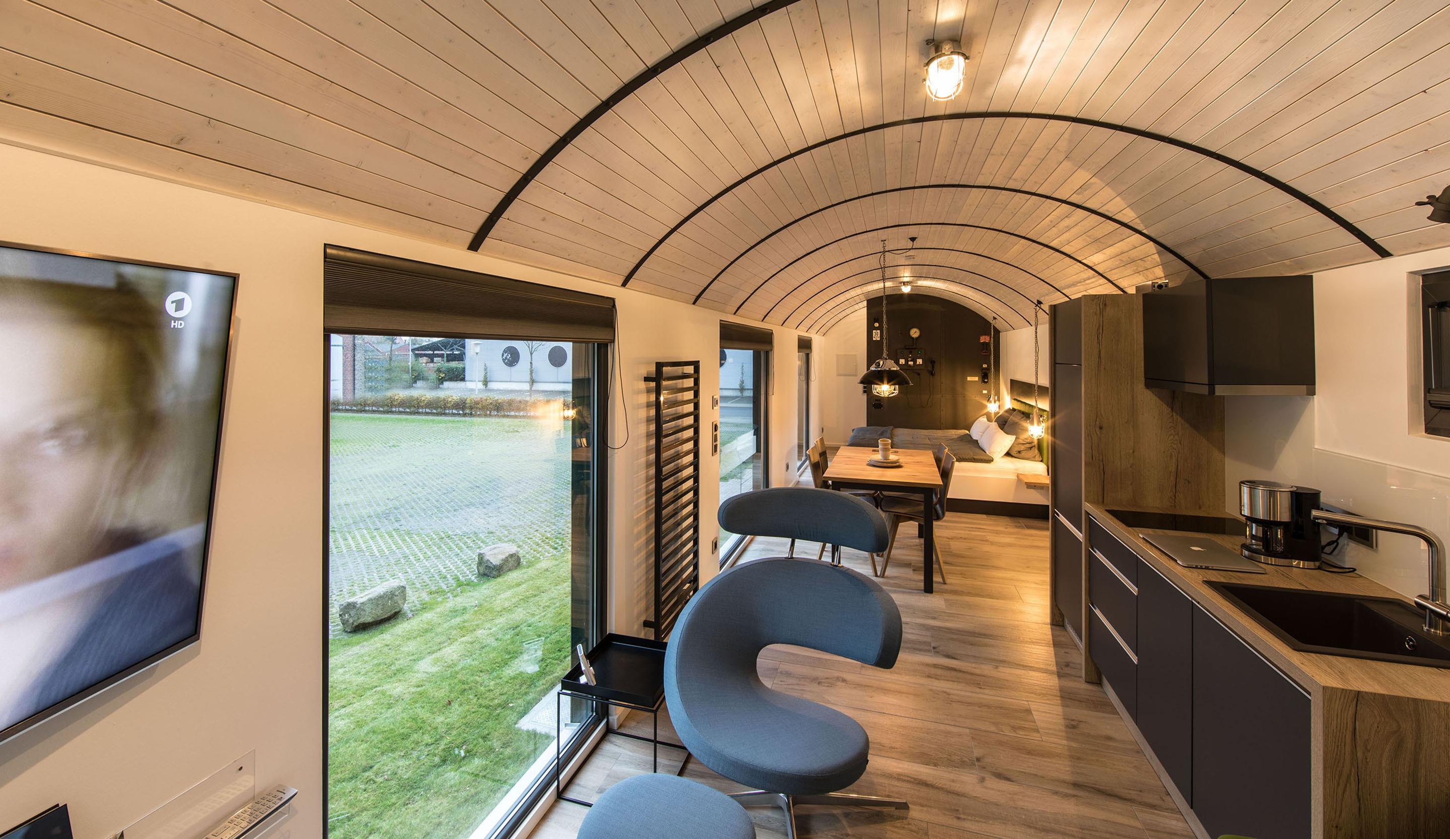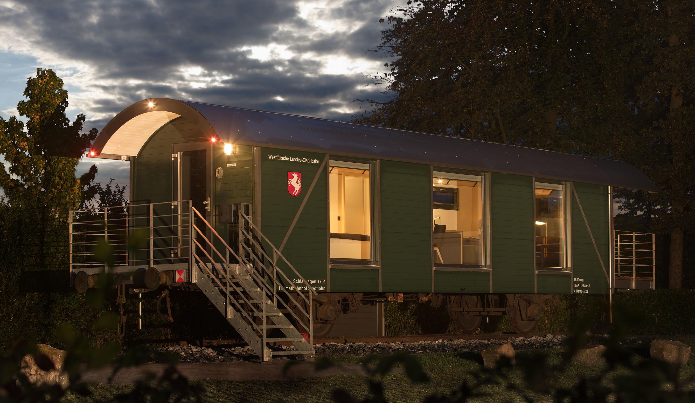 Der alte Waggon der Baureihe 660 wurde von lokalen Handwerkern zum Erste-Klasse-Premium-Schlafwagen umgebaut, der sich harmonisch in die Umgebung des alten Lokschuppens einfügt.