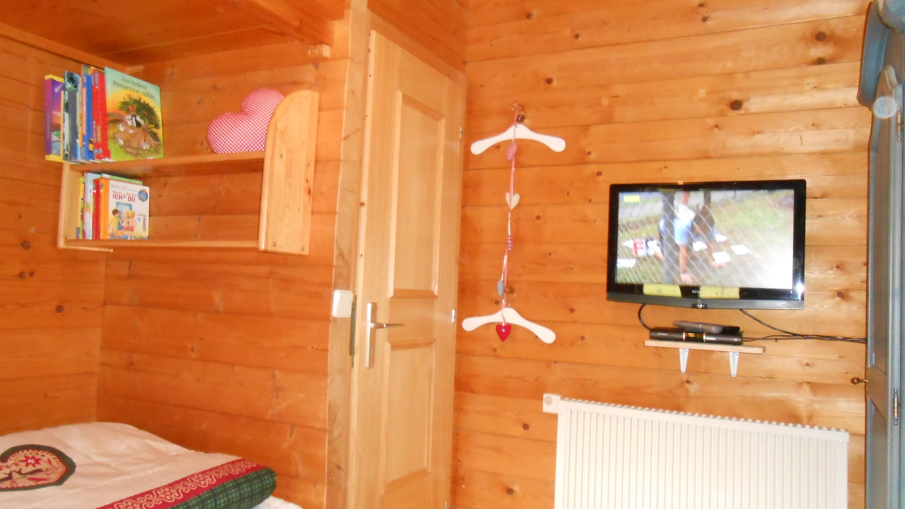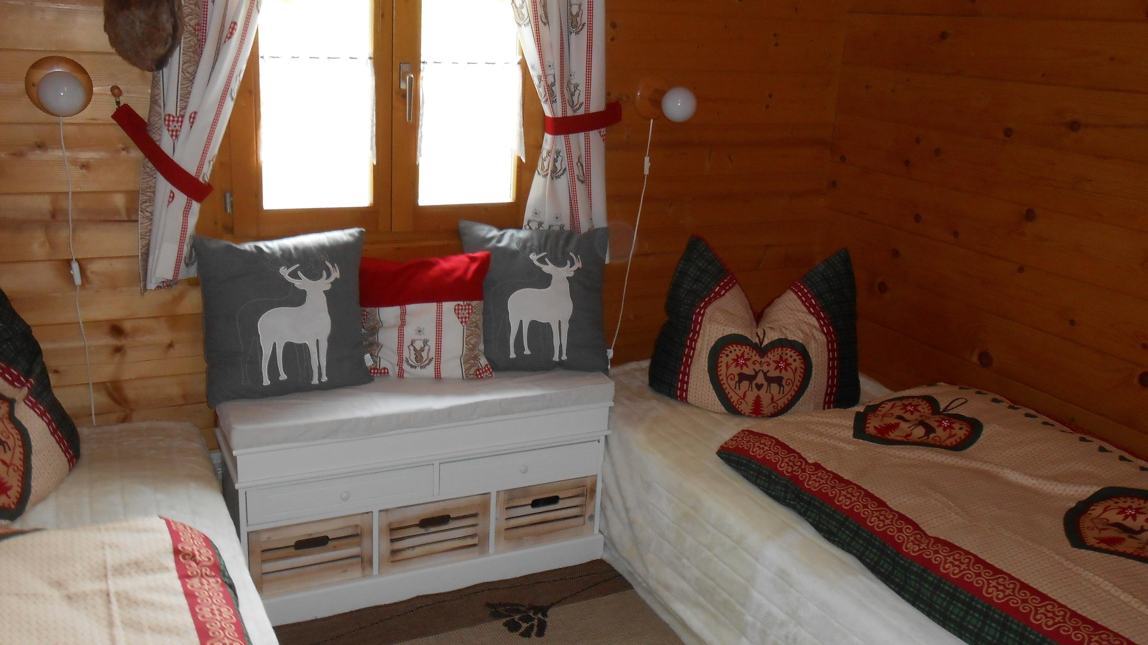 1 Schlafraum mit zwei getrennten Betten und eingebautem Hochbett und genügend Stauraum für Kleidung.