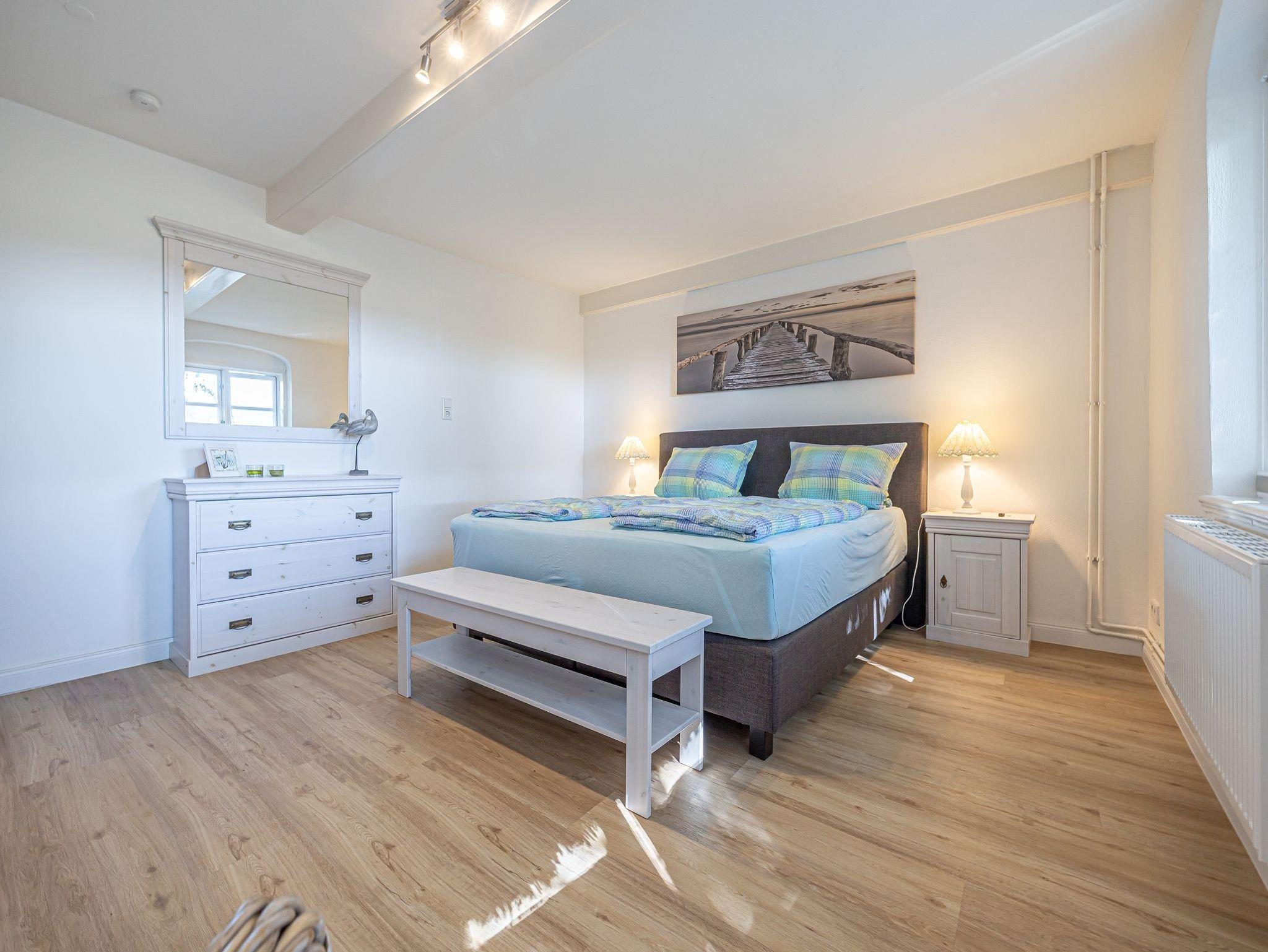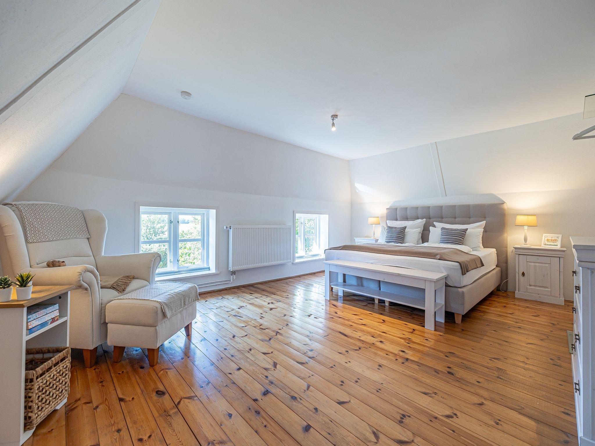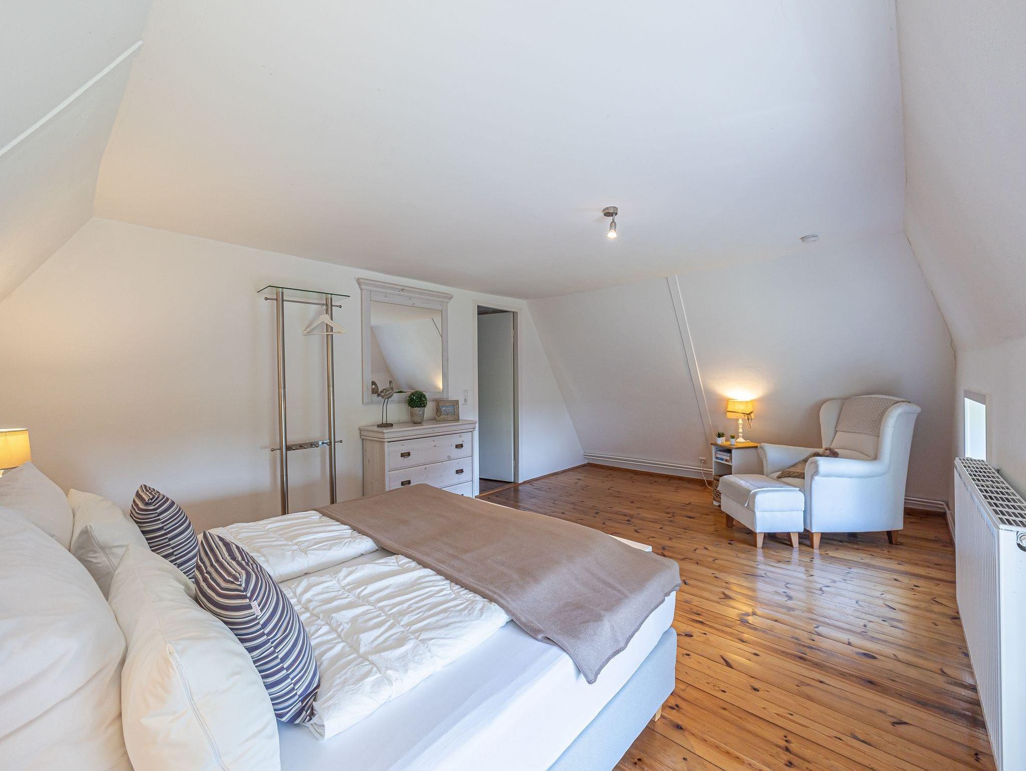 Im Obergeschoss:Schlafzimmer mit hochwertigem Boxspringbett (180x180) und Fußbodenheizung; Bettwäsche inklusive.