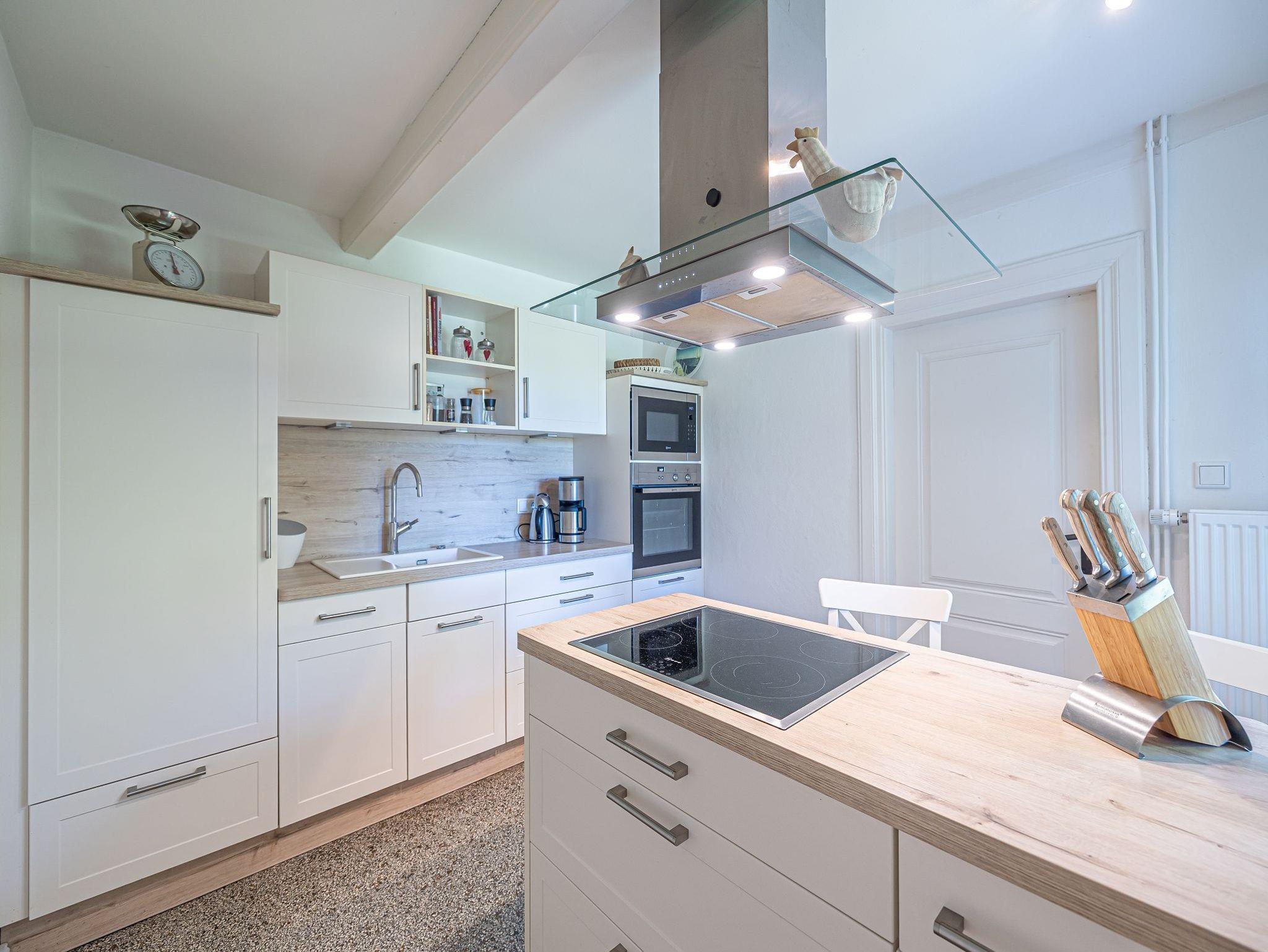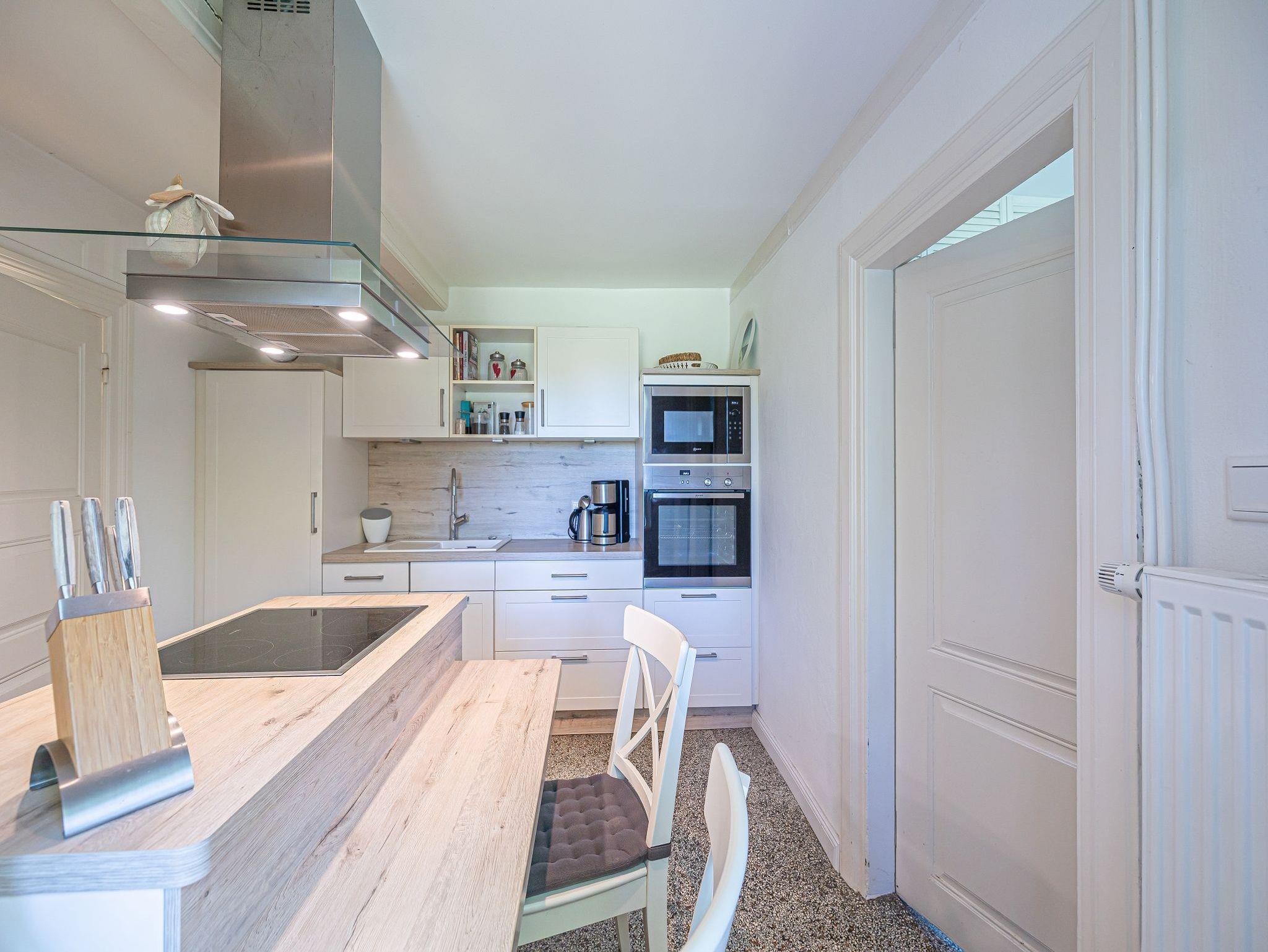 • Gut ausgestattete Küche mit Kochinsel, kleinem Essplatz und Original-Terrazzoboden