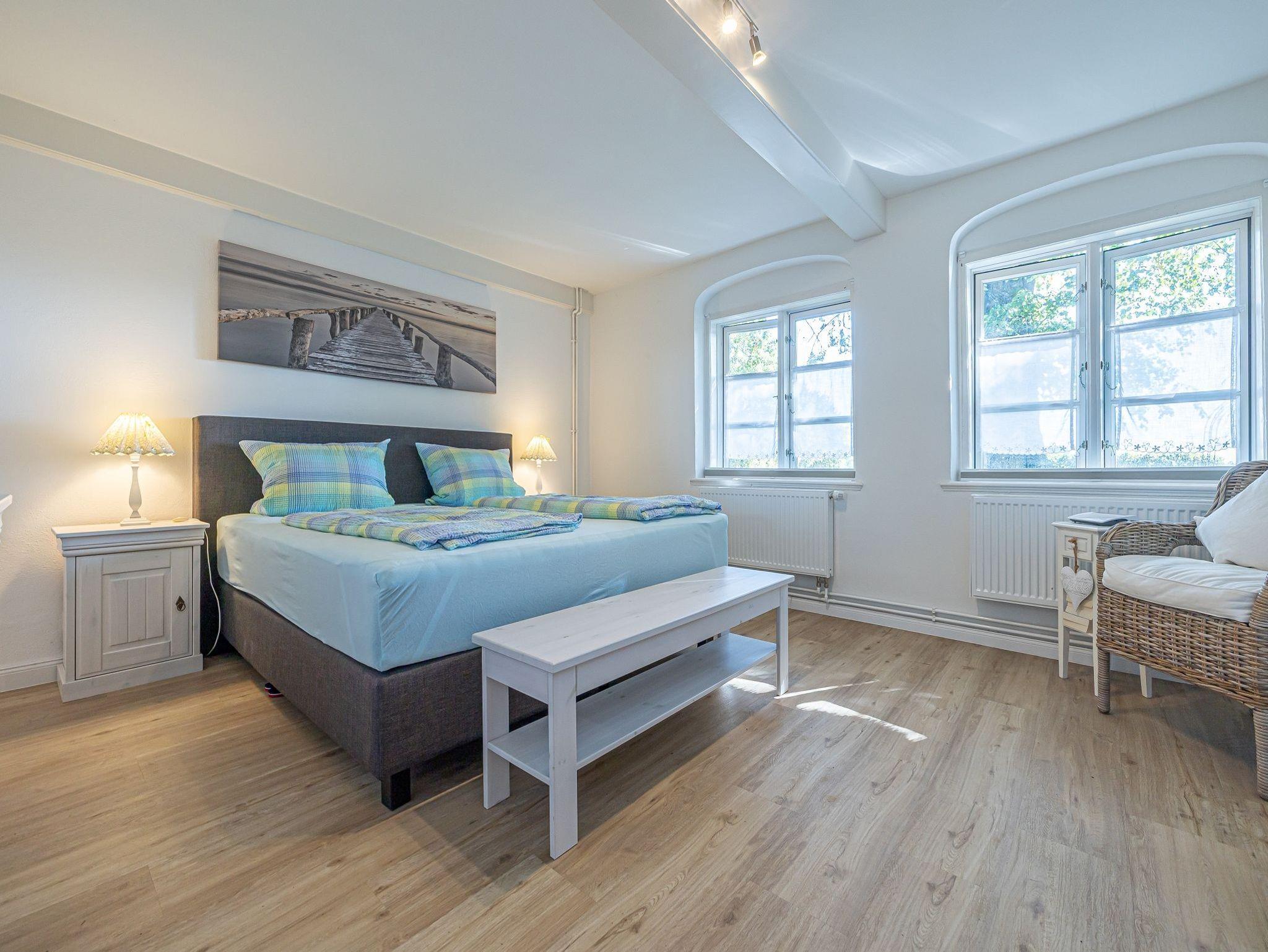 • Schlafzimmer mit hochwertigem Boxspringbett (180x180) und Fußbodenheizung; Bettwäsche inklusive