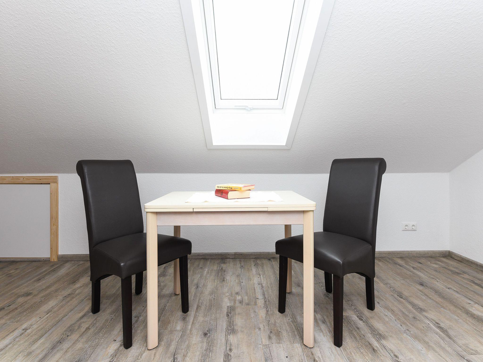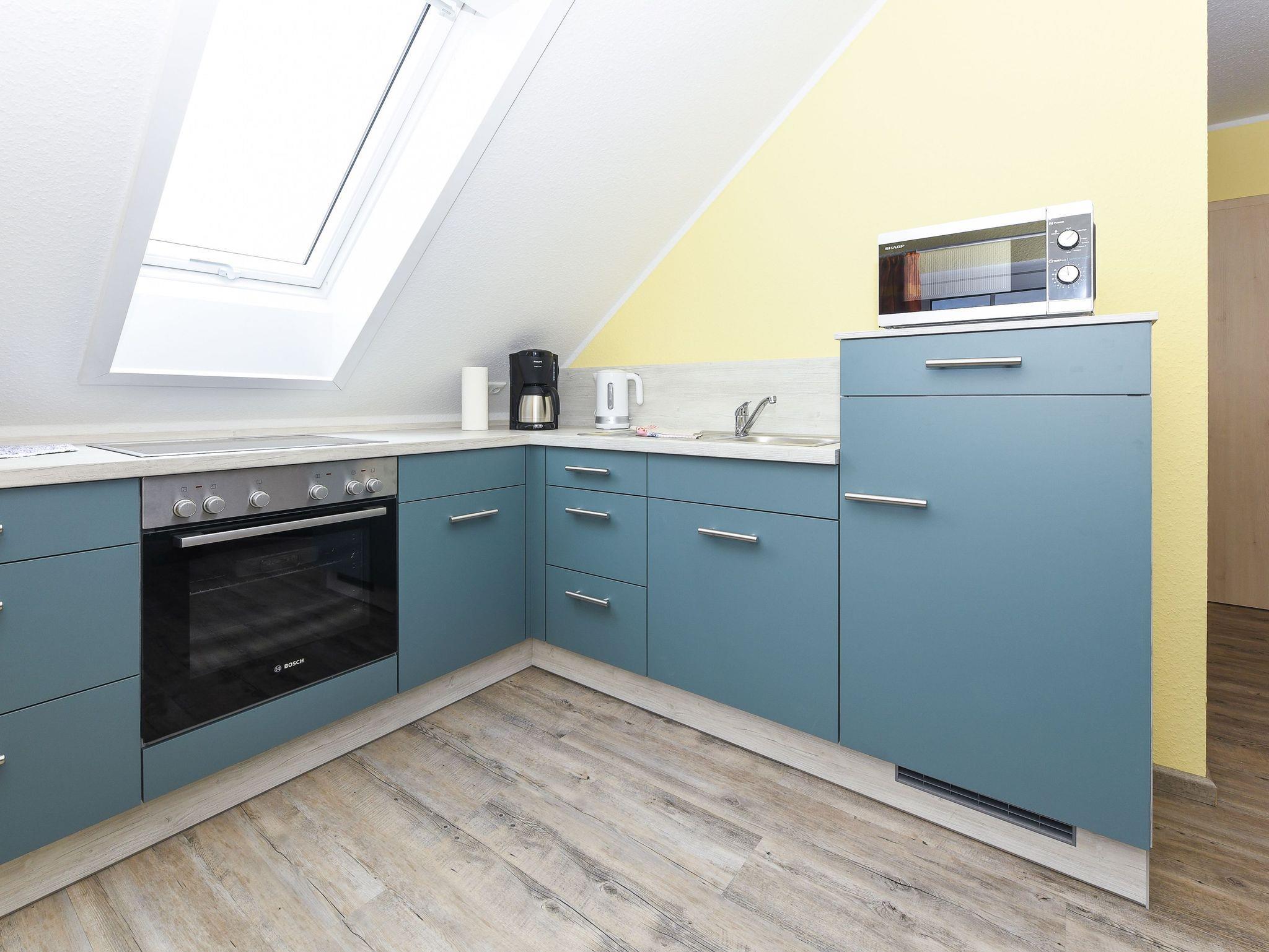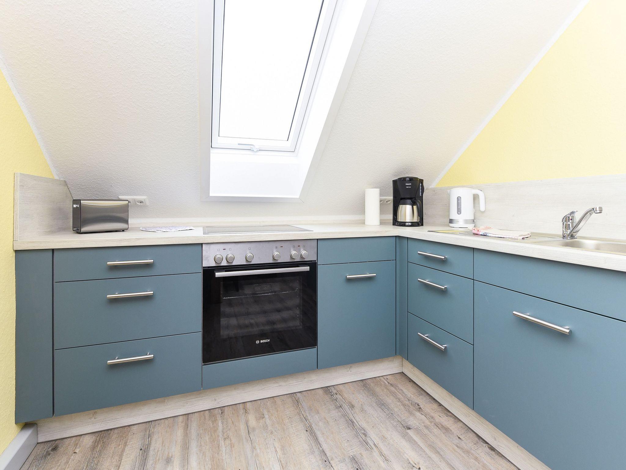 Größe ca. 50 Quadratmeter, Wohnzimmer, Küche, Schlafzimmer, zweites separates Schlafzimmer/Kinderzimmer, Badezimmer mit Dusche, Waschtisch und WC, Obergeschoss, optimal für 2 bis 3 Personen und zusätzlich ein Kleinkind.