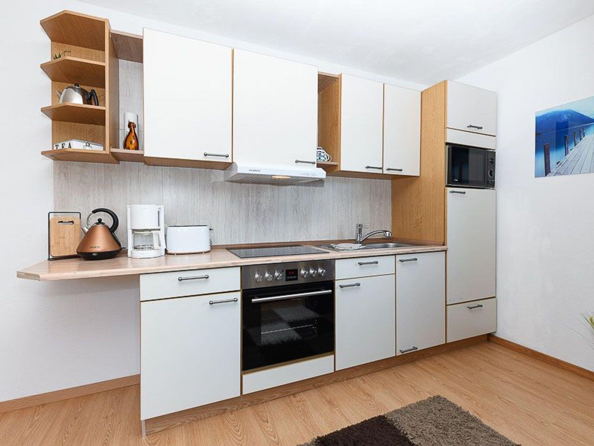 Größe ca. 40 Quadratmeter, Wohnzimmer mit integrierter Küche, Schlafzimmer, Badezimmer mit Dusche, Waschtisch und WC, Obergeschoss, Balkon, optimal für 1 bis 2 Personen und zusätzlich ein Kleinkind.