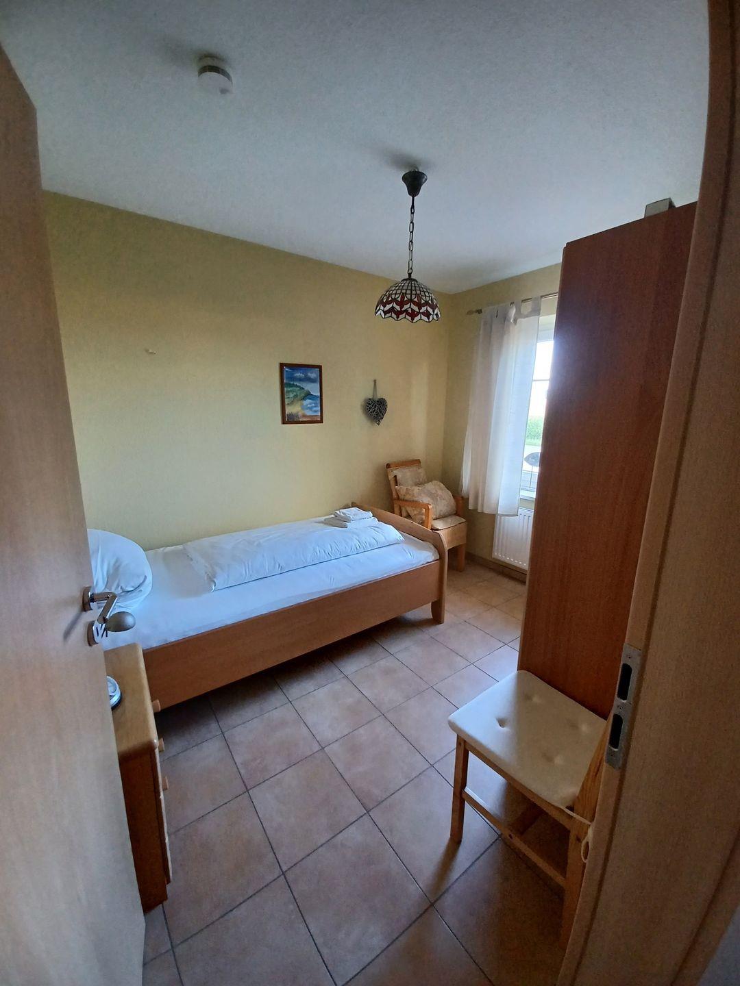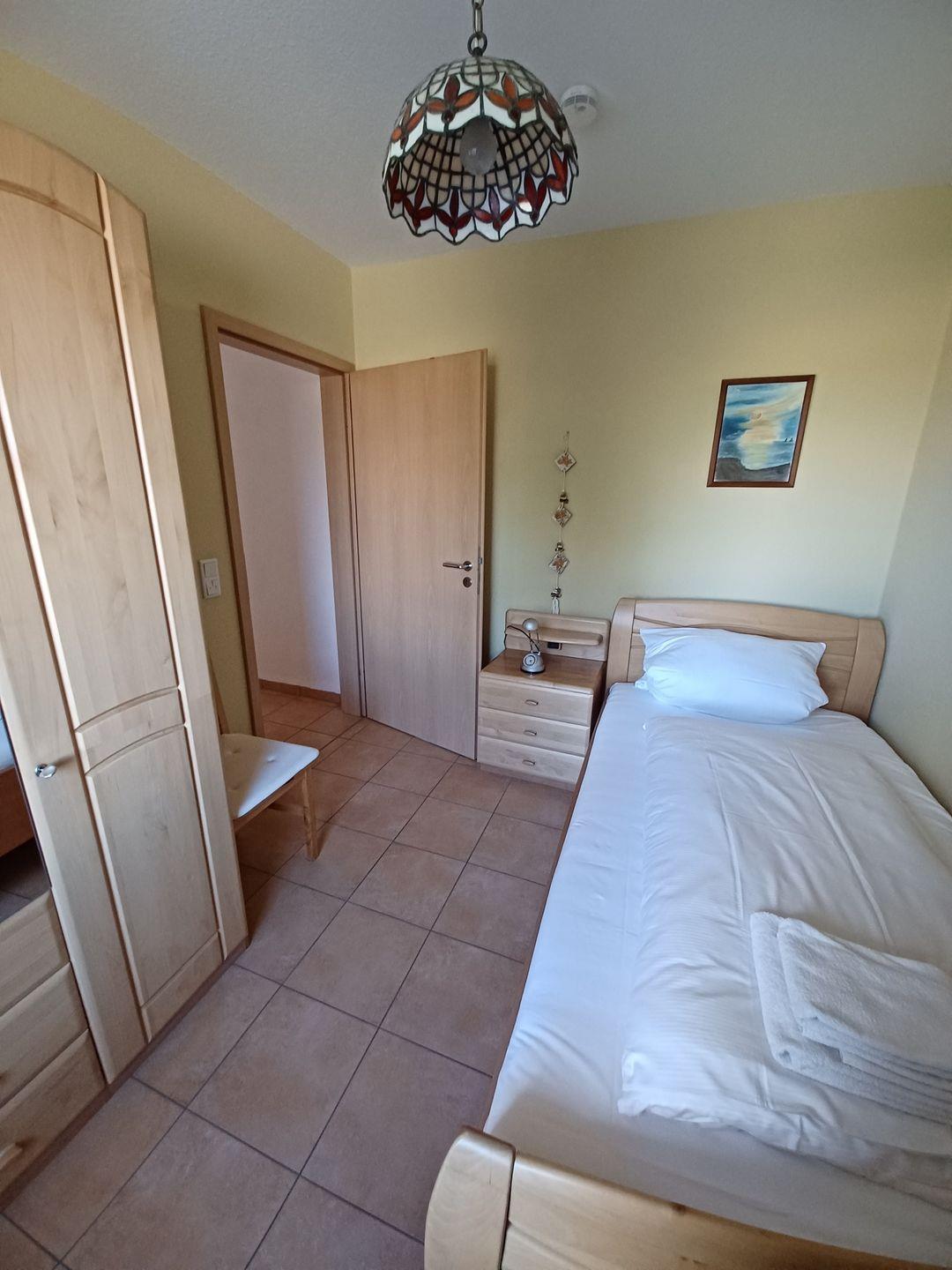 Eines der drei Schlafzimmer verfügt über ein Doppelbett (180 × 200 cm), ein weiteres über zwei Einzelbetten (je 90 × 200 cm) und das dritte über ein extrabreites Einzelbett (100 × 200 cm).