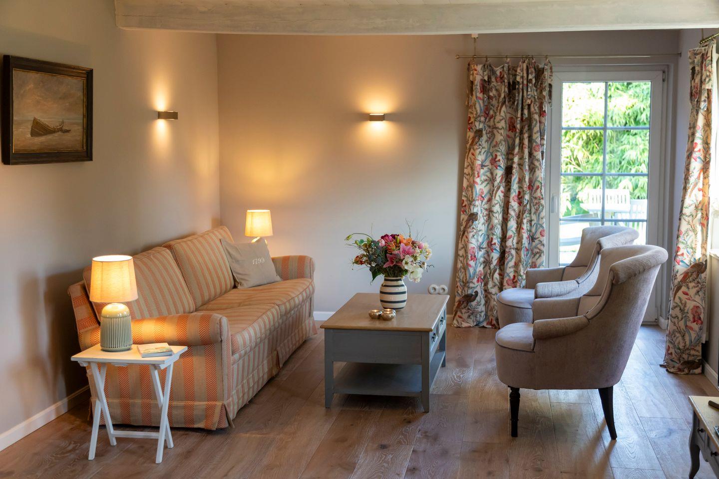 Eine der Haushälften verfügt über ca. 124 m² Wohnfläche. Das gemütlich eingerichtete Wohn- und Esszimmer bietet Dir direkten Zugang zur Südterrasse, von der aus sich ein wunderbarer Blick über die angrenzenden Felder eröffnet. Der großzügige Südgarten steht Dir exklusiv zur Verfügung und lädt mit Grill und Sitzmöglichkeiten zu entspannten Stunden im Freien ein. An kühleren Tagen sorgt ein dänischer Kamin für eine hyggelige Atmosphäre, während Du Deine Lieblingsserien auf dem Flachbildfernseher streamen kannst.