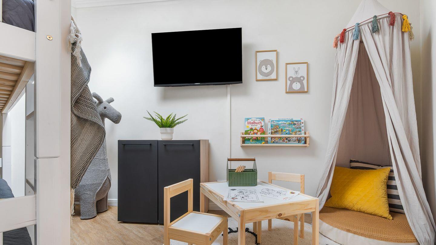 Das Kinderzimmer ist liebevoll eingerichtet und bietet den Kleinen genügend Platz zum Spielen und Träumen. Außerdem stellen wir gerne ein Kinderbett und einen Hochstuhl zur Verfügung, um euren Aufenthalt so angenehm wie möglich zu gestalten.