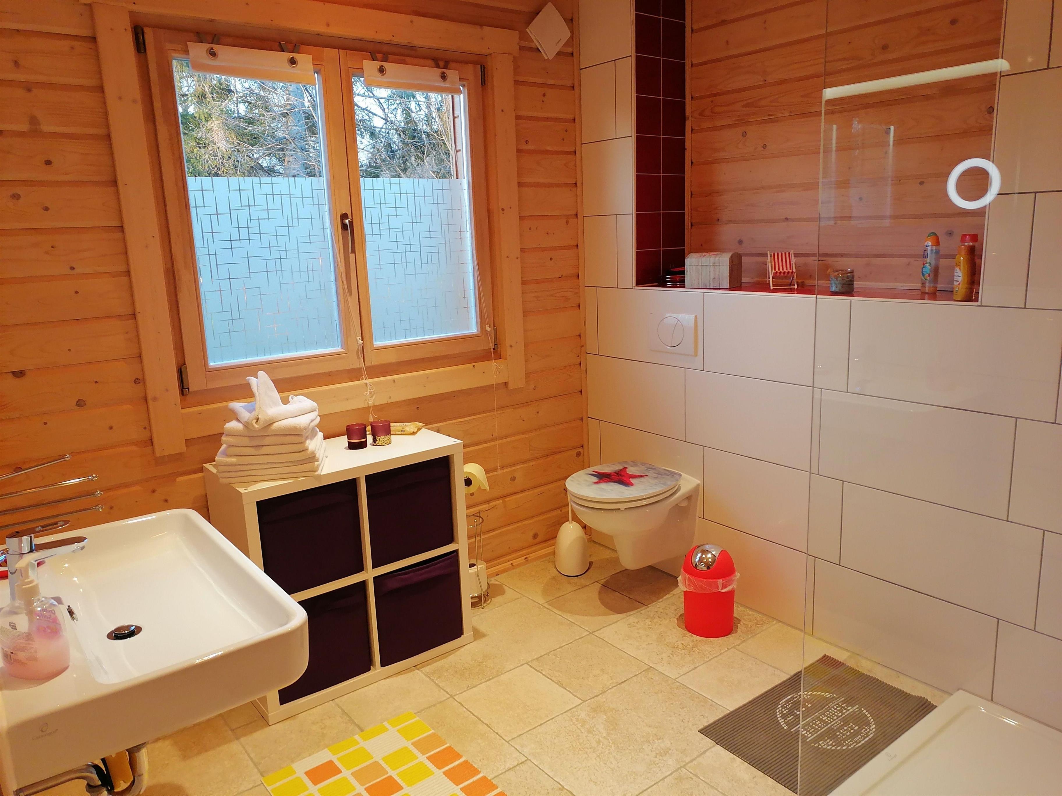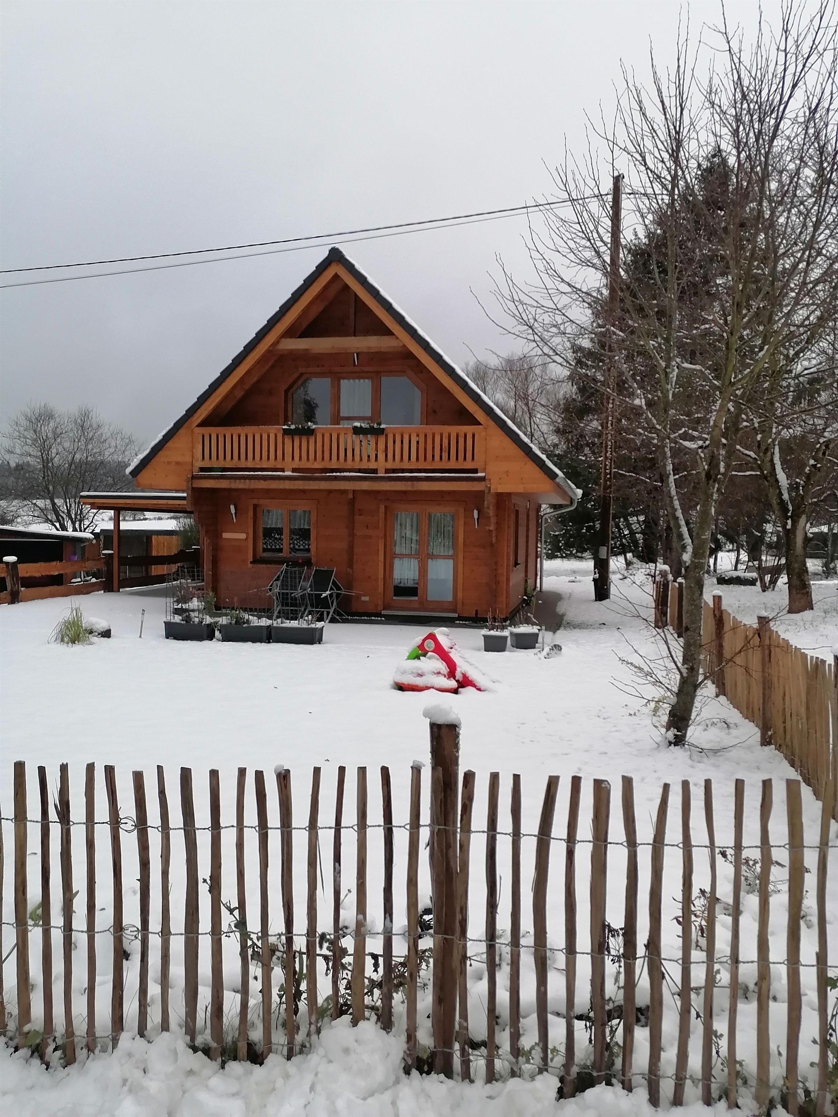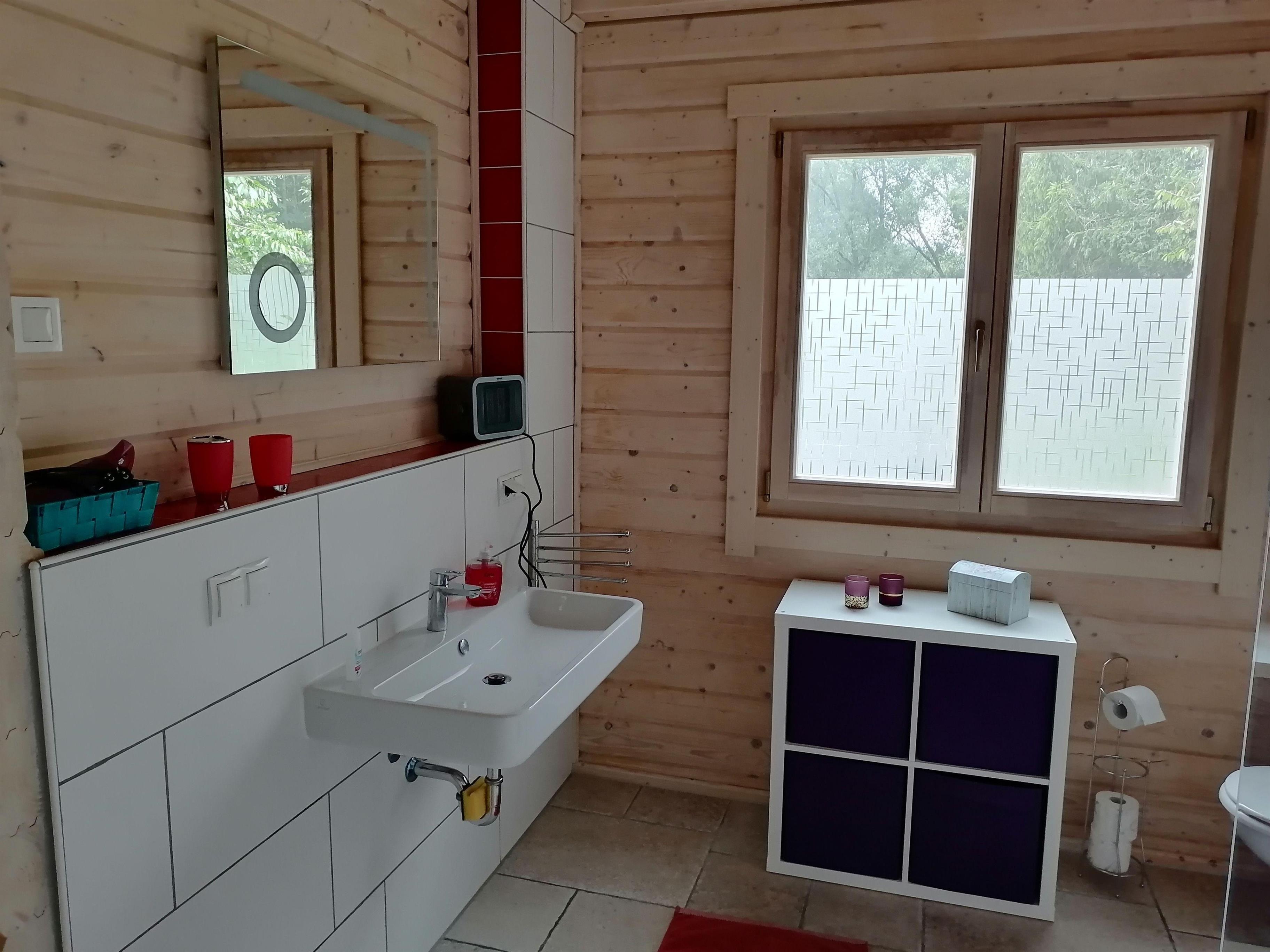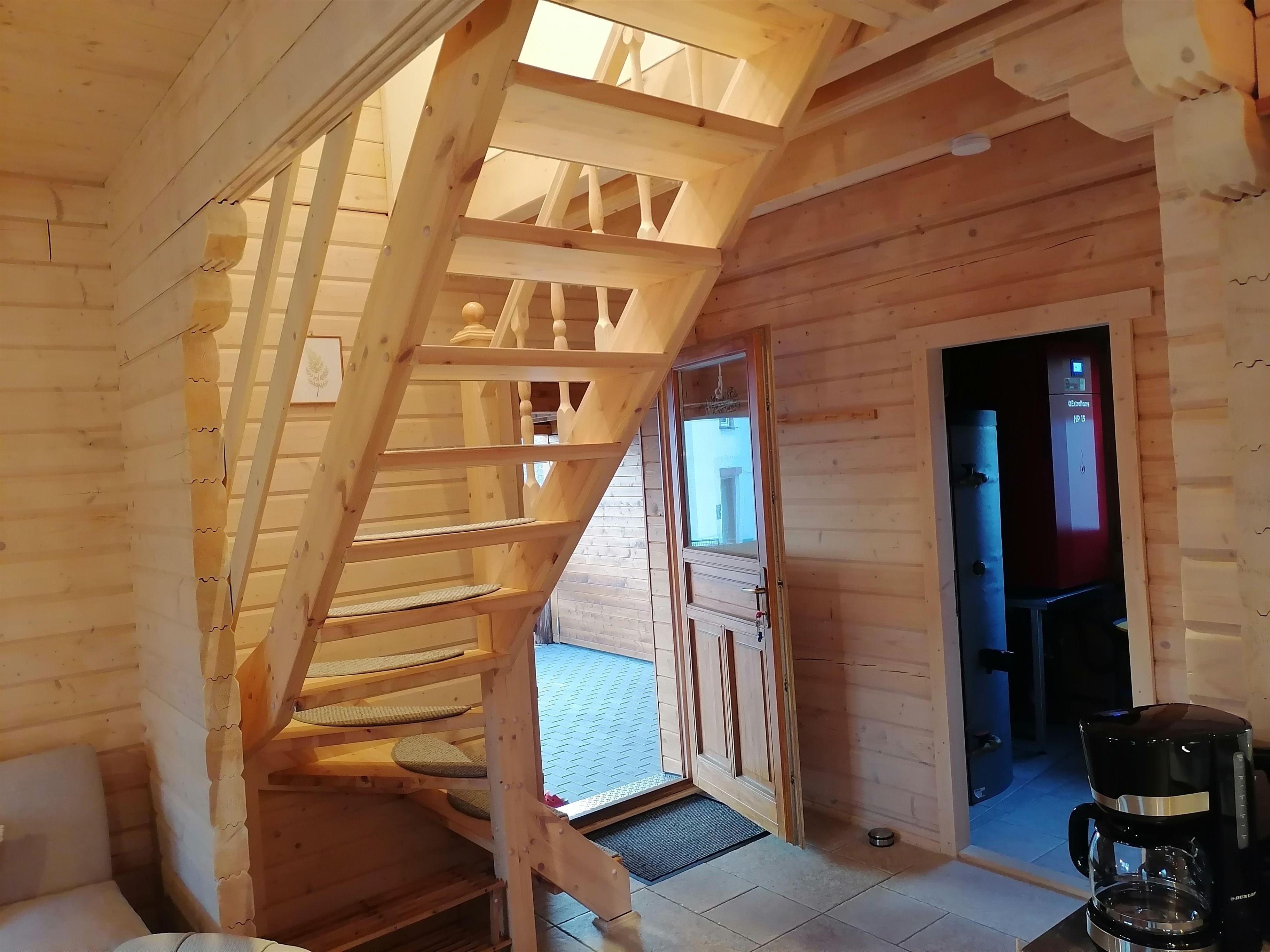 Blockbohlenhaus auf 2 Ebenen. Wohnküche mit Essbereich, 2 Schlafräume, 2 Bäder, Abstellraum, Terrasse, Balkon, Garten, Whirlpool, Carport, TV, Waschmaschine, Radio mit CD, W-Lan.