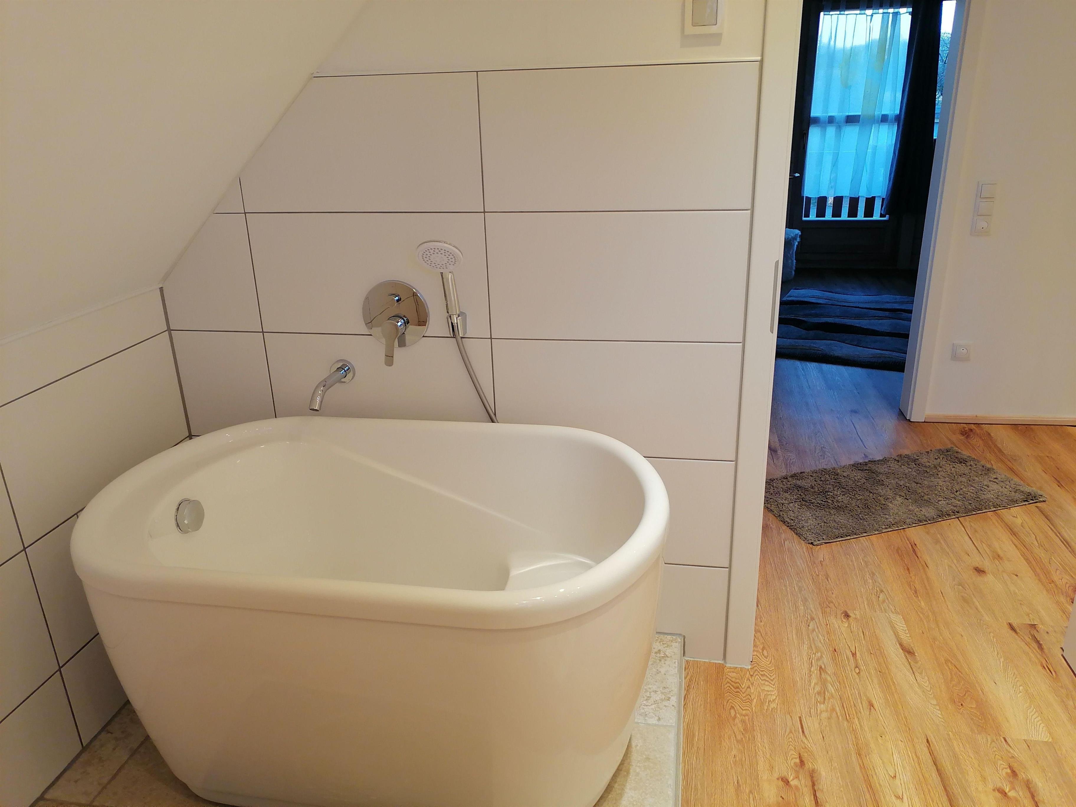 Oben ein Schlafzimmer mit Doppelbett und Balkon, ein Kinderzimmer mit 2 Einzelbetten und ein schönes Bad mit Sitzbadewanne.
