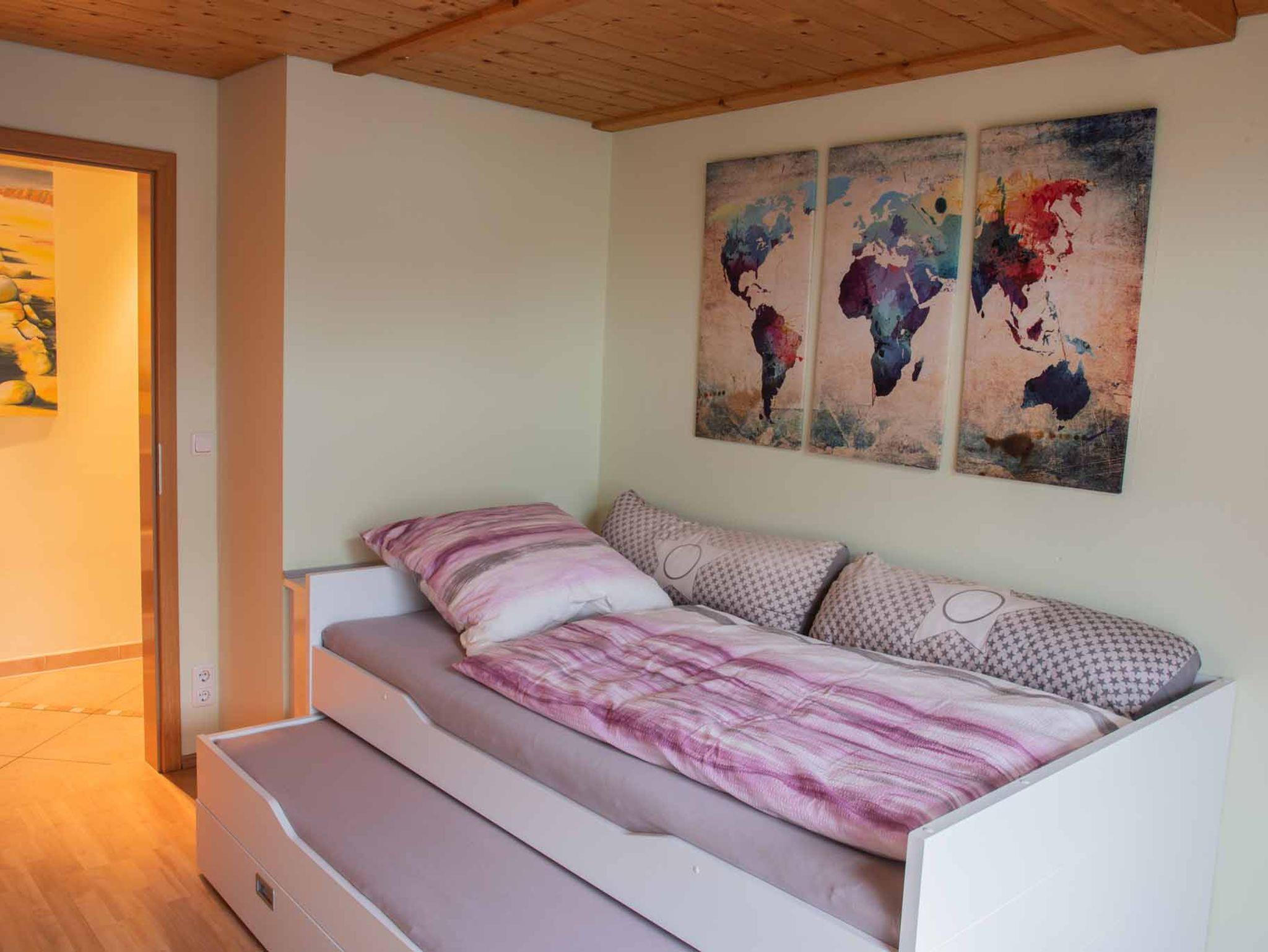 2 Schlafzimmer mit Doppelbetten, ein Zimmer mit Panoramafenster und Einzelbett mit Ausziehbett, jeweils mit kompletter Wäscheausstattung stehen Ihnen zur Verfügung.