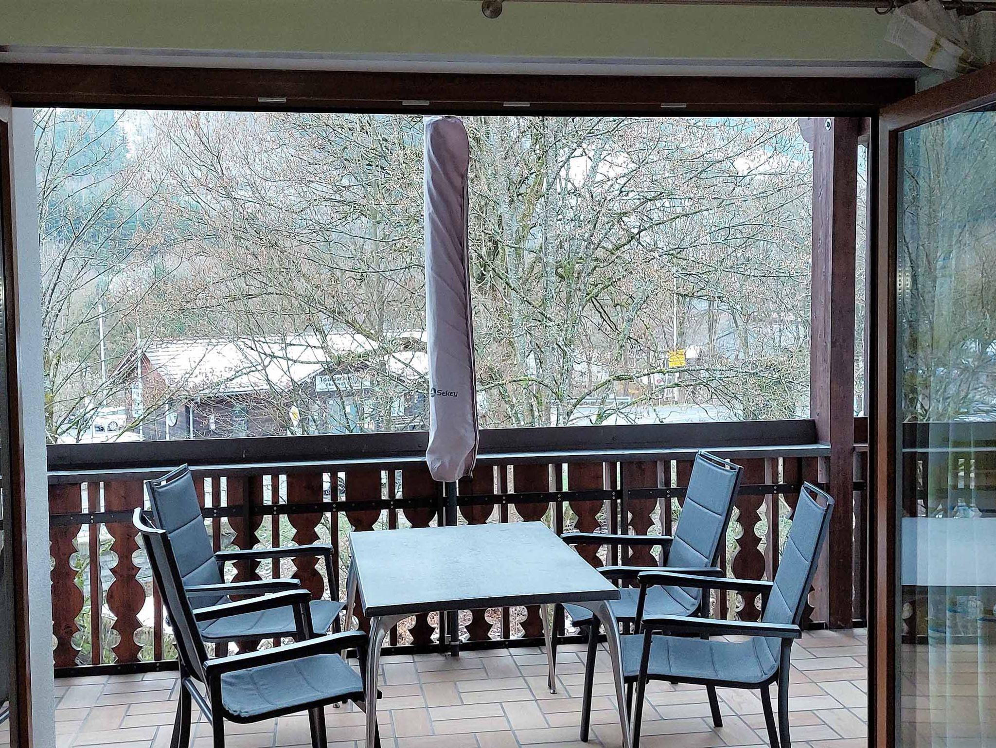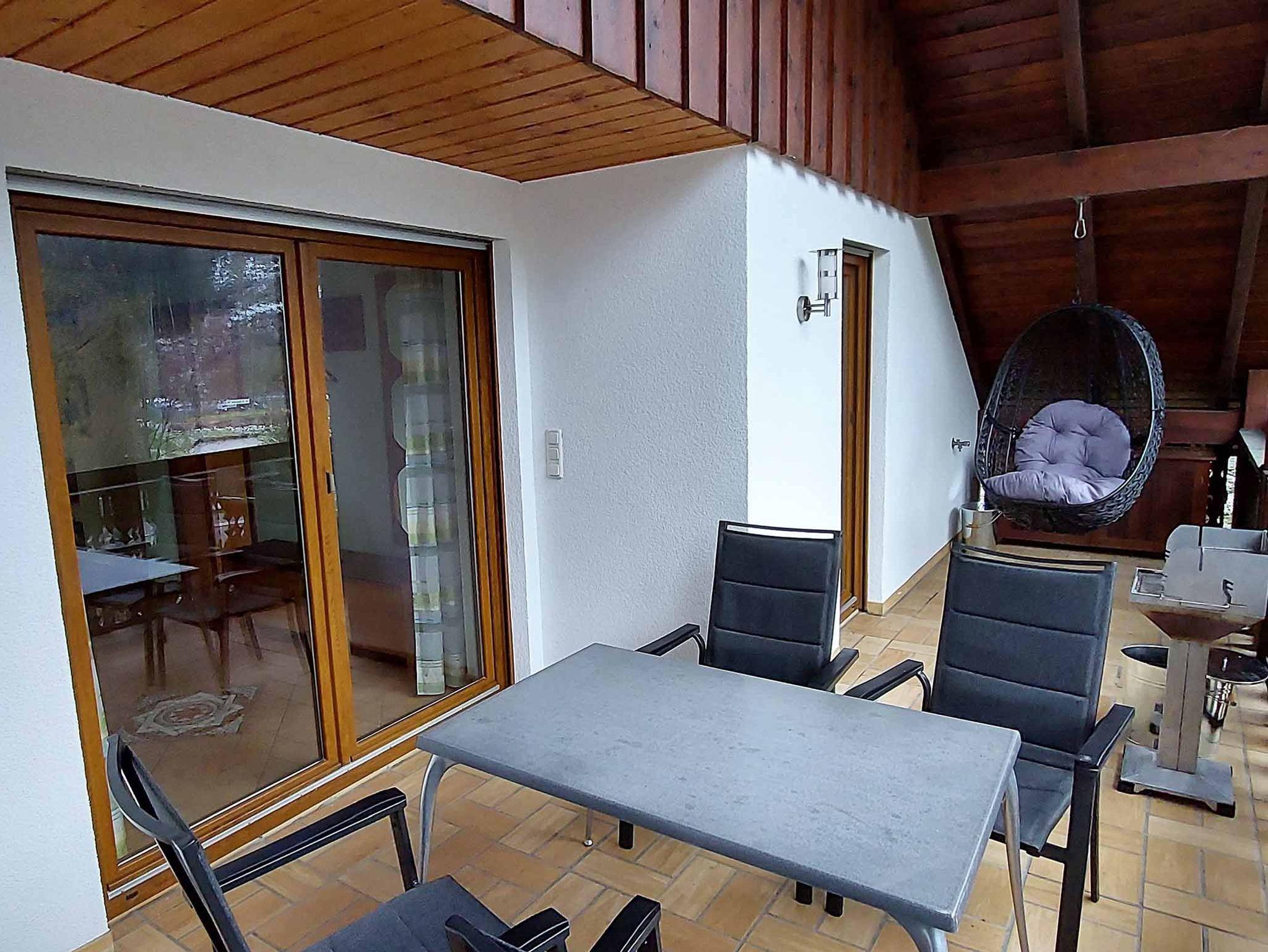 Der geräumige, überdachte Balkon ist mit Tisch und Stühlen, Sonnenschirm und Hängesessel ausgestattet.