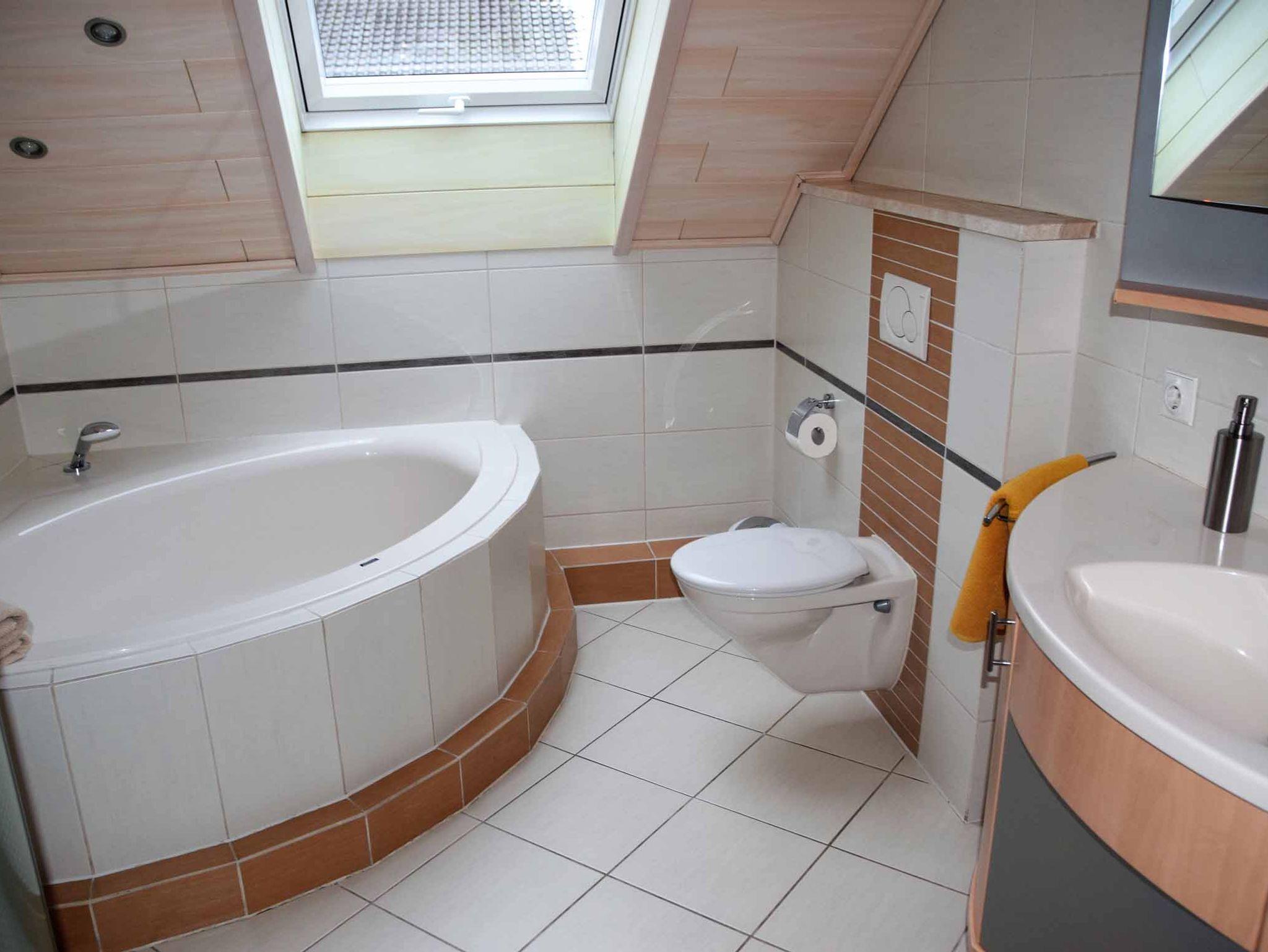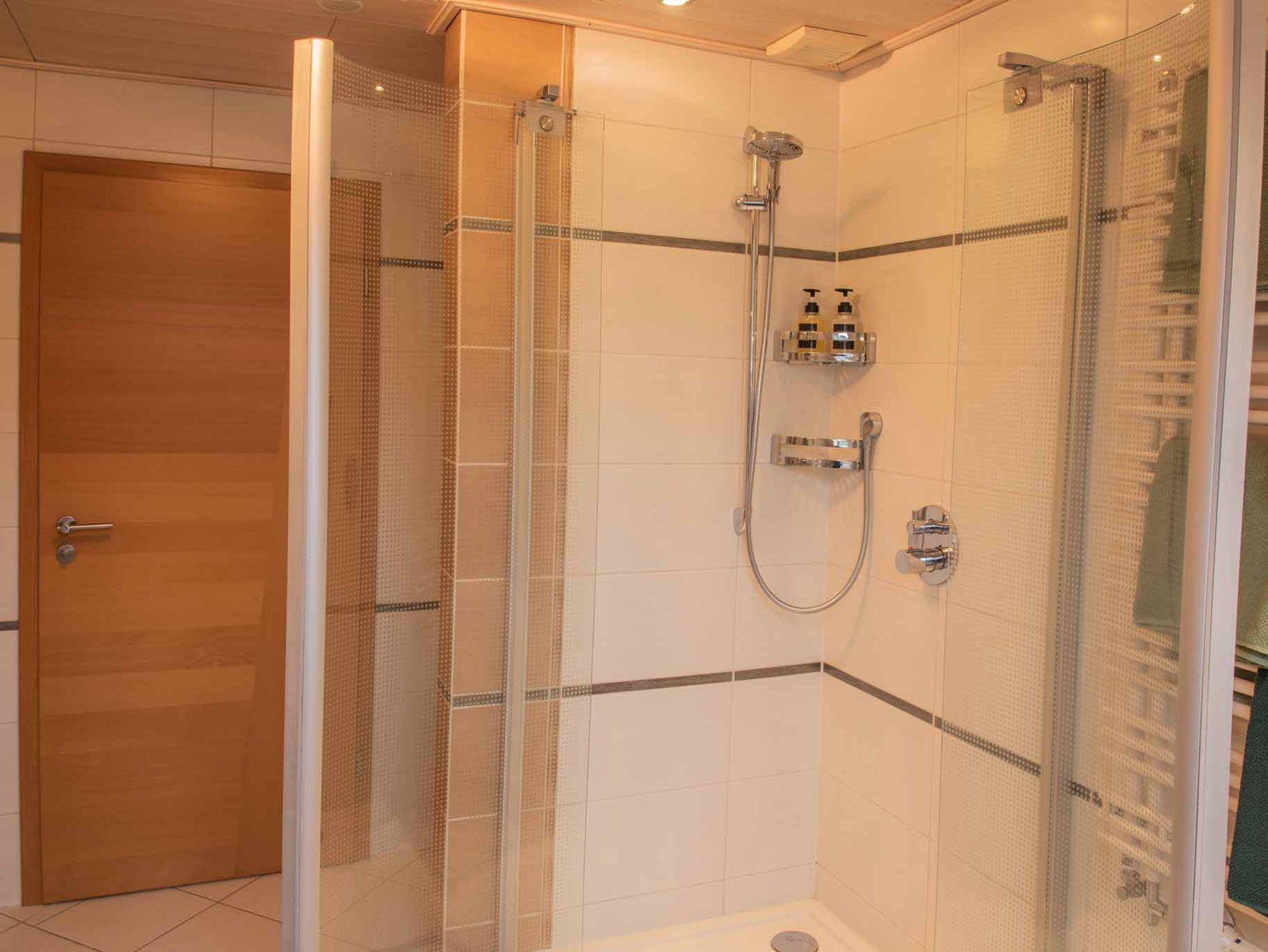 Es gibt ein modernes Bad mit Dusche und Badewanne, WC, Föhn inkl. Dusch- und Handtücher, Shampoo, Seife, Toilettenpapier und Zahnpflegeartikel. Außerdem ist ein separates WC in der Wohnung integriert.