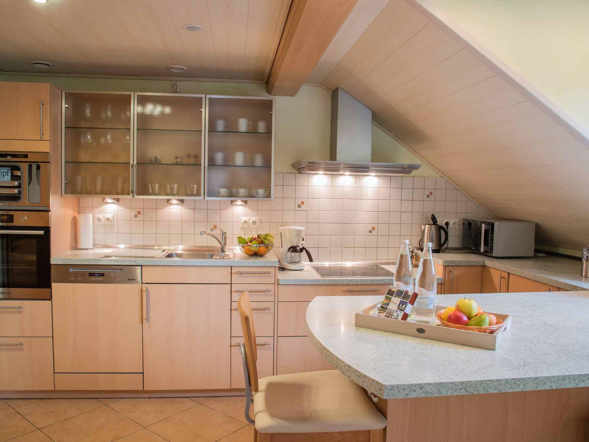 Die Einbauküche mit Essplatz ist voll ausgestattet mit ausreichend Geschirr und Besteck, zahlreiche Küchenutensilien (Töpfe, Schüsseln, Auflaufformen), Geschirrspülmaschine inkl. Tabs, Dampfgarer, Mikrowelle, Kühl-Gefrierkombination, Backofen, 4 Platten Herd, Toaster, Wasserkocher, Allesschneider, Kaffeemaschine mit Kaffee, Teeauswahl, Geschirrtücher, Spülmittel, Küchenrolle und Gewürzen.