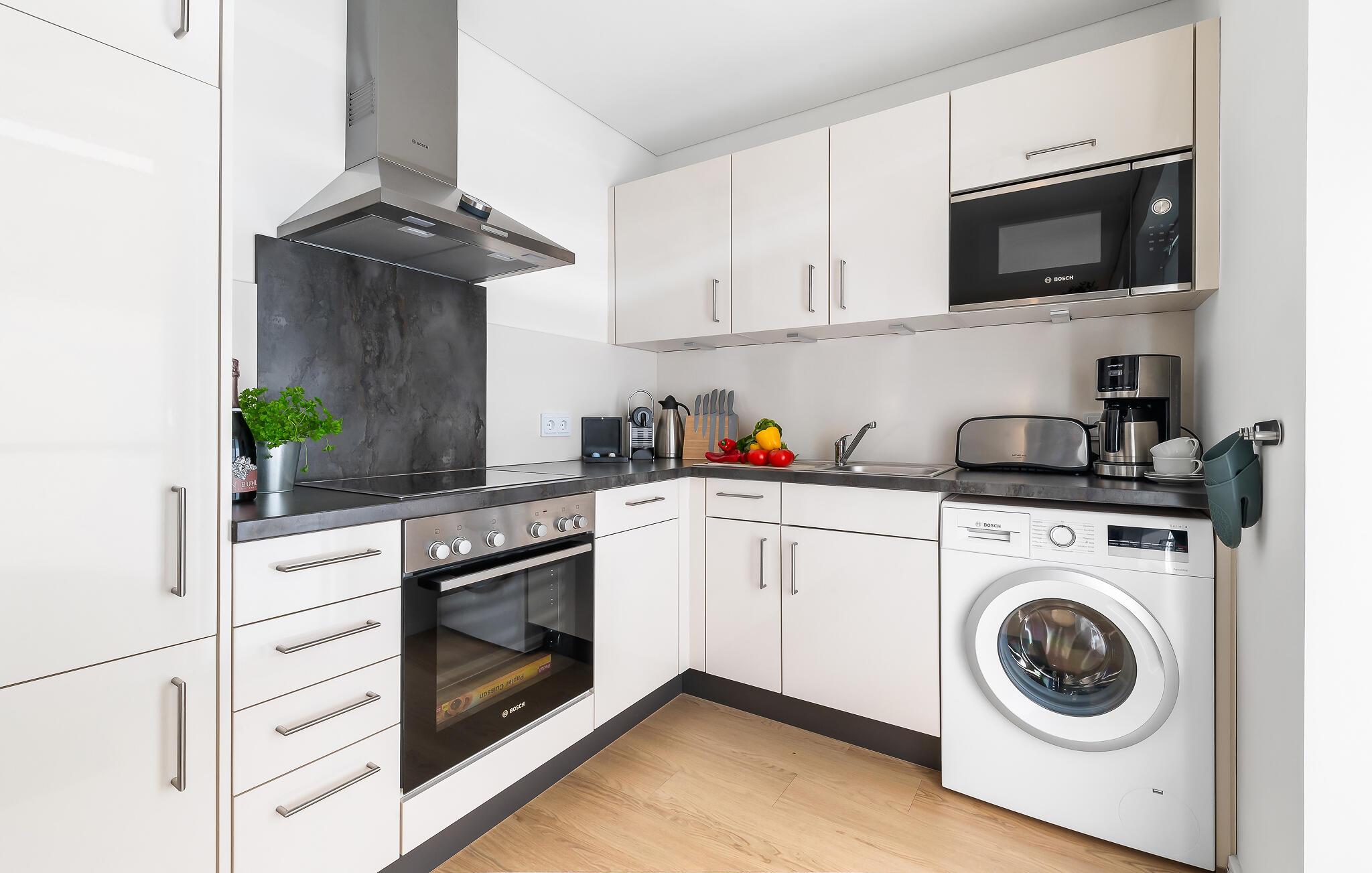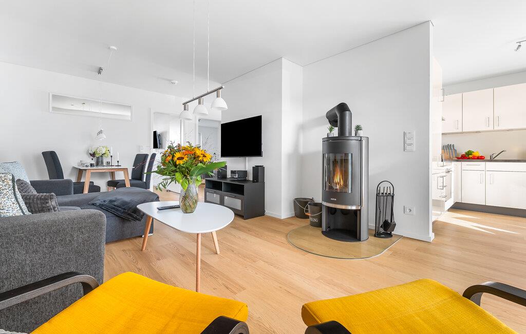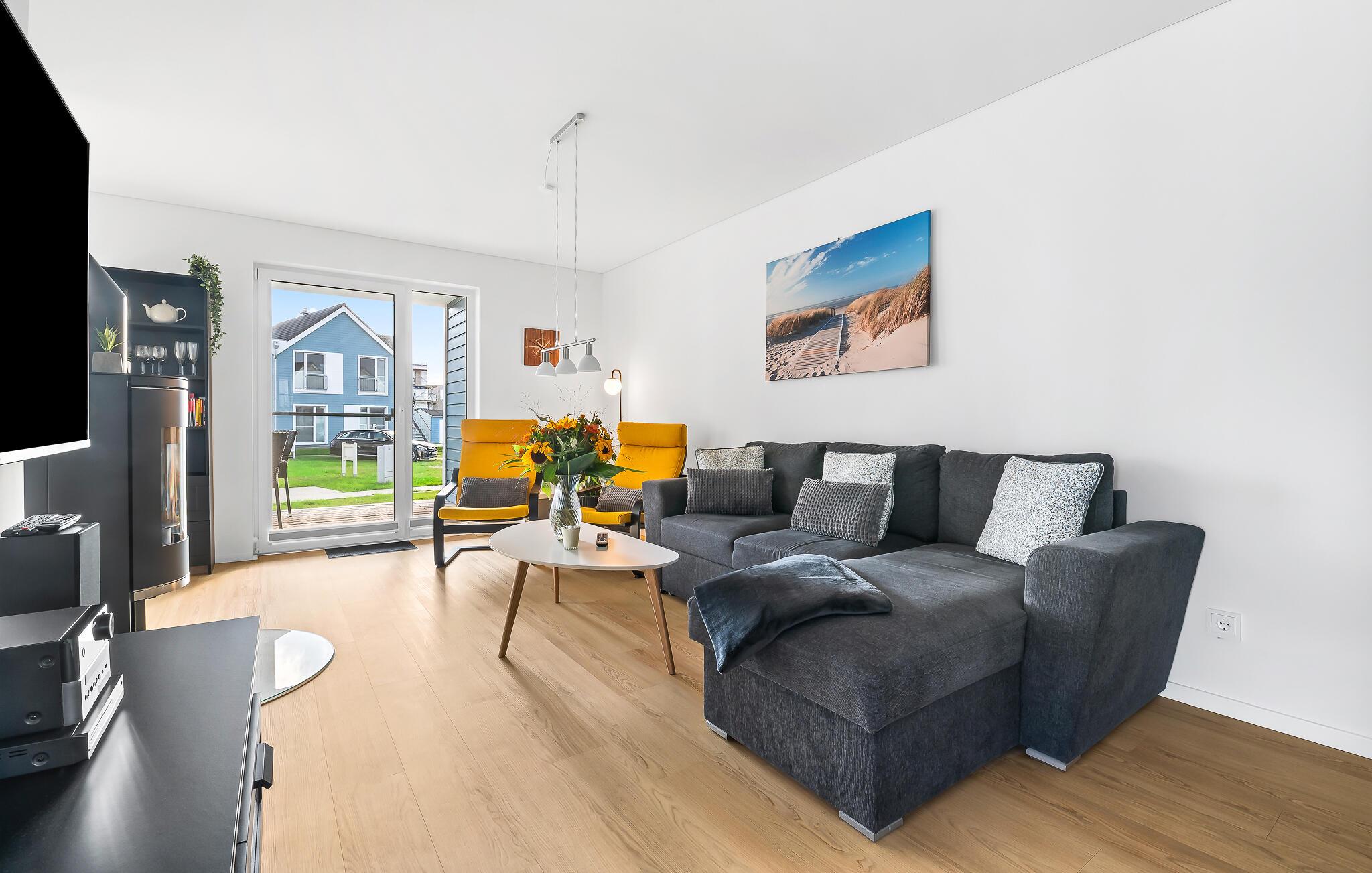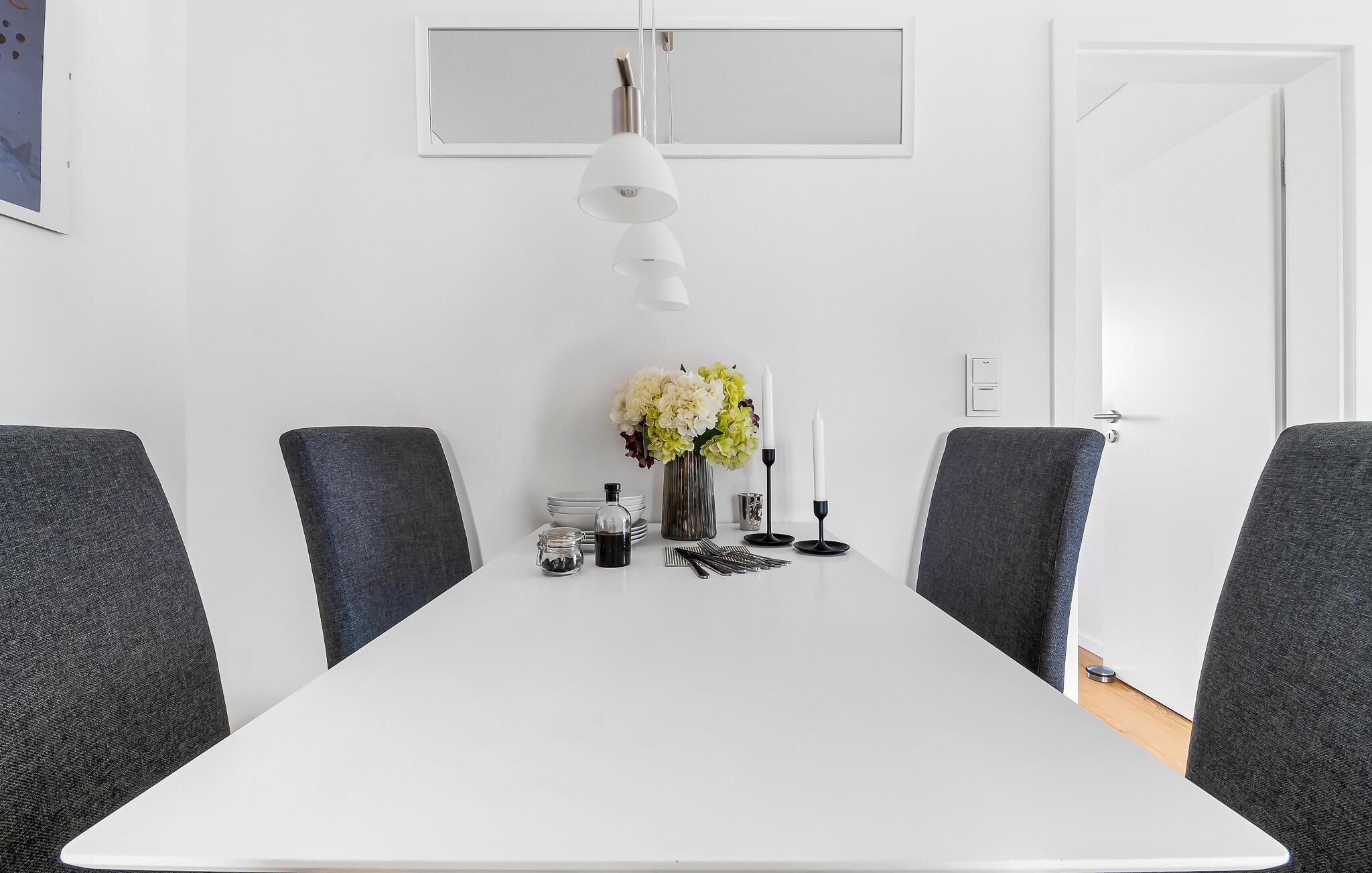 Leiligheten er innredet med høy standard i skandinavisk stil. I stuen kan du slappe av i den koselige L-sofaen med sjeselong eller lage deilige måltider i det åpne kjøkkenet av høy kvalitet. Hva med en lekestund sammen? En samling av spill er tilgjengelig. Det er også to svingende lenestoler for en avslappende tur i stjernehavet eller for koselig lesing, inkludert en liten boksamling.
