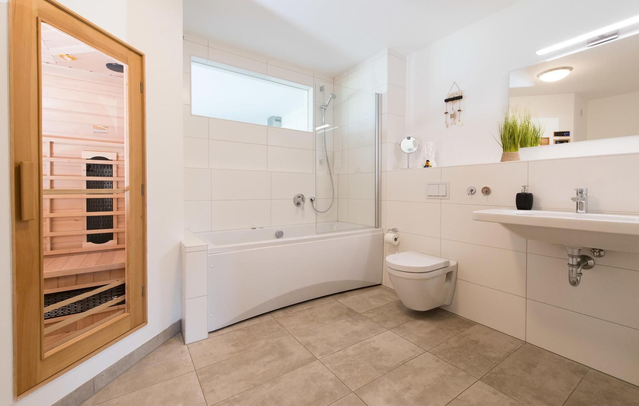 Det romslige badet med velværefaktor har boblebad og badstue (infrarød kabin).