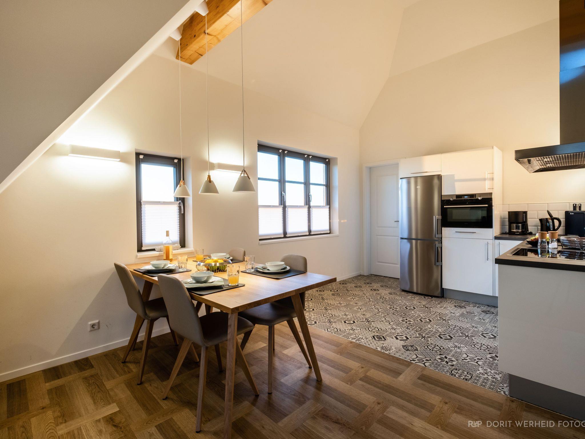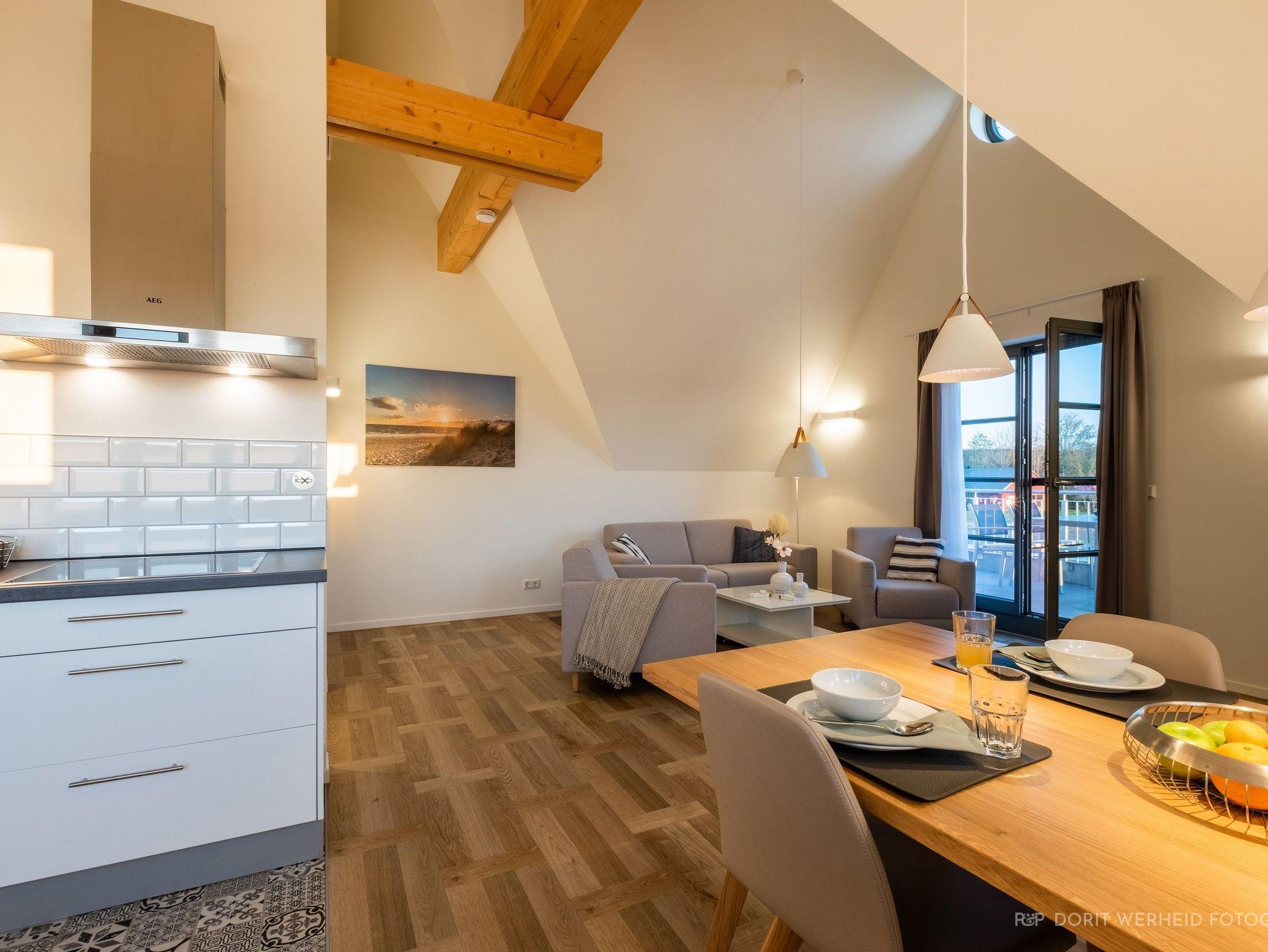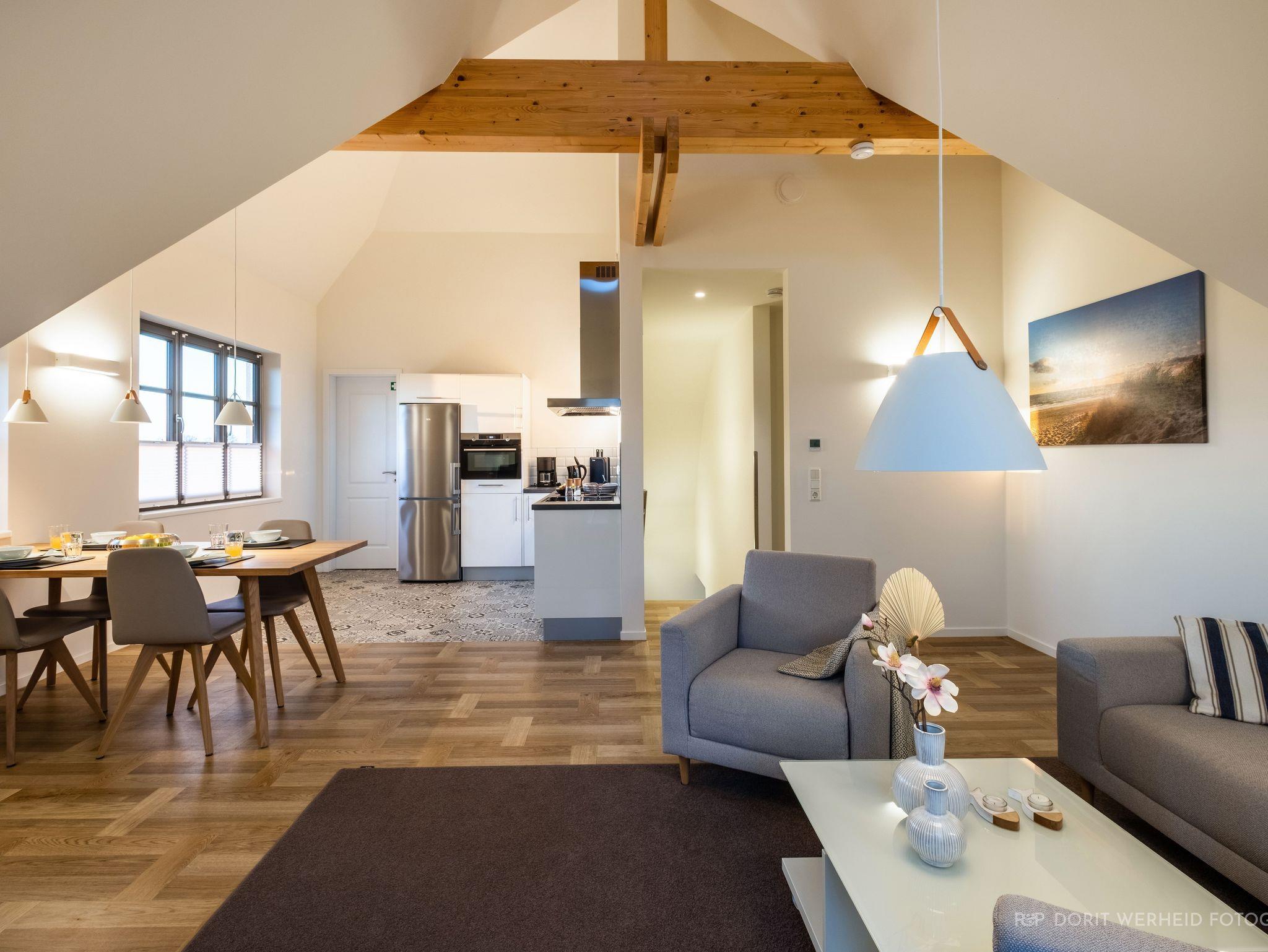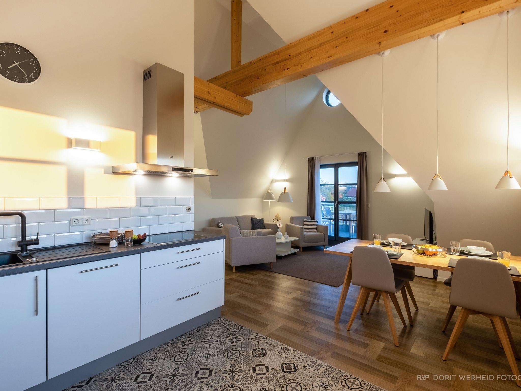 Die Wohnung hat W-LAN und LAN und ist hochwertig ausgestattet. Sie verfügt über eine komplett eingerichtete Einbauküche mit Spülmaschine, Mikrowelle, Toaster, Kaffeemaschine, Wasserkocher, Induktionsherd und großem Kühlraum mit separatem Gefrierabteil. Ebenfalls verfügt die Wohnung über eine Waschmaschine. Der Wohnraum ist durch die ca. vier Meter hohe offene Decke geprägt und die fast 12 qm große Dachterrasse mit Elektrogrill bietet einen weiten Blick über die Felder auf das Haff und das Wasser.