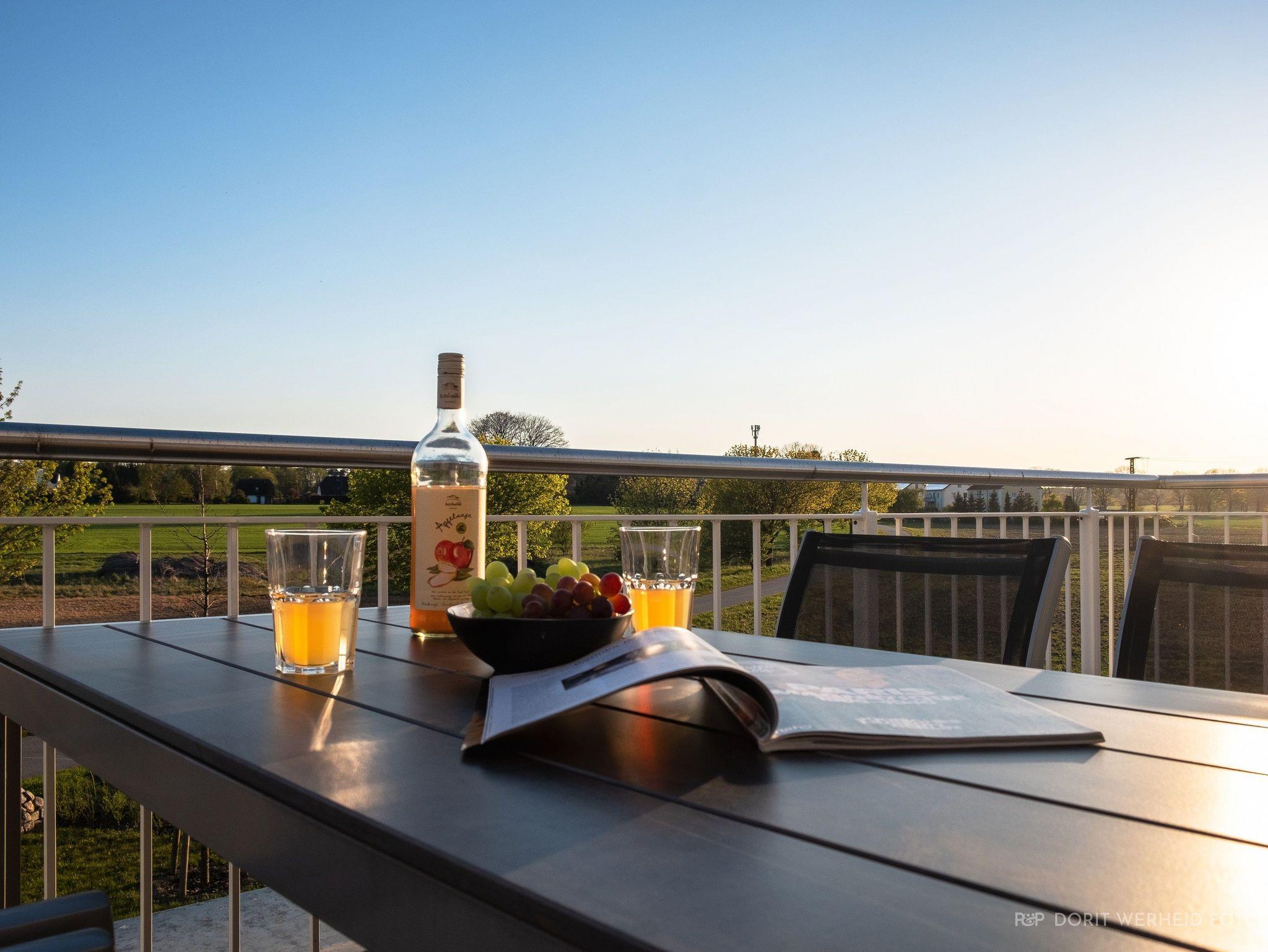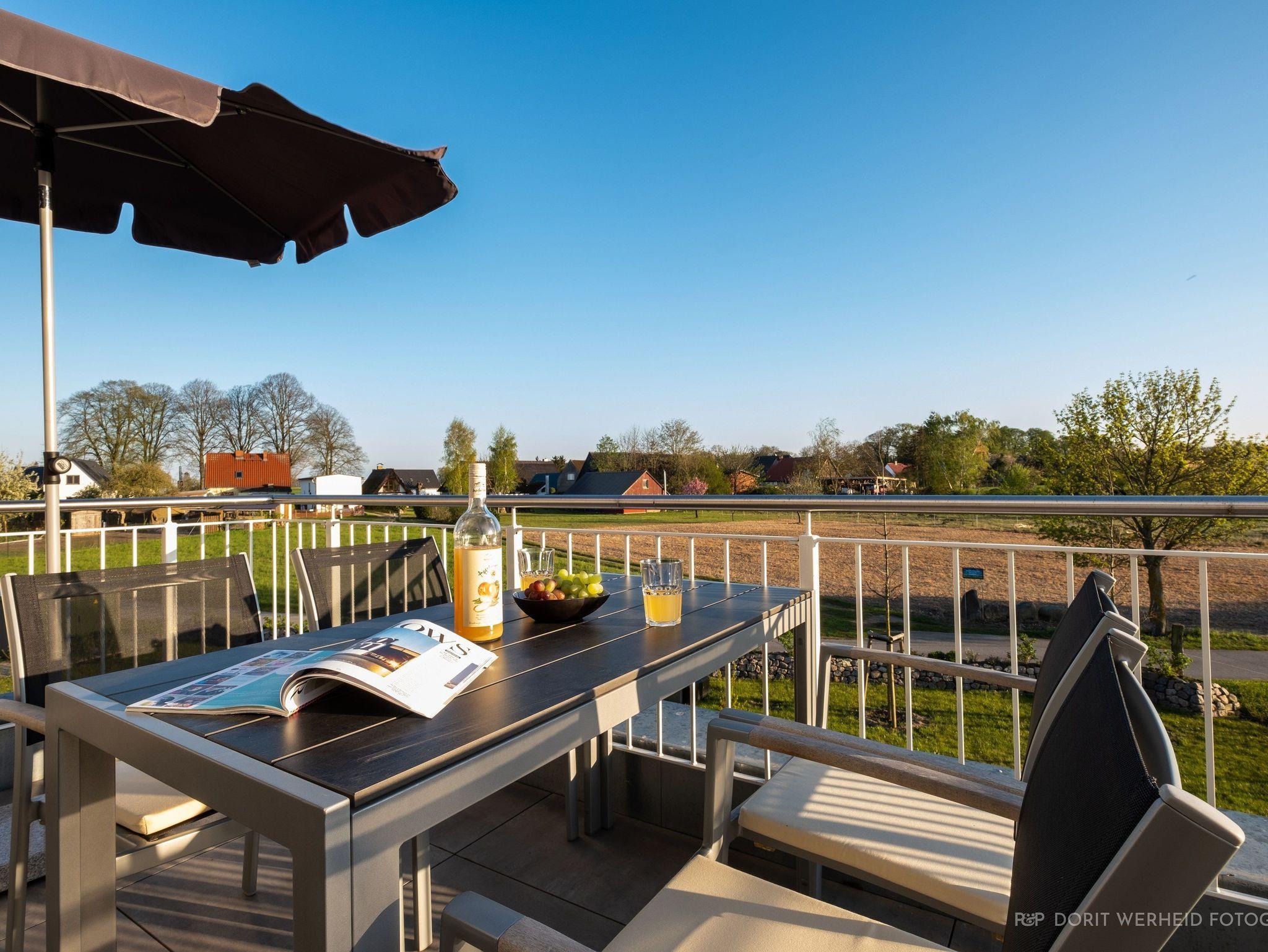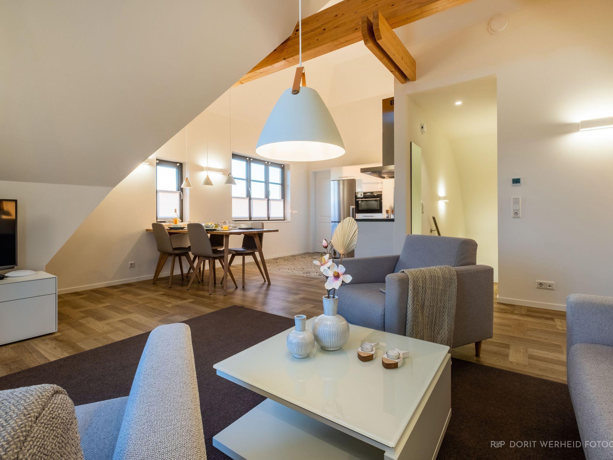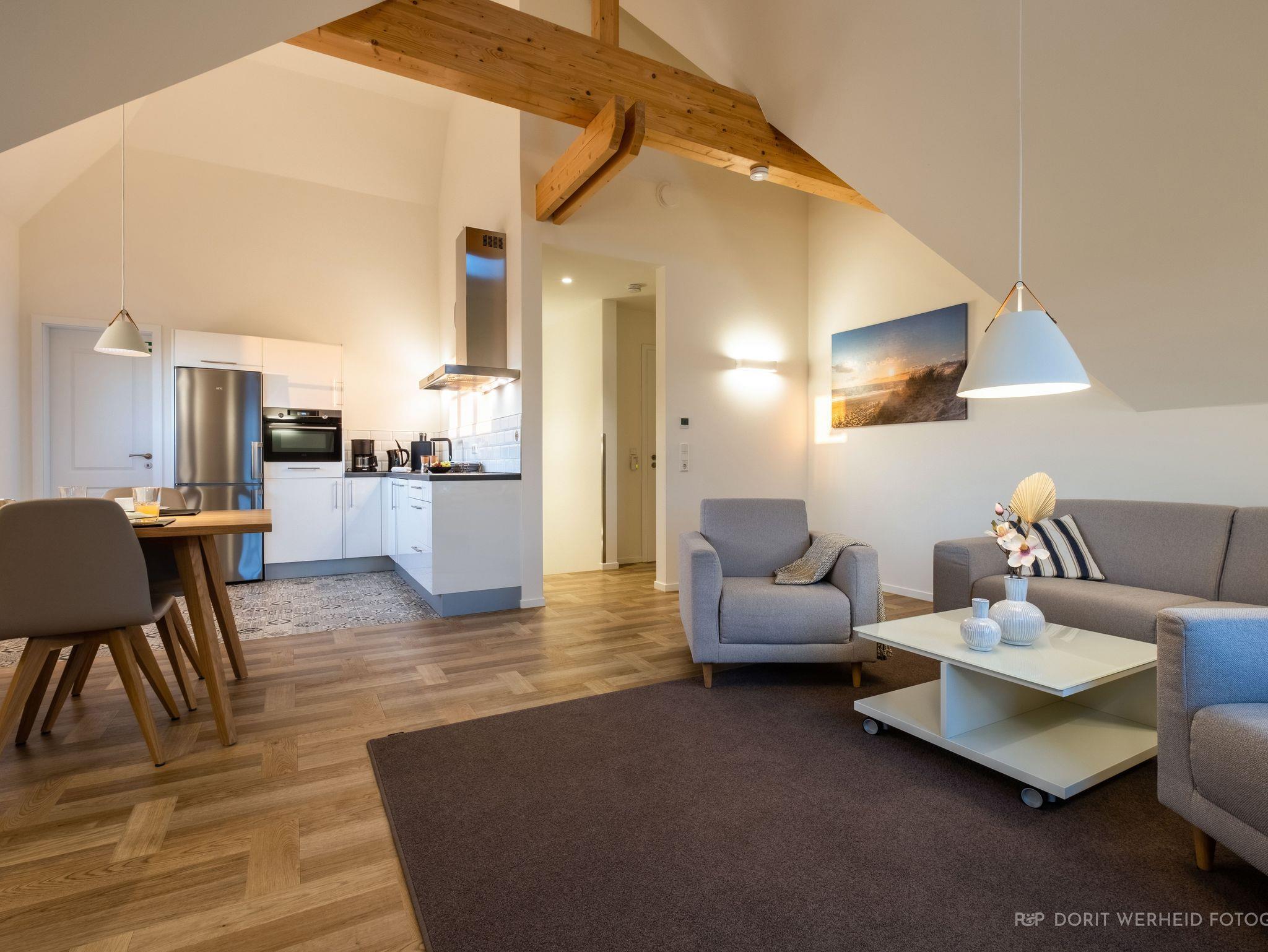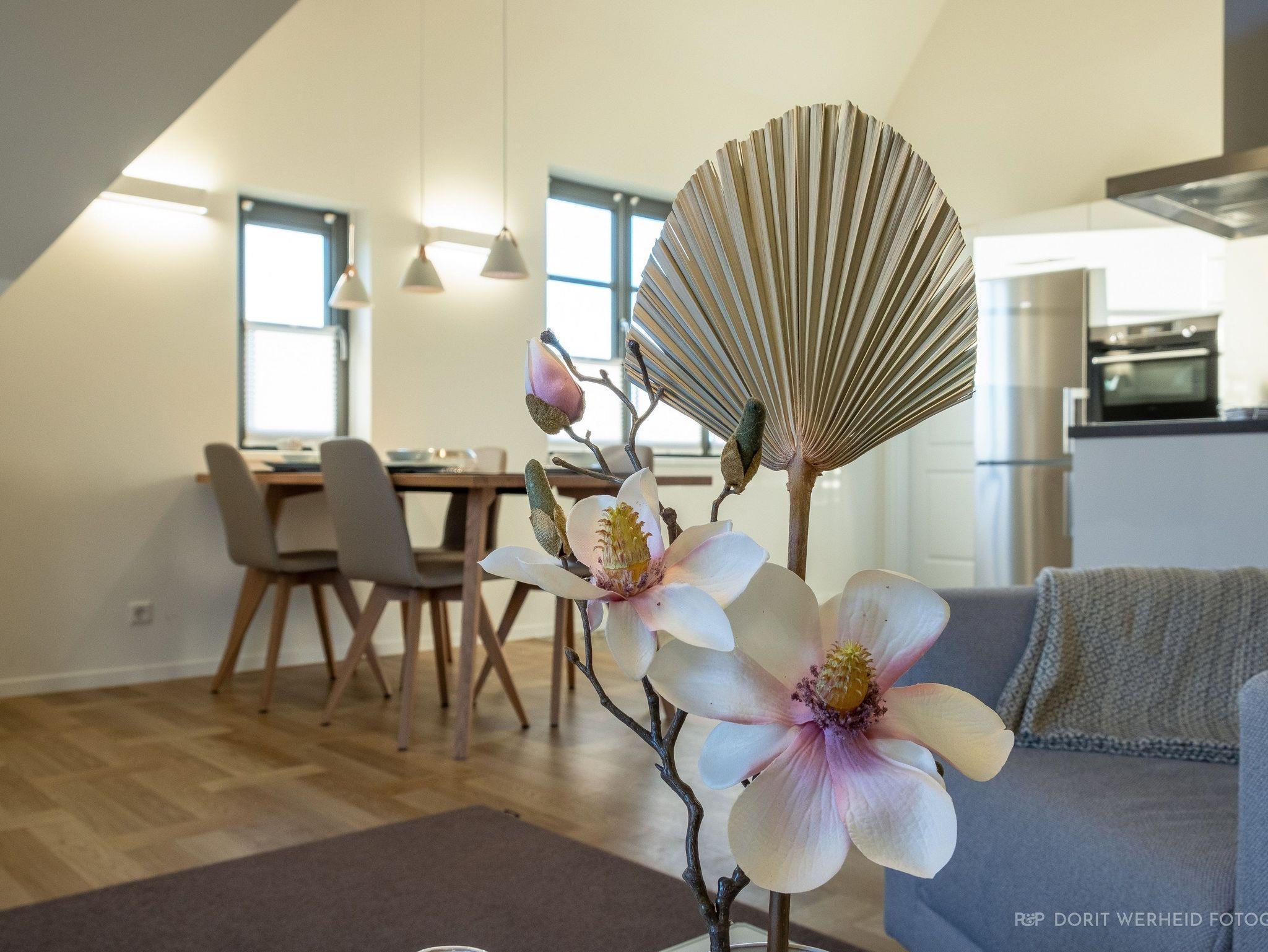 Die Wohnung hat W-LAN und LAN und ist hochwertig ausgestattet. Sie verfügt über eine komplett eingerichtete Einbauküche mit Spülmaschine, Mikrowelle, Toaster, Kaffeemaschine, Wasserkocher, Induktionsherd und großem Kühlraum mit separatem Gefrierabteil. Ebenfalls verfügt die Wohnung über eine Waschmaschine. Der Wohnraum ist durch die ca. vier Meter hohe offene Decke geprägt und die fast 12 qm große Dachterrasse mit Elektrogrill bietet einen weiten Blick über die Felder auf das Haff und das Wasser.