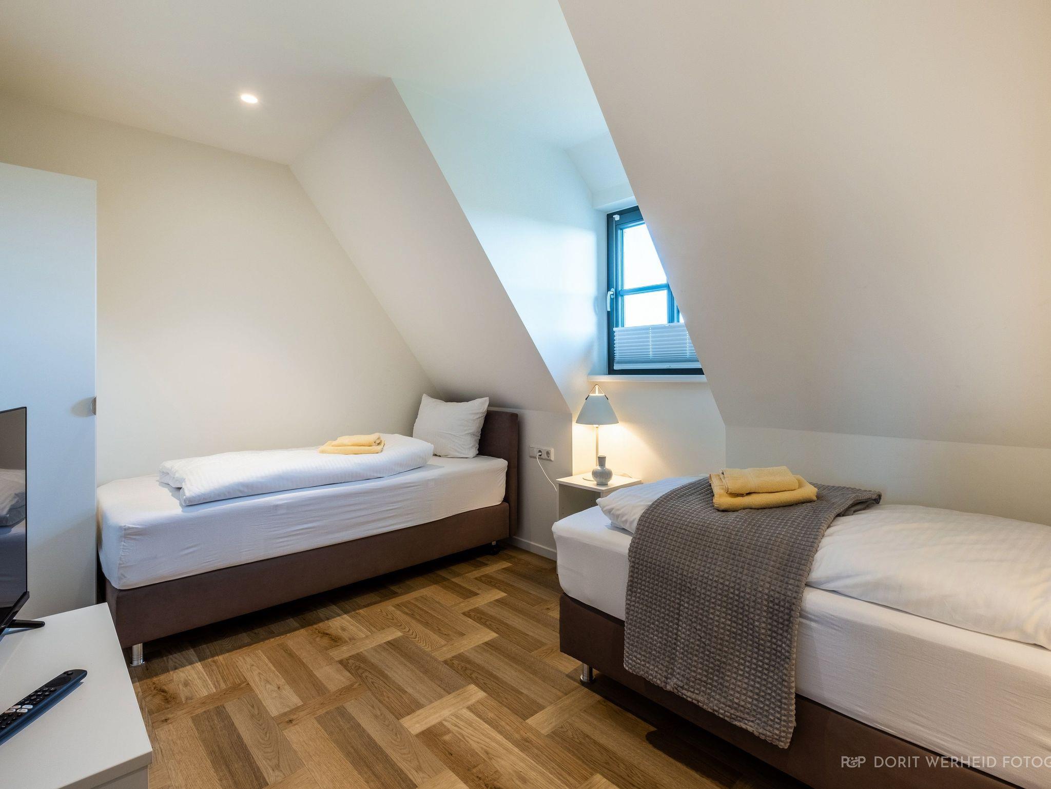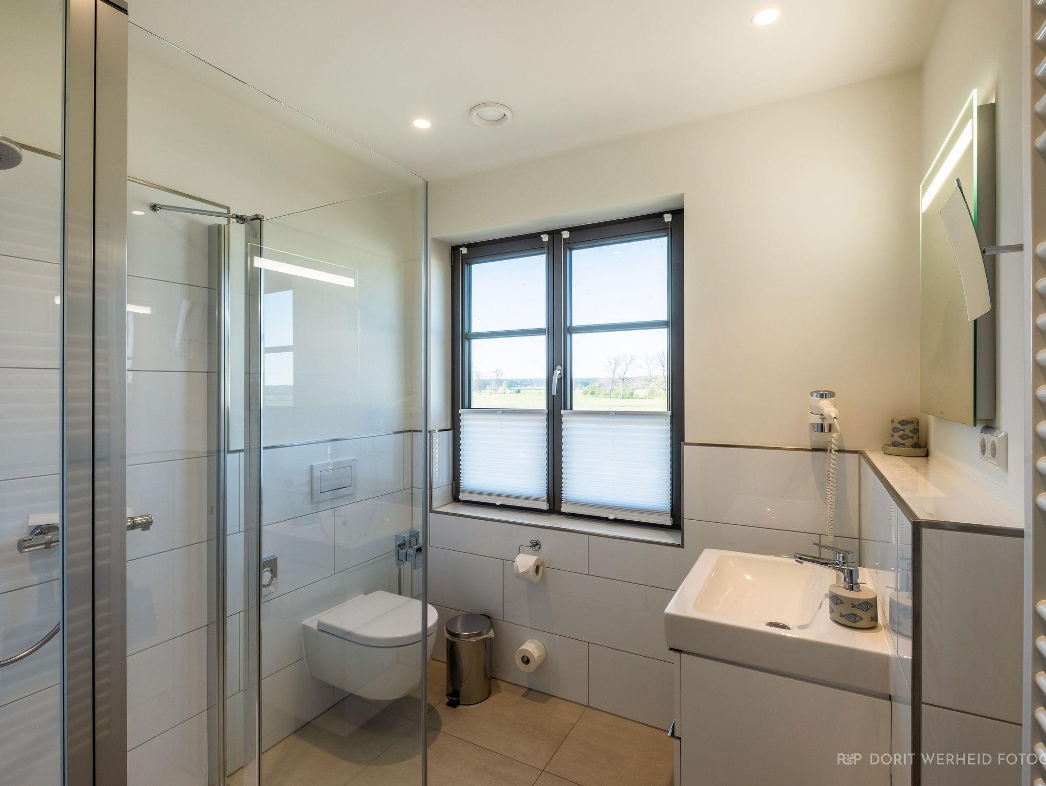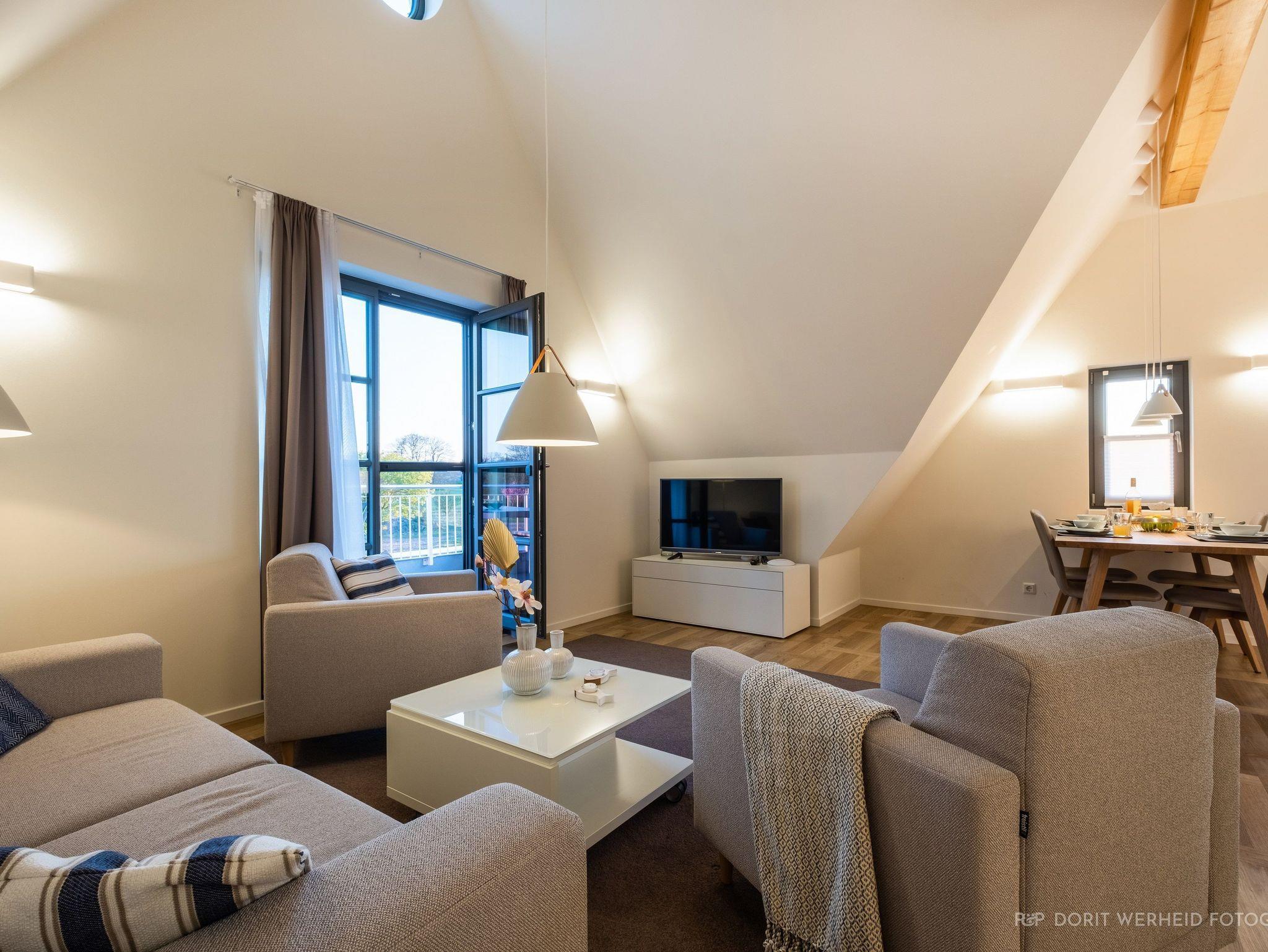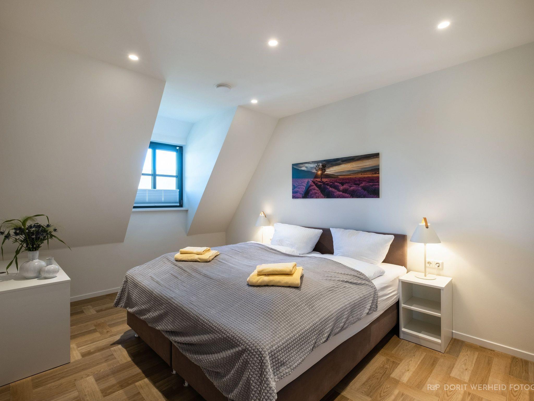 Das große Tageslichtbad ist mit einer bodentiefen Dusche mit Glasabtrennung ausgestattet. Das Hauptschlafzimmer verfügt über ein Doppelbett und das zweite Schlafzimmer über zwei Einzelbetten. Bei allen Betten handelt es sich um Boxspringbetten. Im Wohnzimmer sowie in einem der beiden Schlafzimmer befindet sich jeweils ein Flachbildschirm.