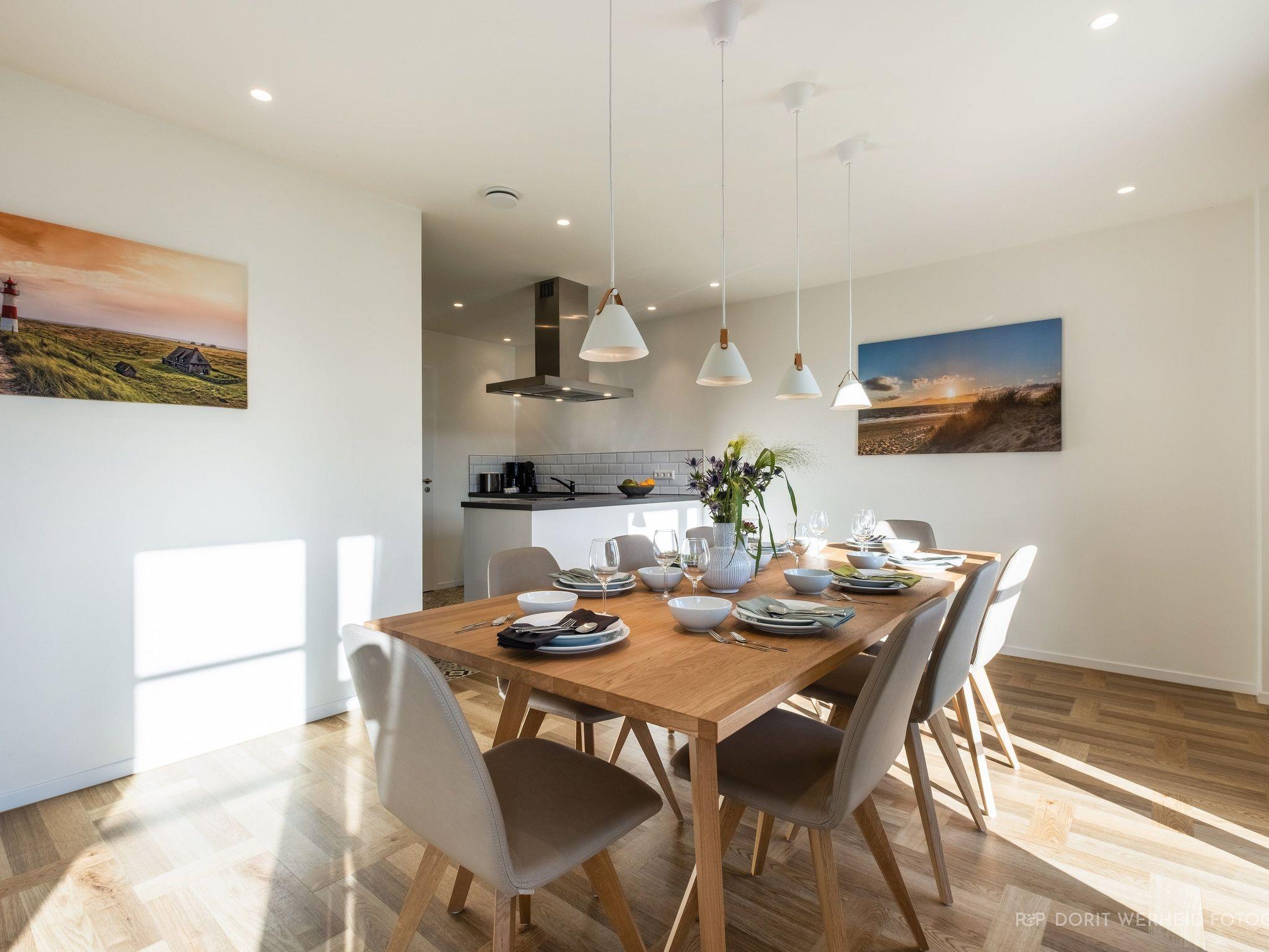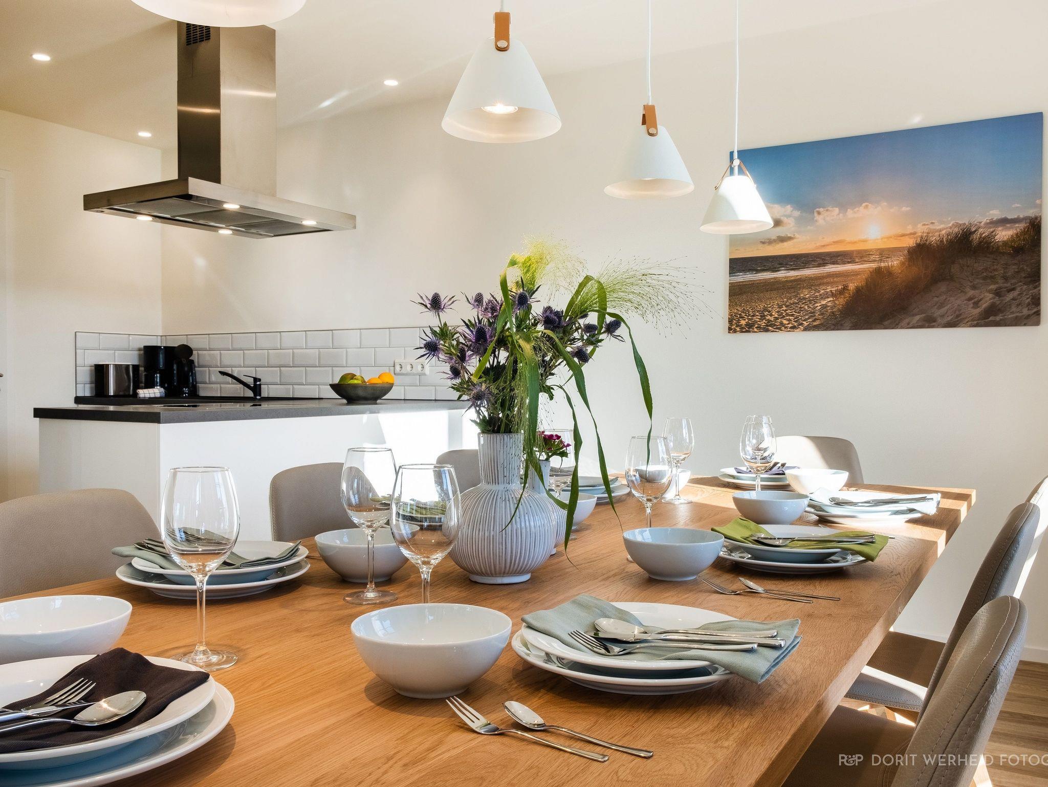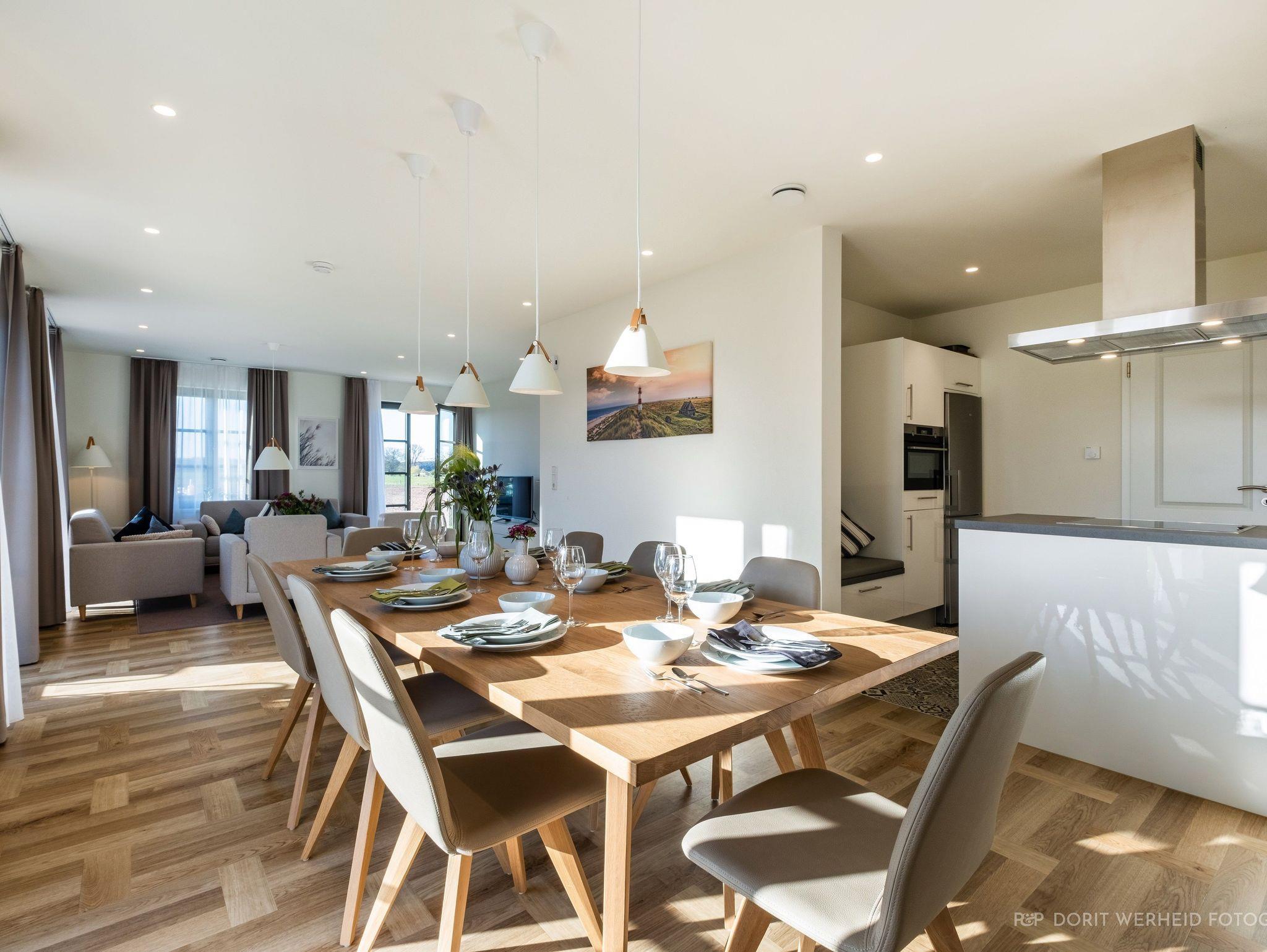 Das Reetdachhaus ist hochwertig ausgestattet. Es verfügt über eine komplett eingerichtete Einbauküche mit Spülmaschine, Mikrowelle, Induktionsherd und großem Kühlschrank mit separatem Gefrierabteil sowie Kaffeemaschine, Wasserkocher und Toaster. Ebenfalls verfügt das Ferienhaus über eine Waschmaschine. Der Wohnraum ist aufgeteilt in einen Küchen- und Essbereich, sowie in einen hellen und modernen Wohnbereich. Vor dem Haus befinden sich zwei Terrassen, von denen Sie einen herrlichen Blick ins Grüne genießen können. Das Ferienhaus bietet insgesamt 4 Schlafzimmer und drei Bäder, die jeweils mit einer Dusche ausgestattet sind. Ein Schlafzimmer und Badezimmer befinden sich im Erdgeschoß und sind jeweils vom Flur erreichbar. Im Obergeschoß befindet sich ein Schlafzimmer mit „Bad en suite“ sowie zwei weitere Schlafzimmer und ein Badezimmer die vom Flur aus erreichbar sind. Bei allen Betten handelt es sich um Boxspringbetten. Kinderreisebett sowie Hochstuhl können bestellt werden. Saunahandtücher sind nicht im Preis vorhanden und können gegen Gebühr bei der Verwalterin dazugebucht werden.