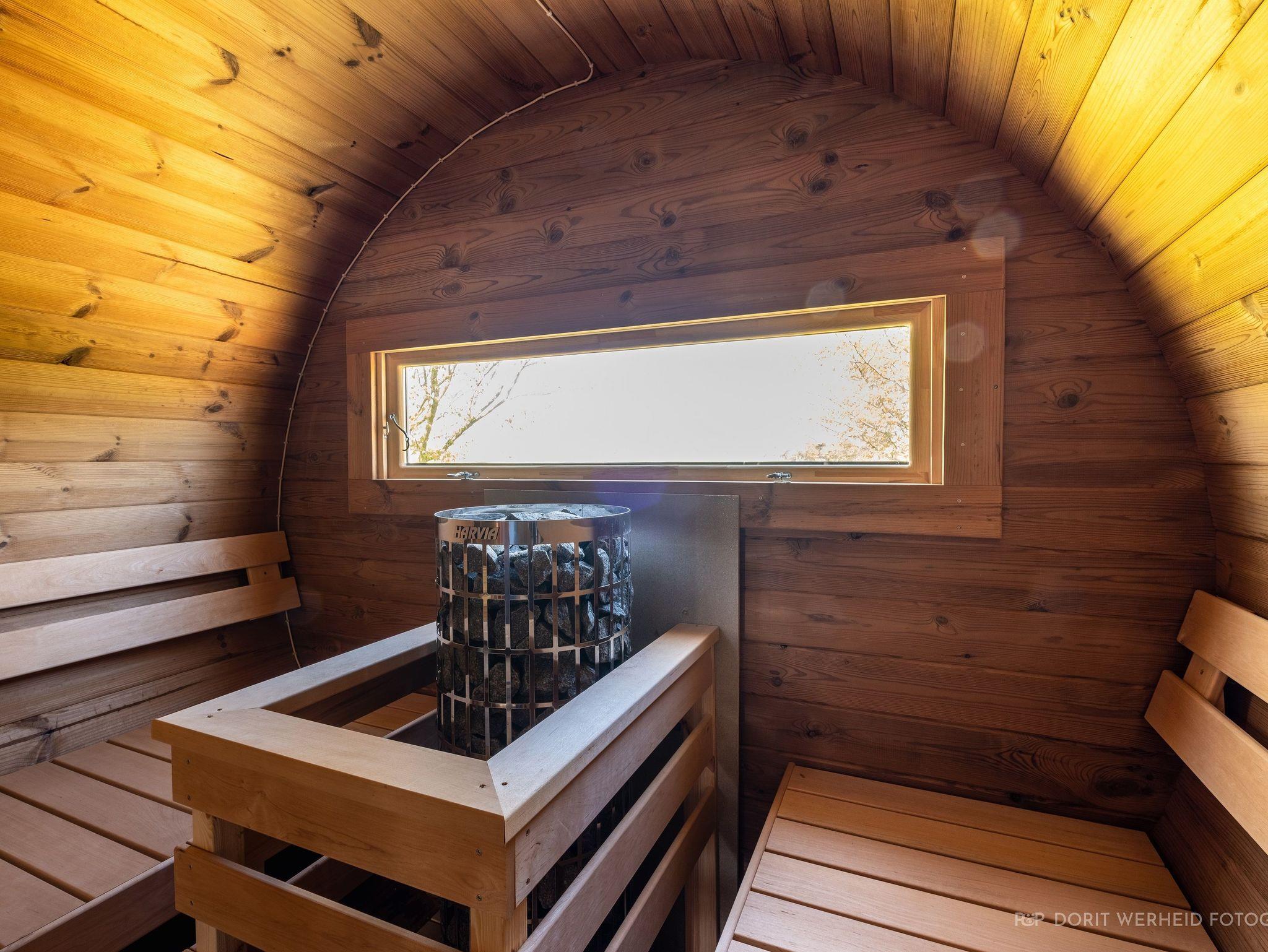 Der geräumige Wohn-Essbereich im Erdgeschoss bietet ausreichend Platz für gemeinsame Essen und gesellige Fernseh- oder Spielabende. Ihnen stehen Gesellschaftsspiele, DVDs und eine kleine Auswahl an Büchern zur Verfügung. Die Wohnküche mit Vollausstattung verfügt über alle Standardgeräte, wie Spülmaschine, Mikrowelle, Backofen, Induktionsherd, Kaffeemaschine, Wasserkocher und Toaster. Von diesem Bereich gelangen Sie direkt auf die beiden Terrassen mit herrlichem Blick ins Grüne. Für gemütliche Grillfeste auf der Terrasse steht ein elektrischer Kontaktgrill bereit. Im Garten steht Ihnen außerdem die Fasssauna (gegen Gebühr) zur Verfügung. Ebenfalls befindet sich ein Schlafzimmer mit einem Boxspringbett, TV und ein Badezimmer mit Waschbecken, WC und bodentiefer Dusche zur Verfügung.