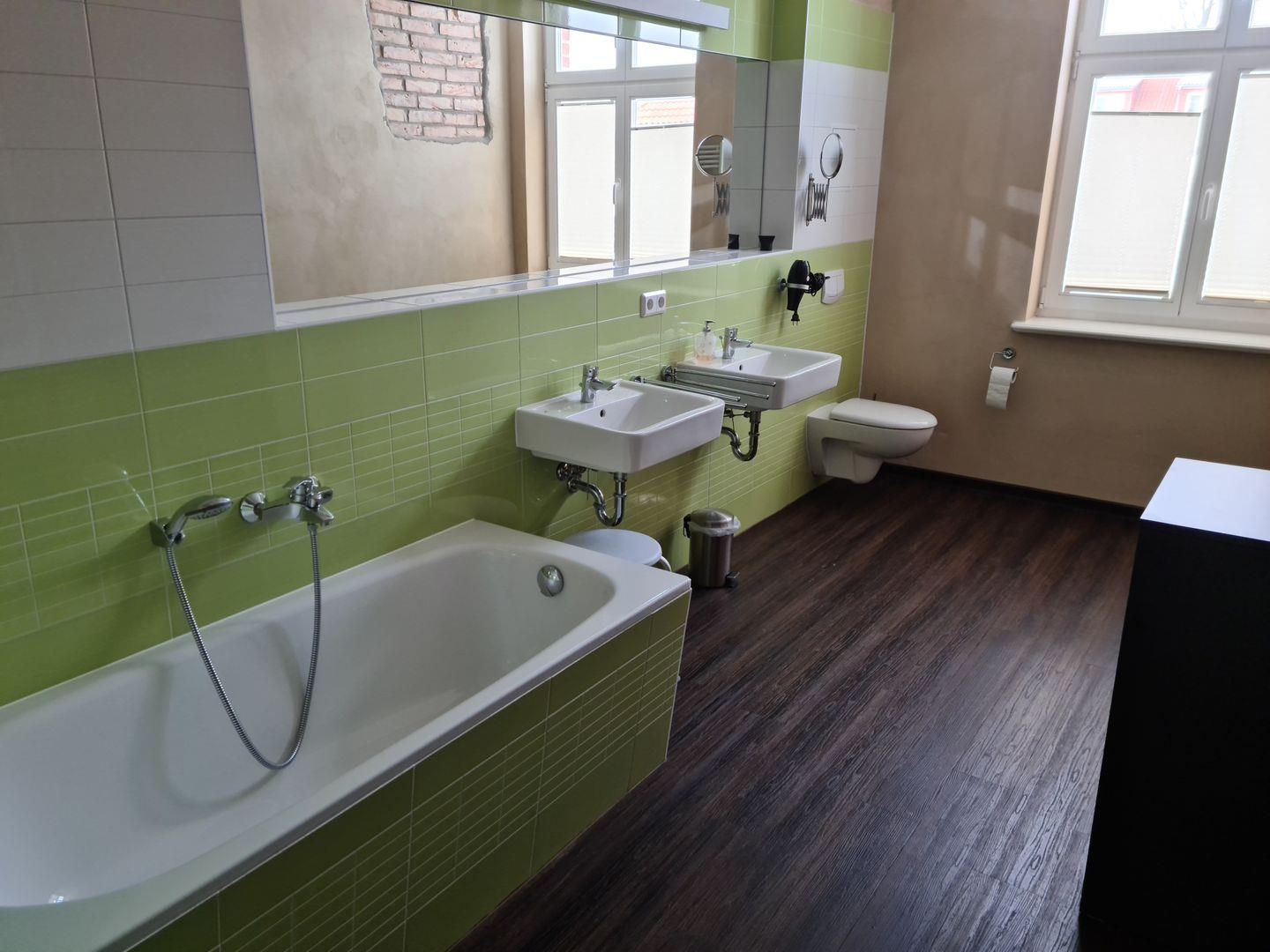 Es hat einen gemütlichen Wohn-Essbereich mit komplett ausgestatteter separater Küche ( inkl. Geschirrspüler ) und ein großzügiges Badezimmer mit Waschbecken, Badewanne, Dusche, WC, Haartrockner und Kosmetikspiegel.