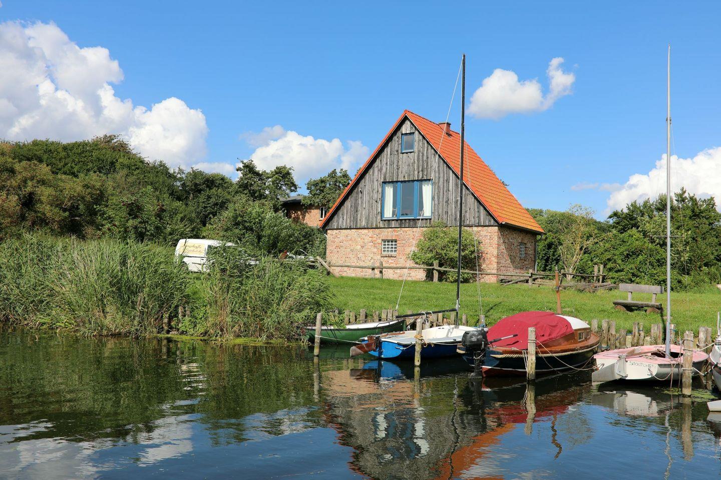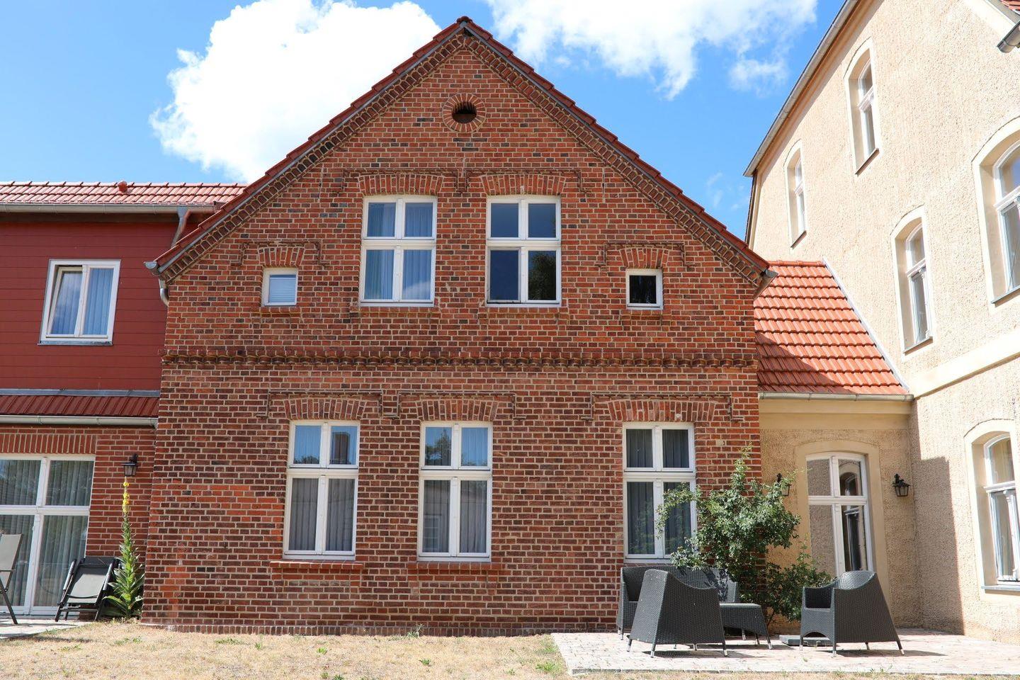 Appartement Nr. 50 Downton Abbey in einem der Gesindehäuser des Westflügels von Schloss Stolpe, Südseite zum Haff mit Terrasse.