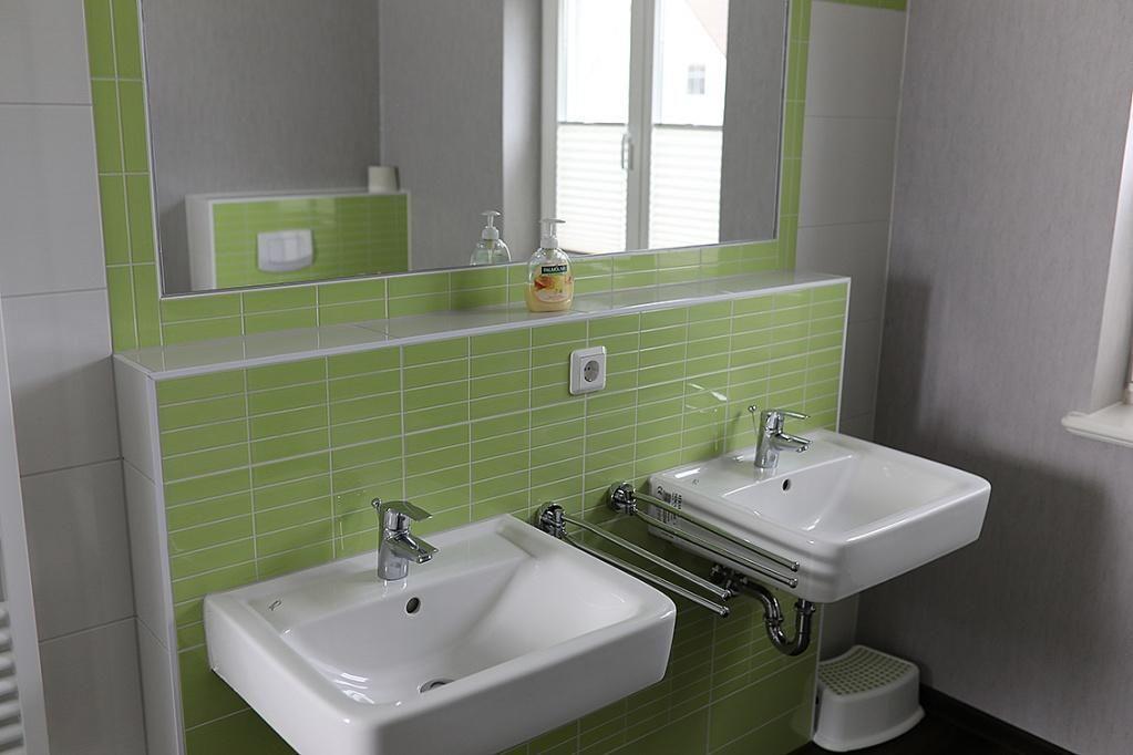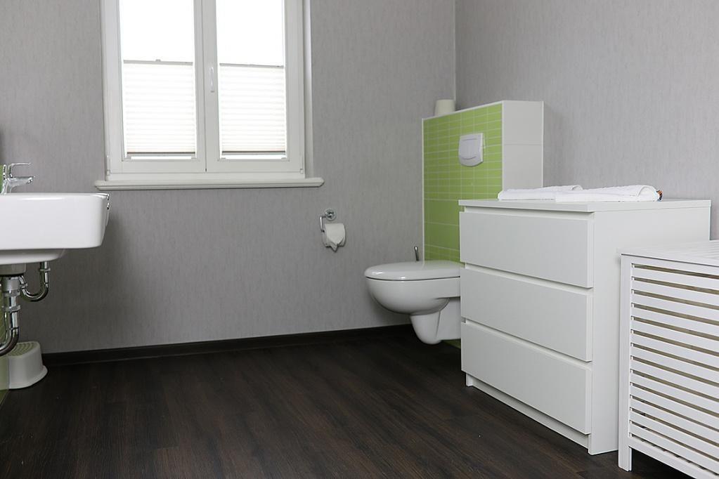 Im oberen Teil des Hauses befindet sich das großzügige Badezimmer mit Doppelwaschbecken, Dusche und WC, Haarfön und Kosmetikspiegel. Ein Gäste-Wc finden Sie im Erdgeschoss