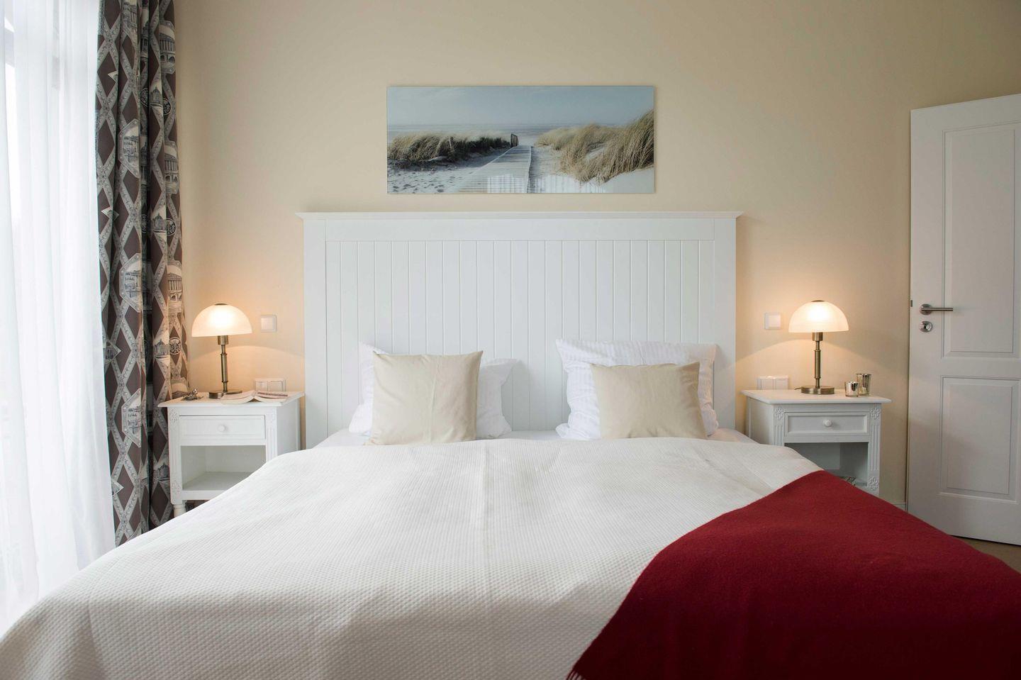Die Standartausstattung mit Flat-TV, Radio, WLAN, Zimmersafe, zwei Strandkörben auf der umlaufenden Terrasse, sowie ein freier Parkplatz stehen zur Verfügung.