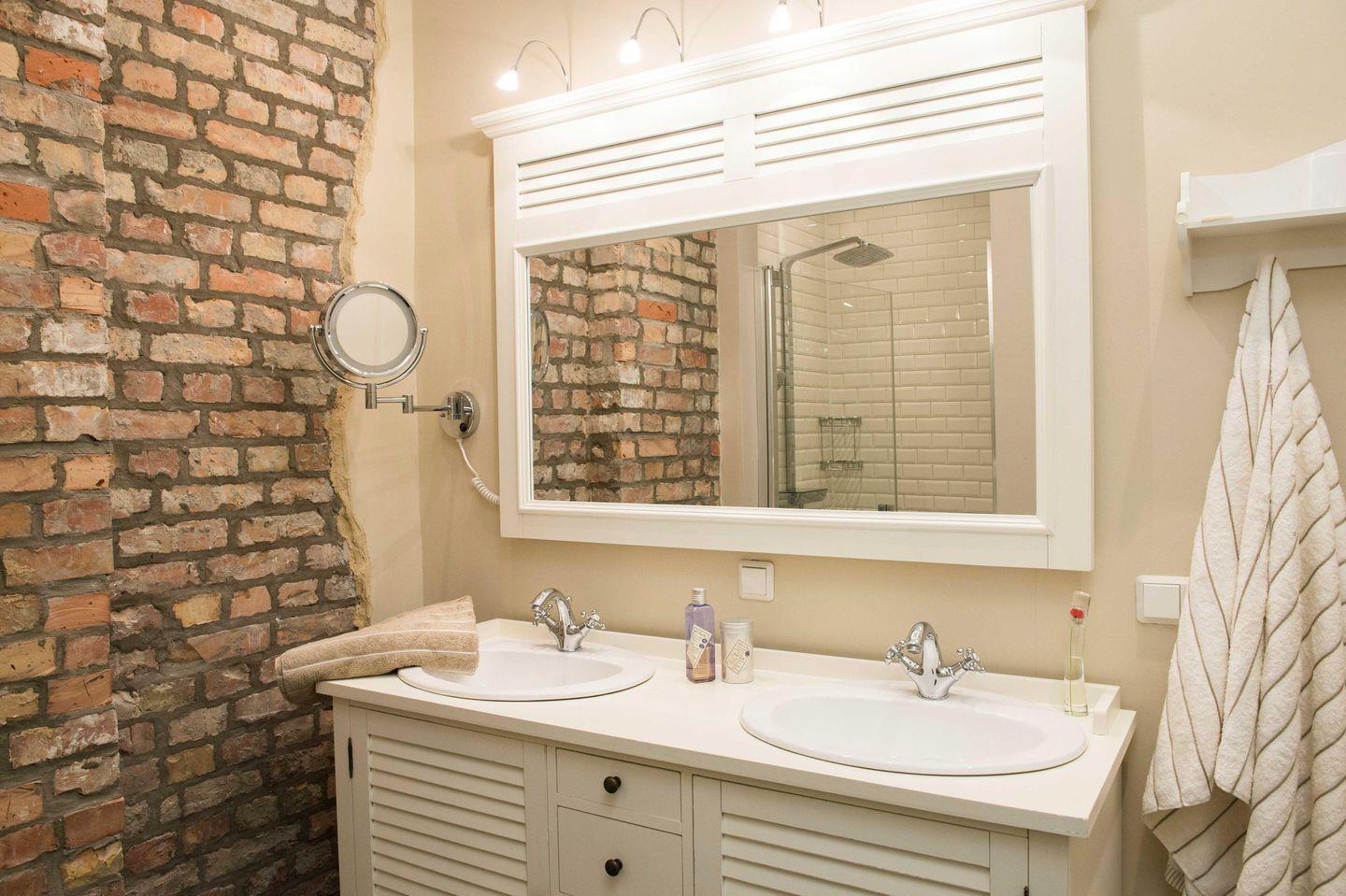 5 Personen haben in der Wohnung mehr als genug Platz, das große Bad mit zusätzlicher Schwalldusche, WC und Doppelwaschtisch ist mit Naturstein versehen und passt sich gehobenen Ansprüchen an. Fön und Kosmetikspiegel sind vorhanden, ebenso ein Gäste-WC.