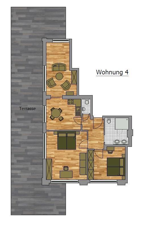 3 Zimmerappartement, für 5 Personen, 2 Schlafzimmer mit Doppelbetten, 1 Schlafcouch im Wohnbereich, 1 Bad mit Komfortdusche, 1 Gäste-WC, offene Küche mit Geschirrspüler, umlaufende Süd-West Terrasse mit 2 Strandkörben, Fernseher, WLAN, Parkplatz