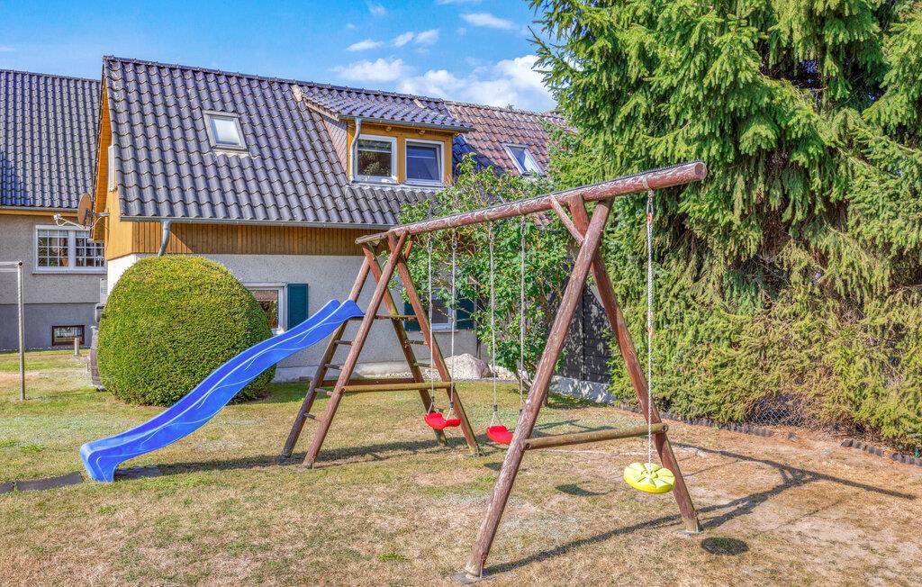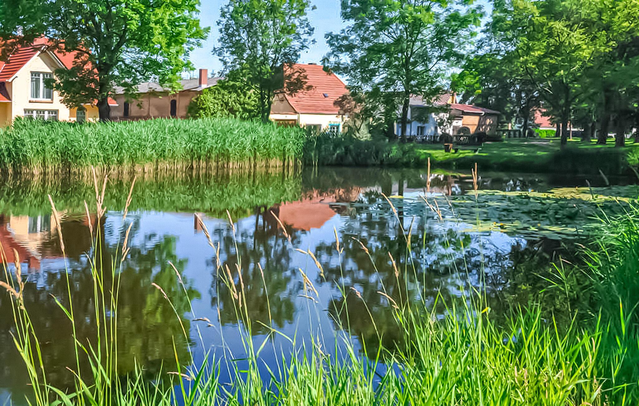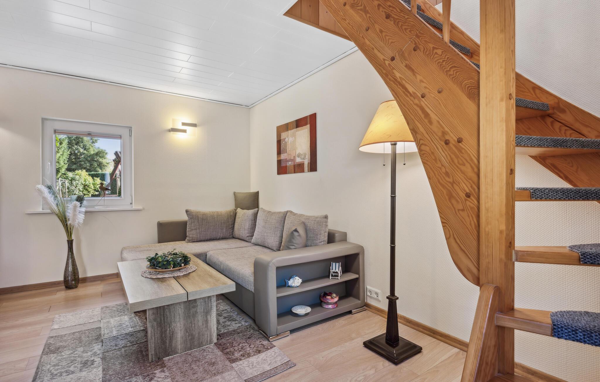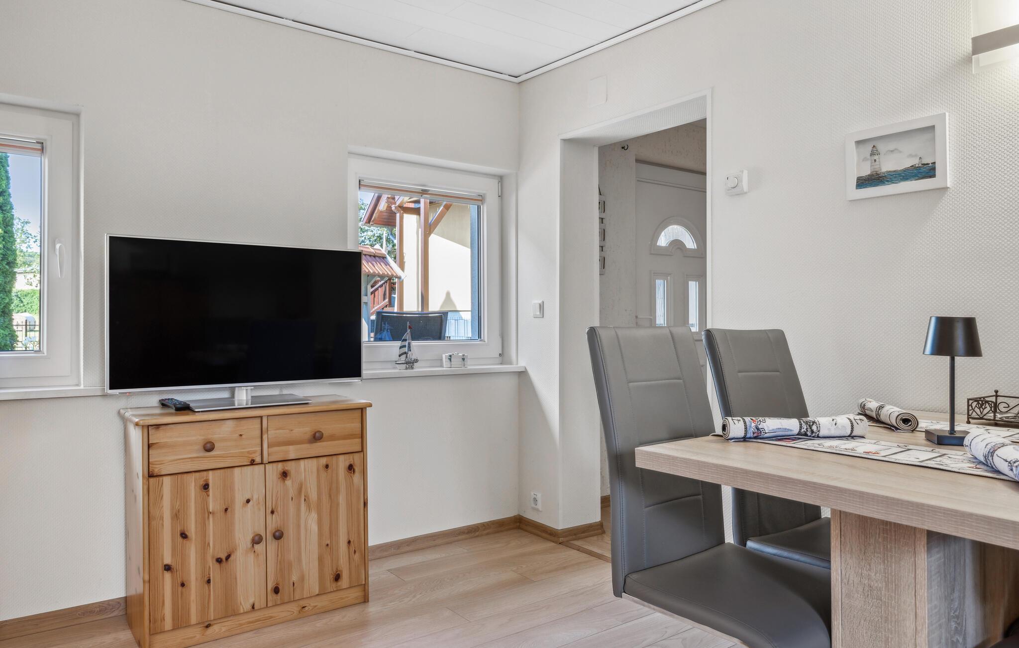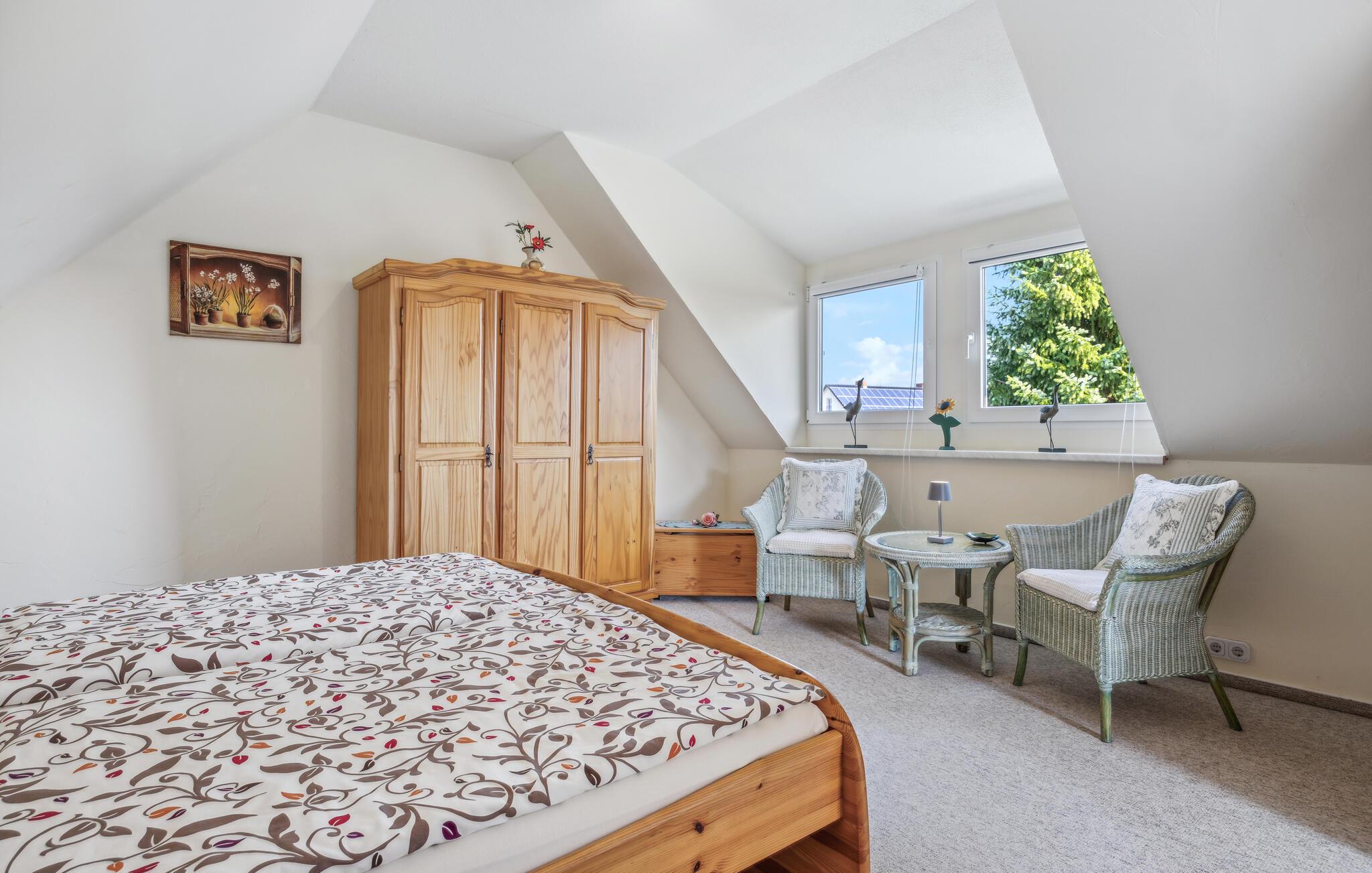 Feriehuset ligger separat på eierens boligeiendom i et rolig område i utkanten av Stolpe. Det er ca. 1 km til en badeplass ved Stettiner Lagune. Restauranten i landsbyen ligger ca. 700 meter unna. Leiligheten strekker seg over 2 etasjer og har plass til opptil 3 personer. I første etasje er det stue med polstrede møbler, spiseplass, flatskjerm-TV, radio, et åpent minikjøkken med elektrisk komfyr (2 kokeplater), kjøleskap med frysedel og diverse små kjøkkenapparater, samt bad med toalett og dusj. Soverommet med dobbeltseng og en solseng ligger i øverste etasje og kan nås via en trapp. Leiligheten har insektsnett foran soveromsvinduene og en ekstra elektrisk varmeovn: WLAN, møblert terrasse med grill, 1 solseng, sykkeloppbevaring og parkeringsplass. Det er også en solseng og lekeapparater for barn på eiendommen.inkludert i totalprisen: Sengetøy, vann og energiforbruk. Du må ta med egne håndklær.