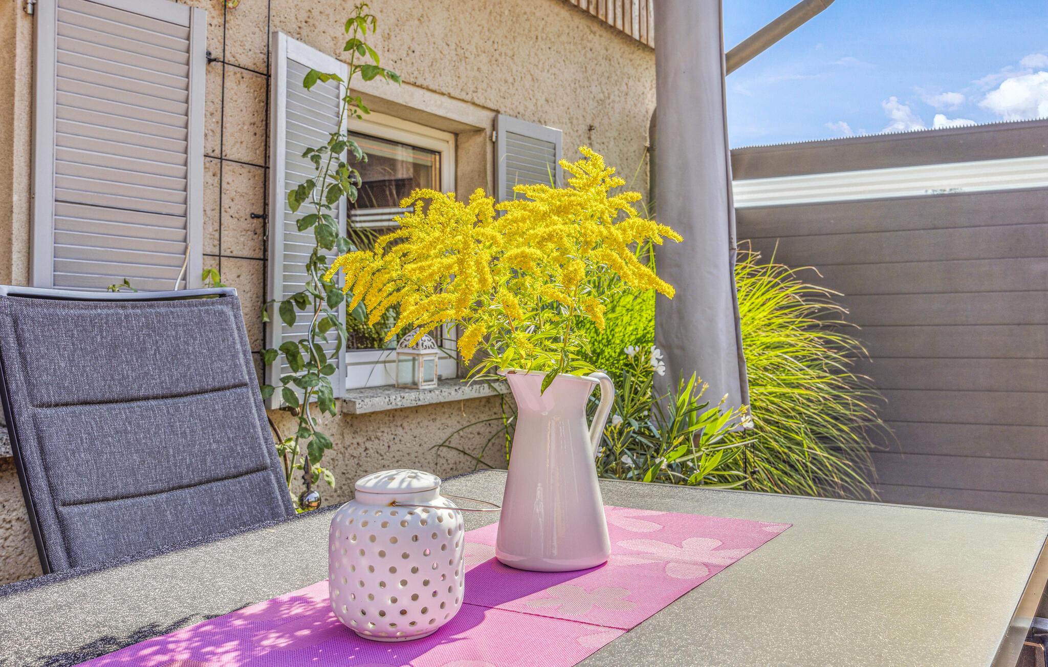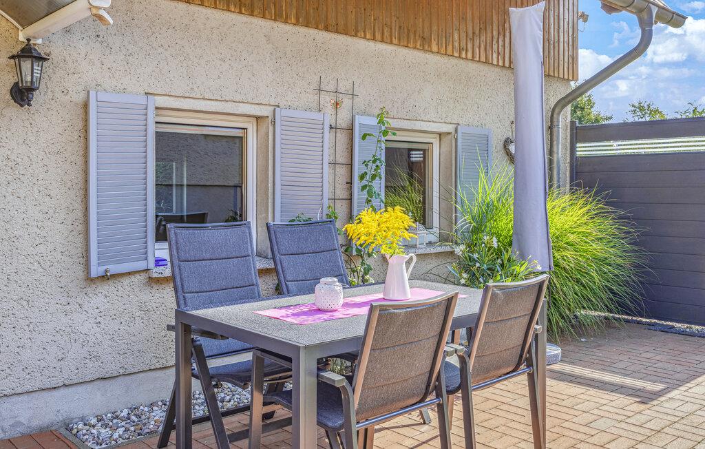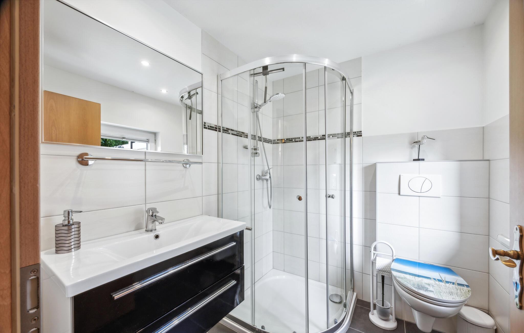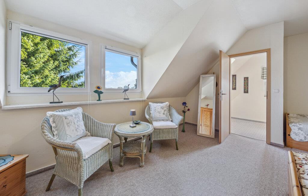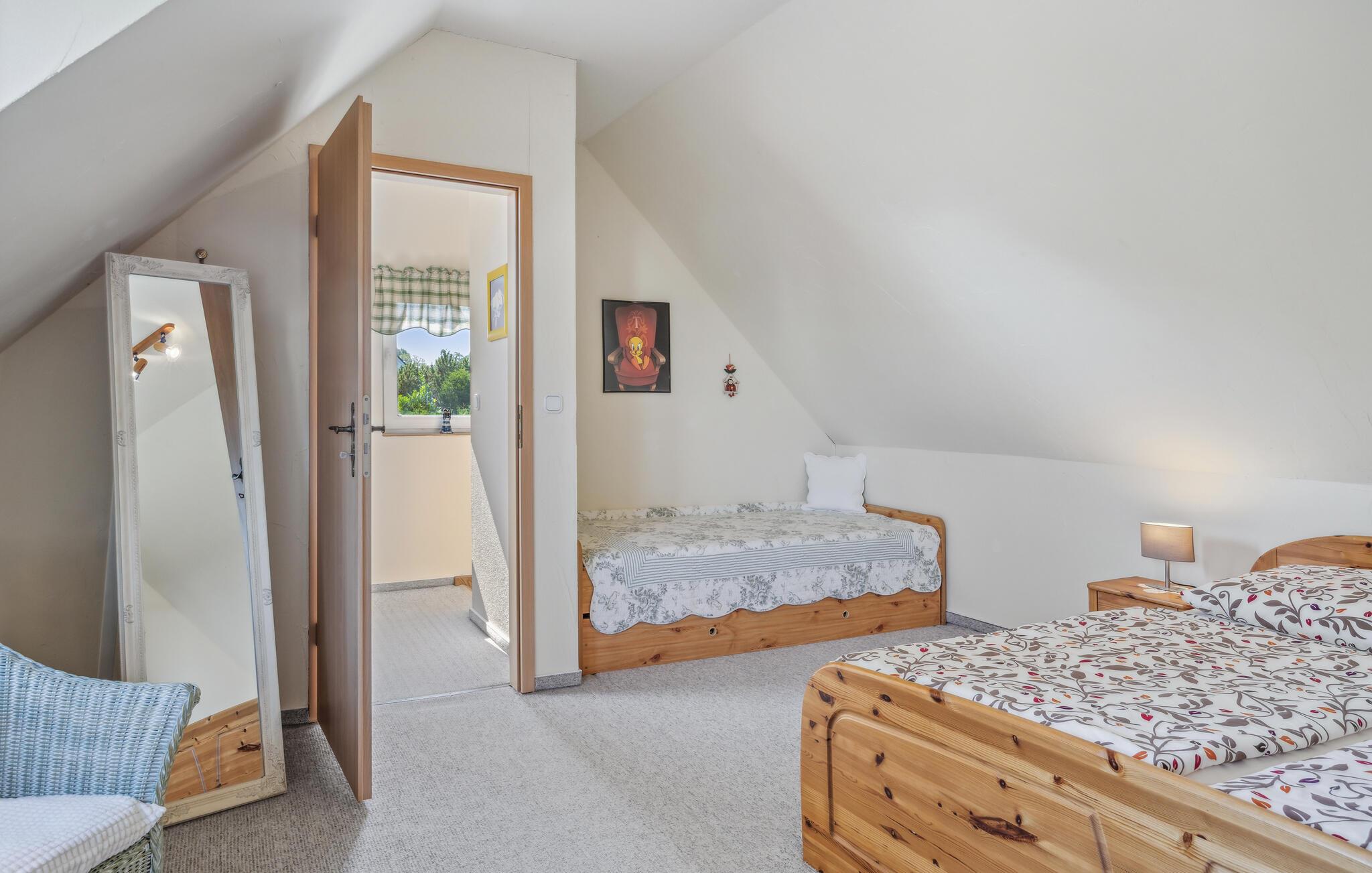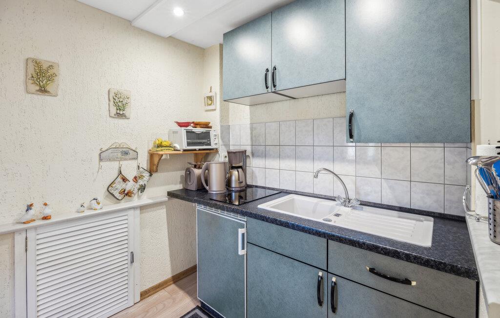Feriehuset ligger separat på eierens boligeiendom i et rolig område i utkanten av Stolpe. Det er ca. 1 km til en badeplass ved Stettiner Lagune. Restauranten i landsbyen ligger ca. 700 meter unna. Leiligheten strekker seg over 2 etasjer og har plass til opptil 3 personer. I første etasje er det stue med polstrede møbler, spiseplass, flatskjerm-TV, radio, et åpent minikjøkken med elektrisk komfyr (2 kokeplater), kjøleskap med frysedel og diverse små kjøkkenapparater, samt bad med toalett og dusj. Soverommet med dobbeltseng og en solseng ligger i øverste etasje og kan nås via en trapp. Leiligheten har insektsnett foran soveromsvinduene og en ekstra elektrisk varmeovn: WLAN, møblert terrasse med grill, 1 solseng, sykkeloppbevaring og parkeringsplass. Det er også en solseng og lekeapparater for barn på eiendommen.inkludert i totalprisen: Sengetøy, vann og energiforbruk. Du må ta med egne håndklær.