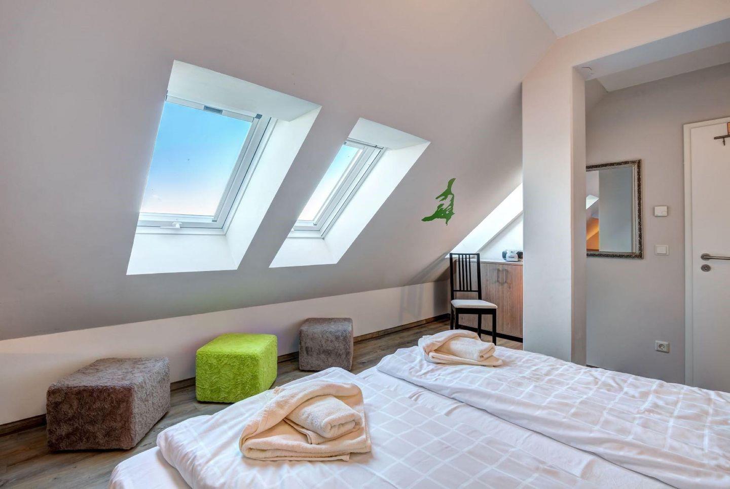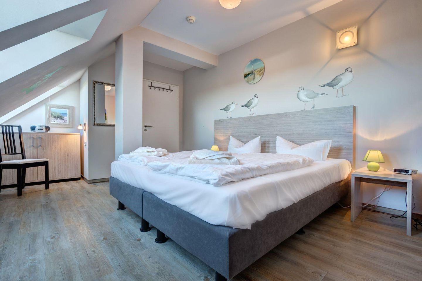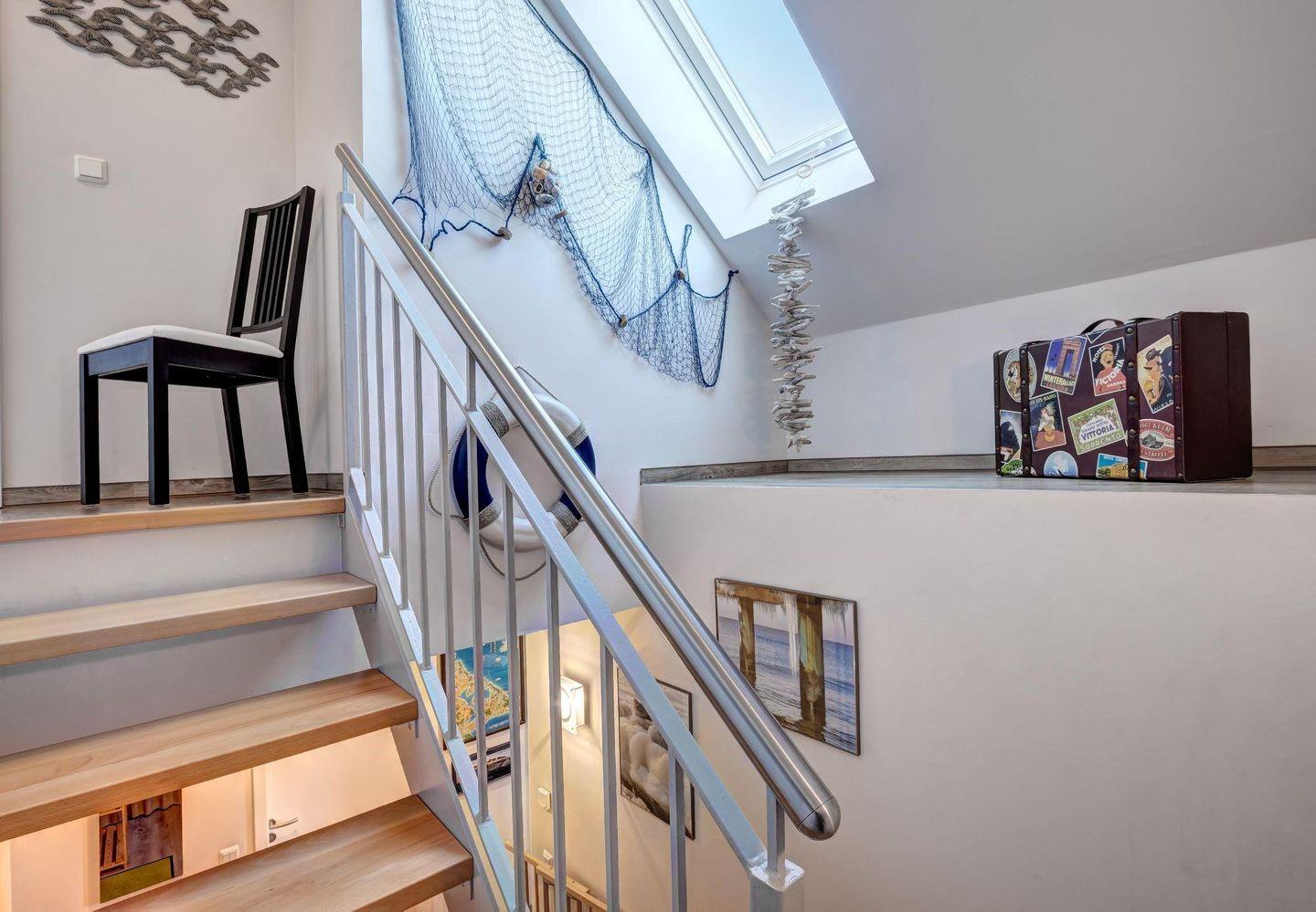 Über eine Treppe erreicht man die obere Etage im 3. Stock mit einem großen hellen Raum. Ein Doppelbett und ein Einzelbett, sowie ein Stauraum bieten hier den Schlafplatz für den Ferienaufenthalt von 2-3 Personen.