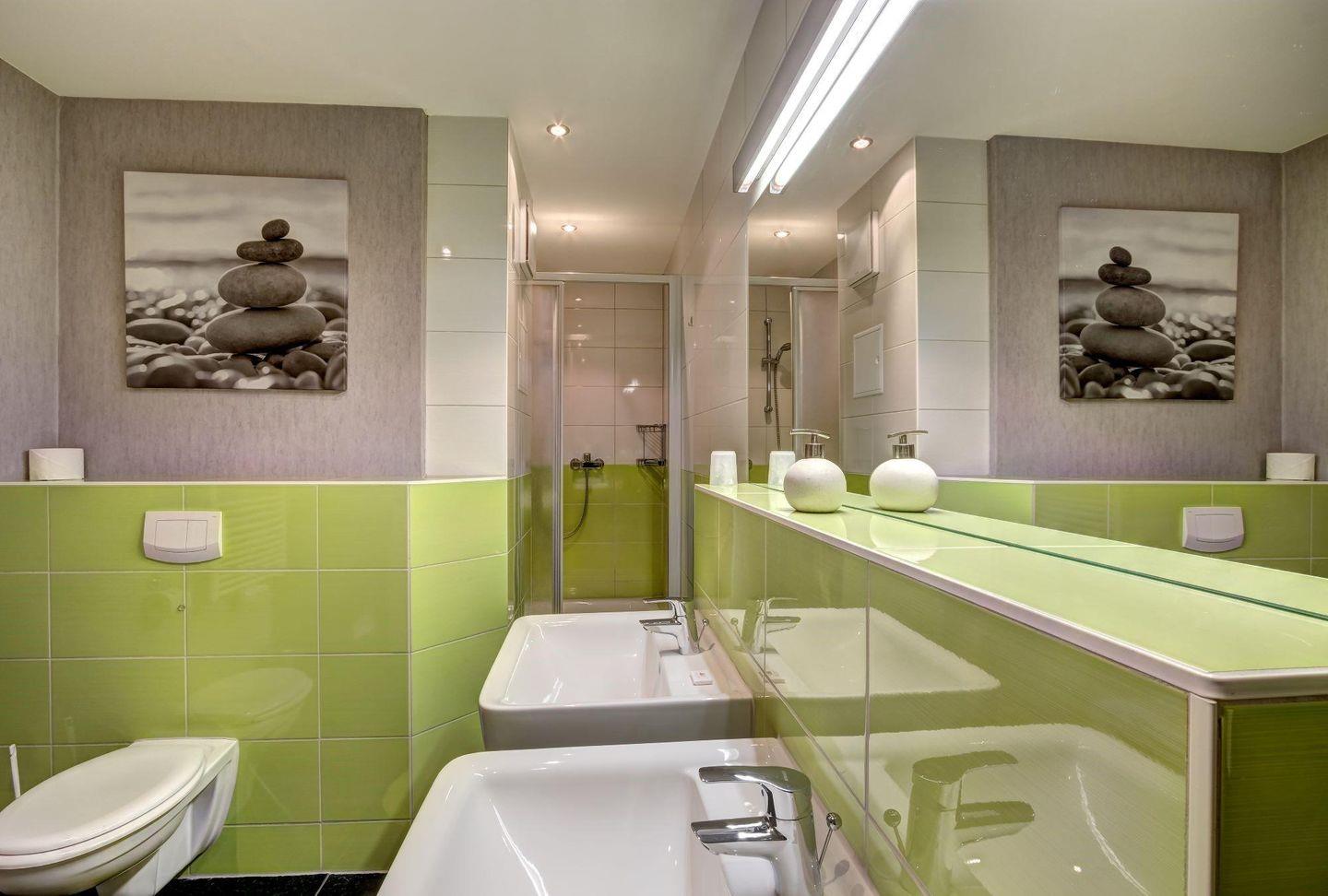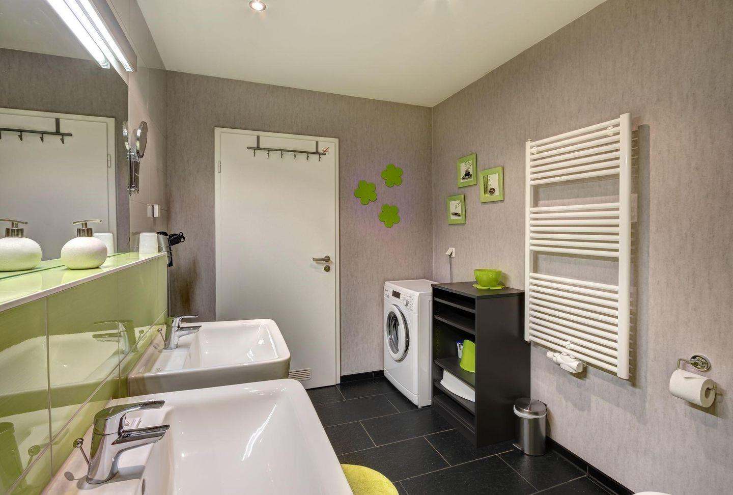 Das Bad ist mit Dusche, WC, Doppelwaschtisch und Waschmaschine ausgestattet.