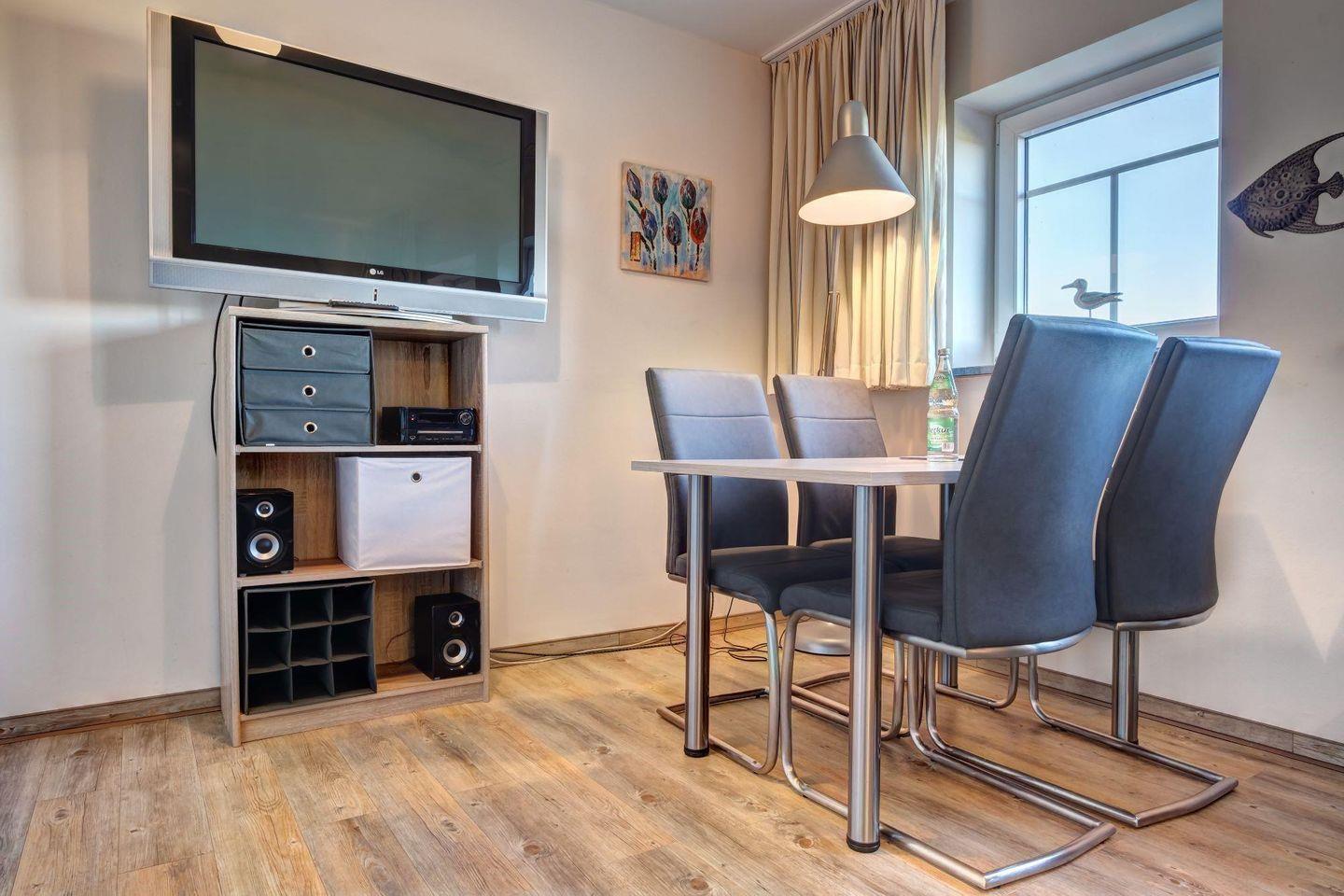 Im 2. Stock befindet sich der Eingangsflur, der Wohnraum mit gemütlicher Sofaecke, der Essgruppe und einer voll ausgestatteten Küchenzeile. Das Schlafzimmer auf dieser Etage ist großzügig möbliert mit komfortablem Boxspringbett für 2 Personen, Schreibtisch und ausreichend Schrankraum.
