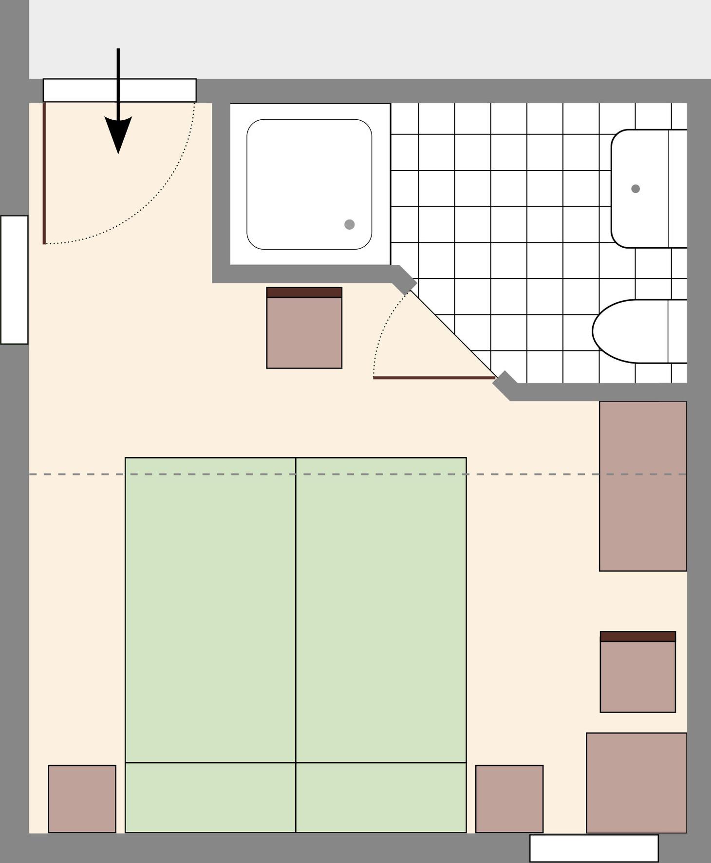 Es verfügt über 2 Fenster, von denen das liegende Dachfenster in östlicher Richtung ausgerichtet ist und das Fenster auf der Giebelseite des Hauses nach Süden zeigt. Das Dachfenster ist mit einer textilen Jalousie versehen. Das Zimmer ist über eine massive Treppe mit 36 Stufen erreichbar, die durchgehend mit einem stabilen Metallgeländer ausgestattet ist. Es ist im ländlichen Stil eingerichtet und verfügt über ein separates Bad mit Du/WC sowie ein Boxspringbett. Zur weiteren Ausstattung gehören ein Sat-TV, ein Beistelltisch, 2 Stühle, ein Kleiderschrank, 2 Nachttischschränkchen und ein Standventilator. Im Bad liegt ein Haartrockner bereit. WLAN steht im Zimmer sowie in der Gaststätte zur Verfügung.
