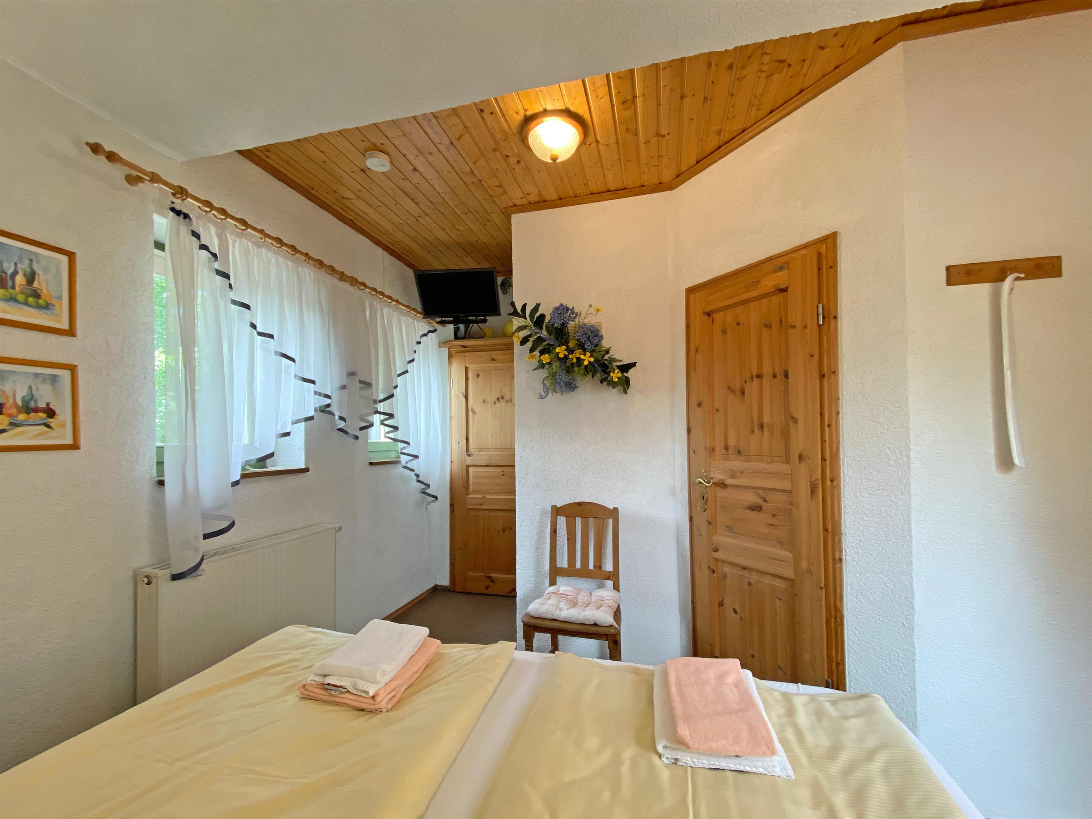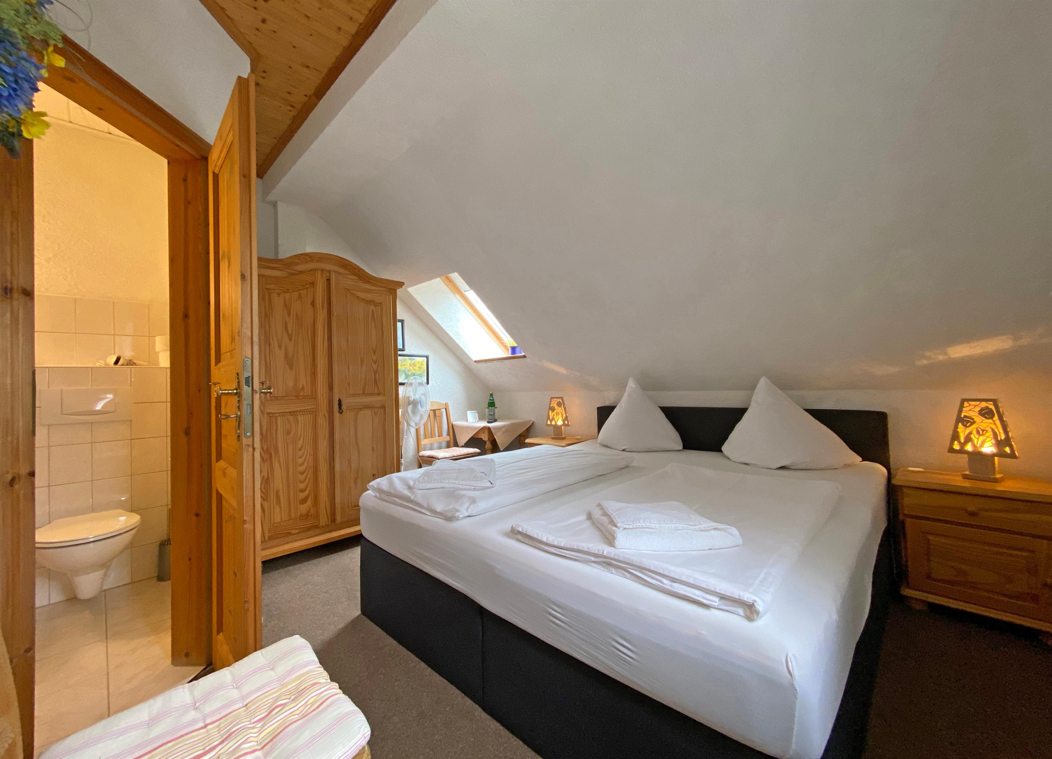 Das gemütliche Zimmer mit Dachschräge liegt an der südlichen Giebelseite unserer Bauernwirtschaft über der Gaststube im 2. Obergeschoss.