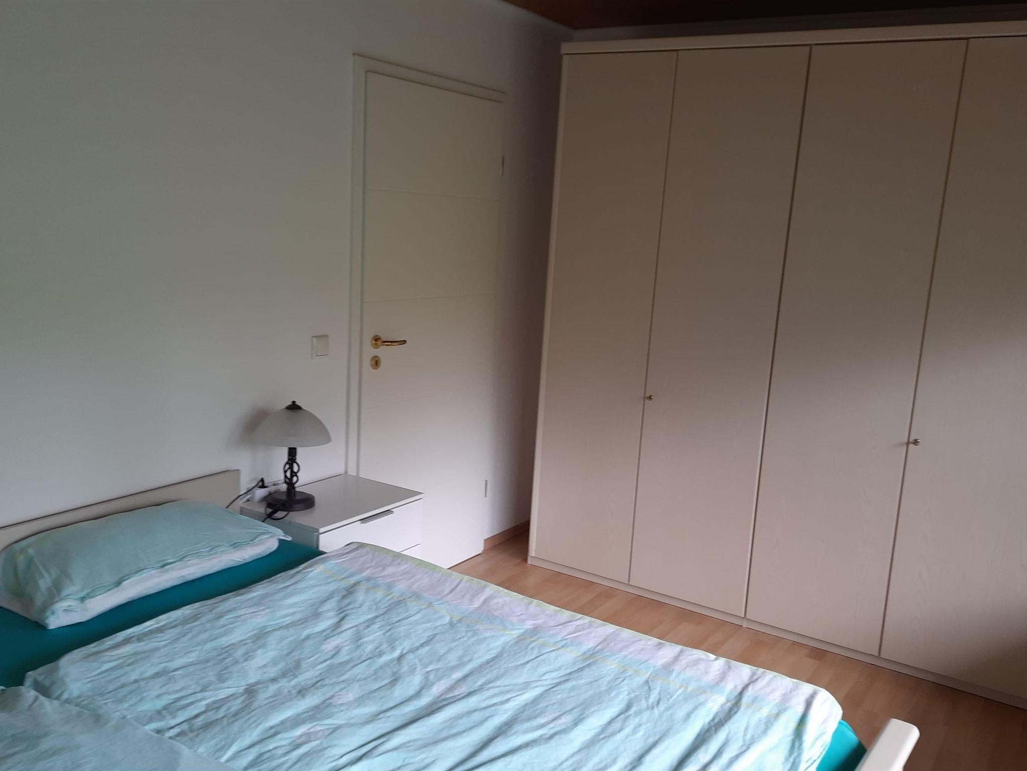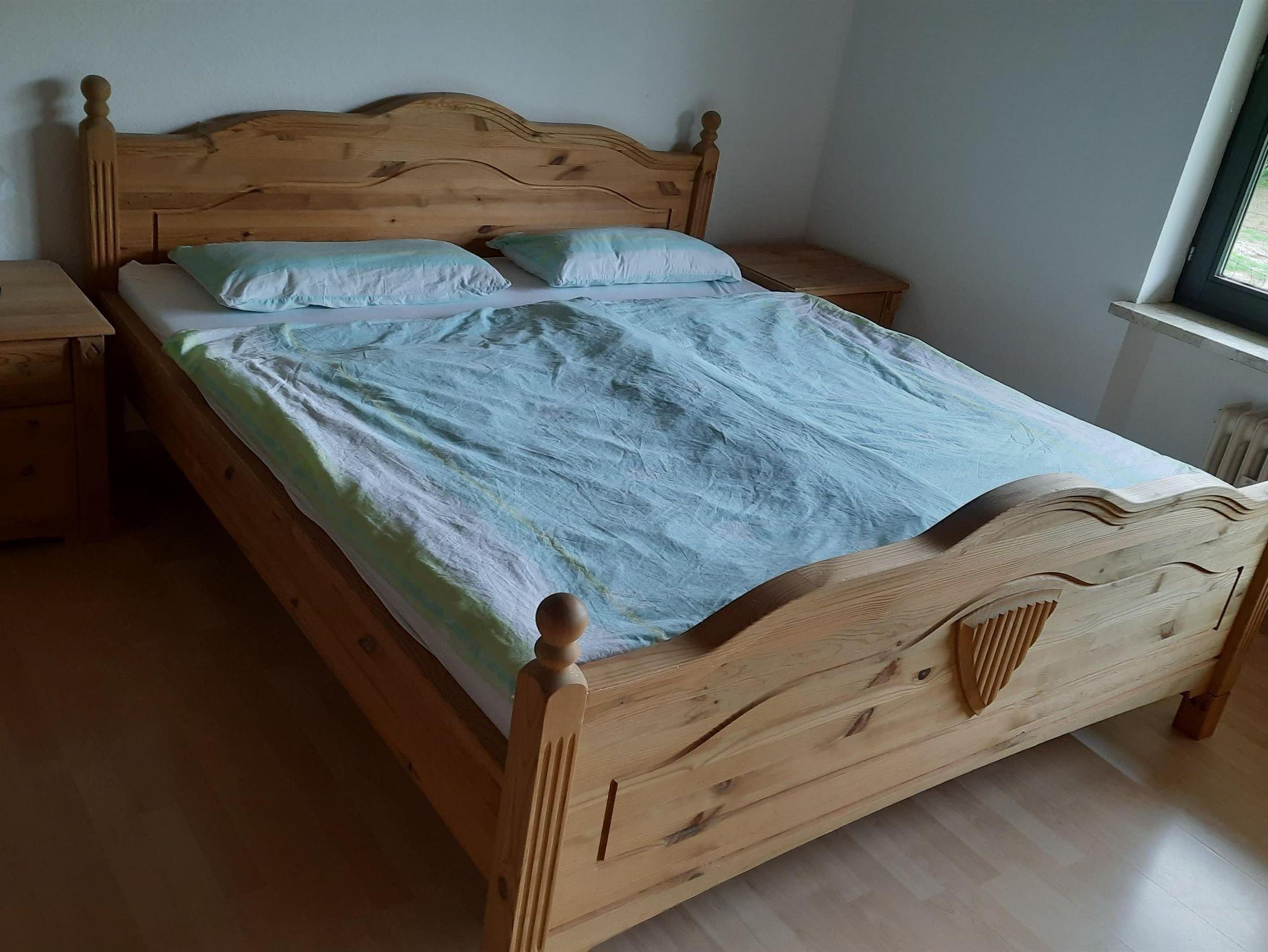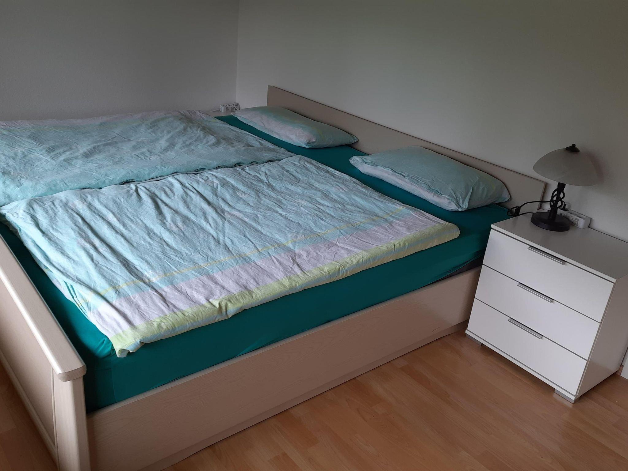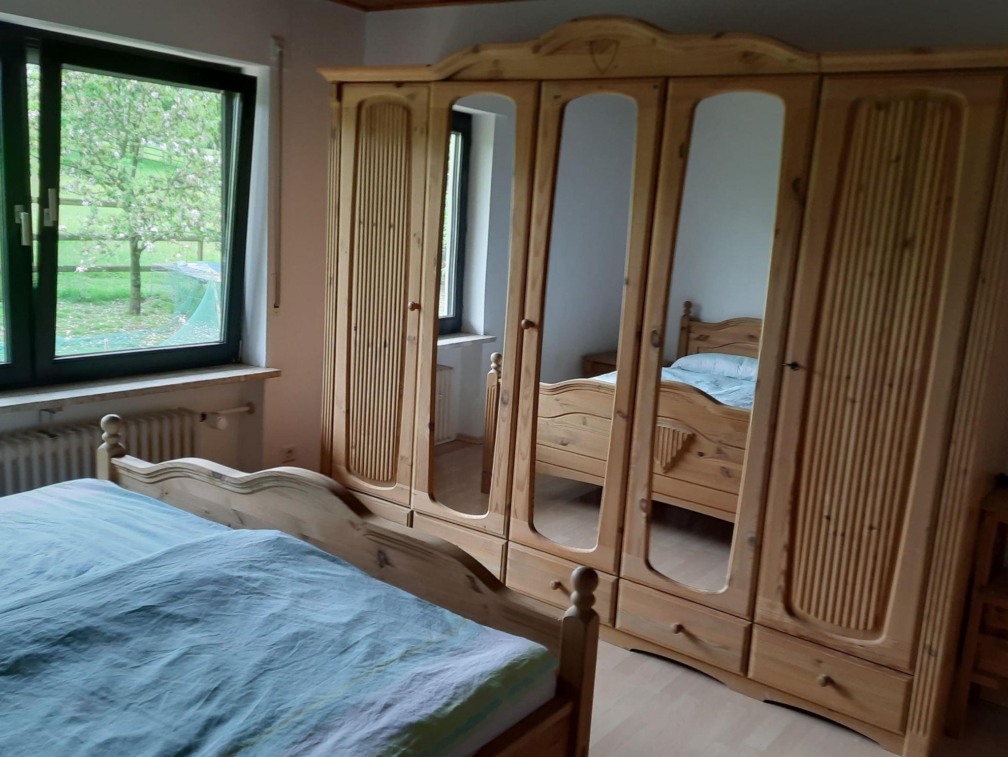 Im Schlafzimmer Nr. 2 gibt es neben dem 1,8x2 Meter Doppelbett noch eine klappbare Schlafcouch, die eine zusätzliche 1,6x2 Meter Liegefläche für weitere Gäste bereithält. Zusätzlich gibt es auch hier einen großen Kleiderschrank und den schönen Ausblick auf unsere Hausweide.