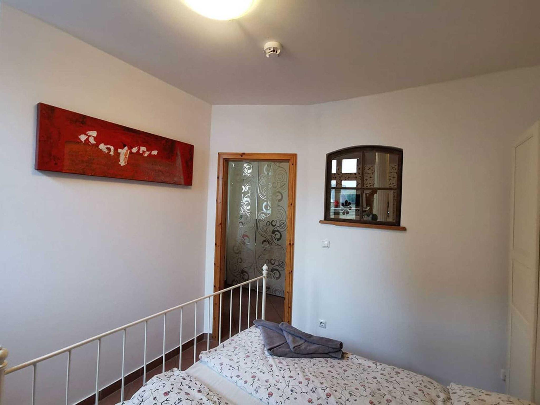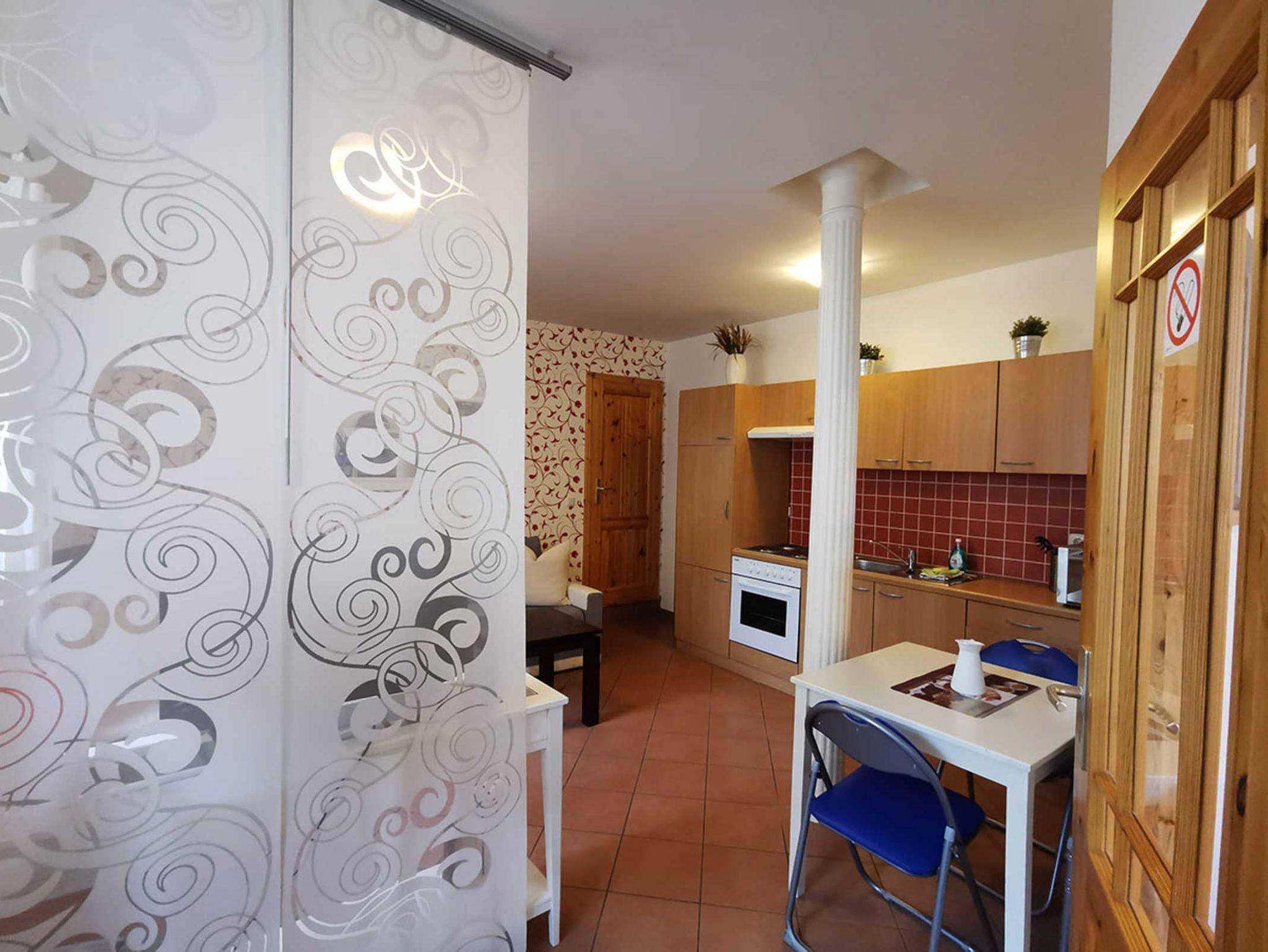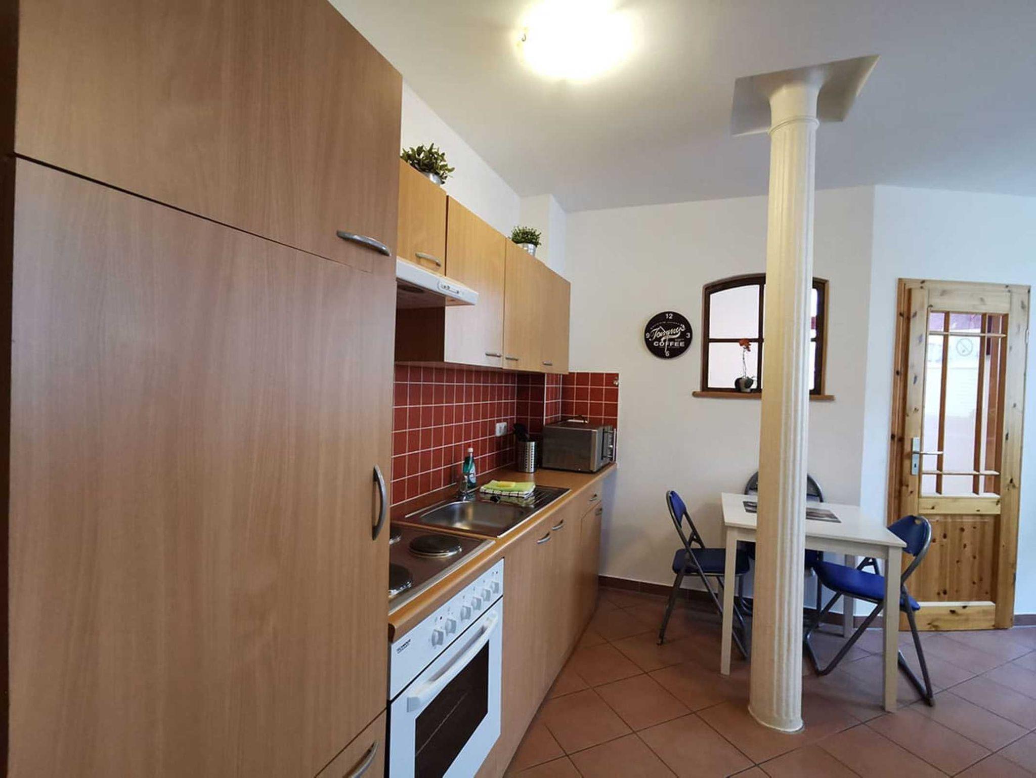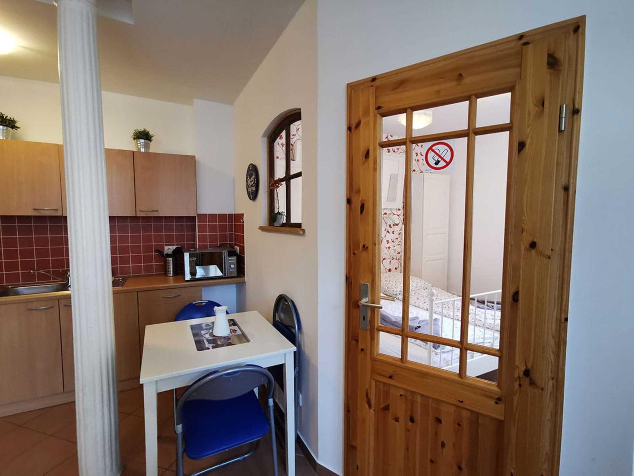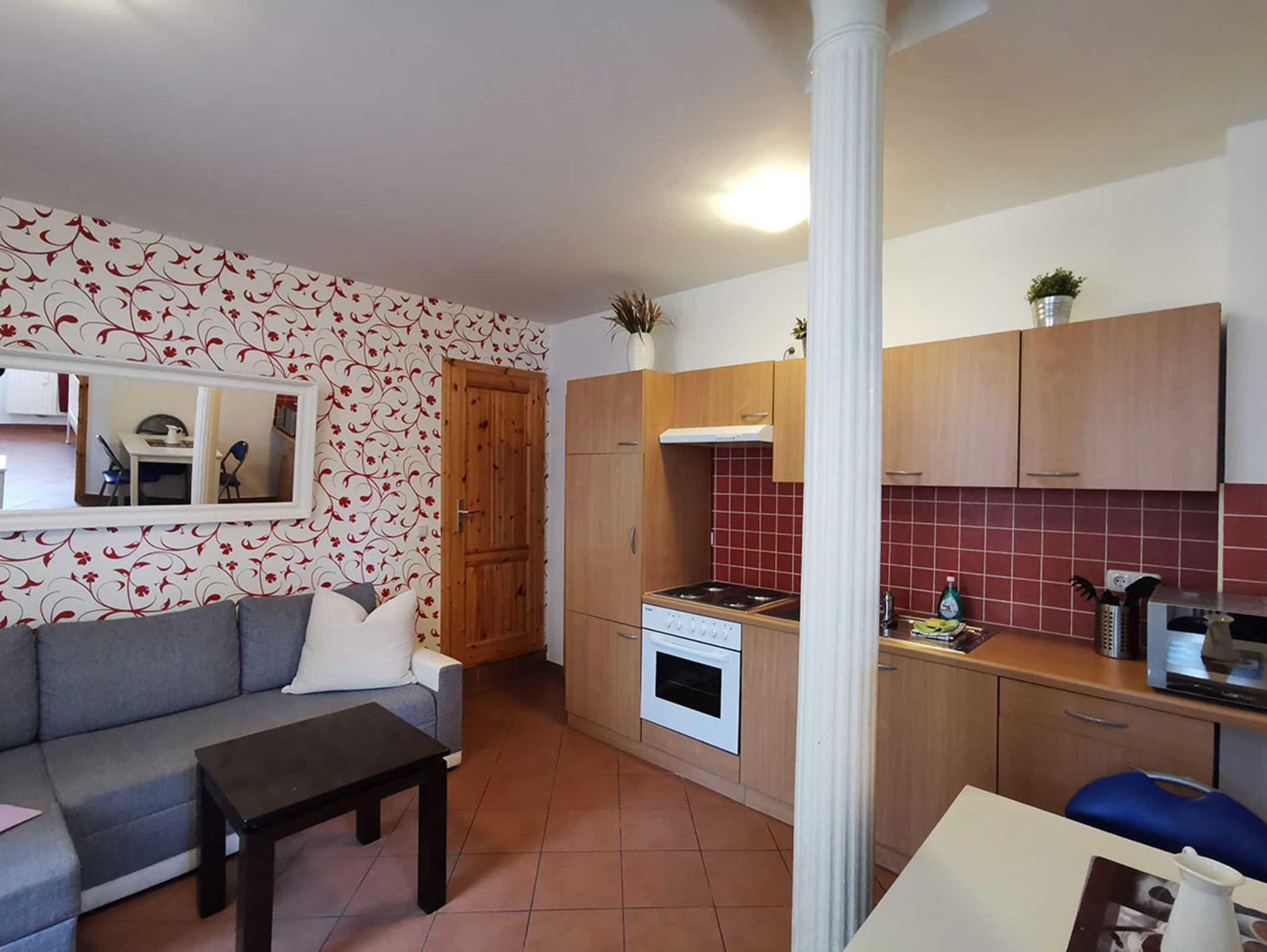 Die Ferienwohnung verfügt über ein Wohnzimmer mit offener Küche und einem Schlafzimmer mit Doppelbett.