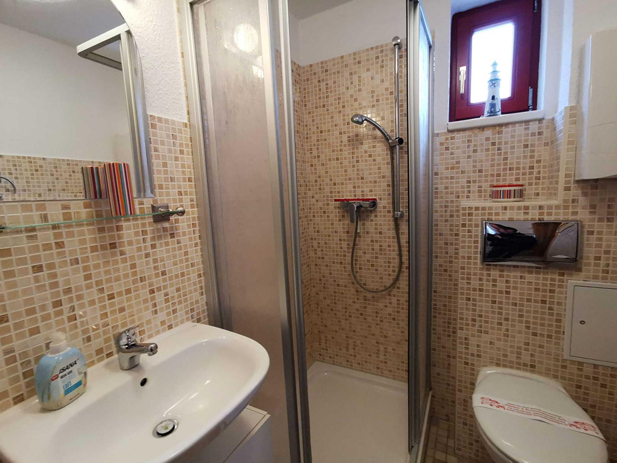 Das Bad ist gefliest, mit Dusche und Fenster.