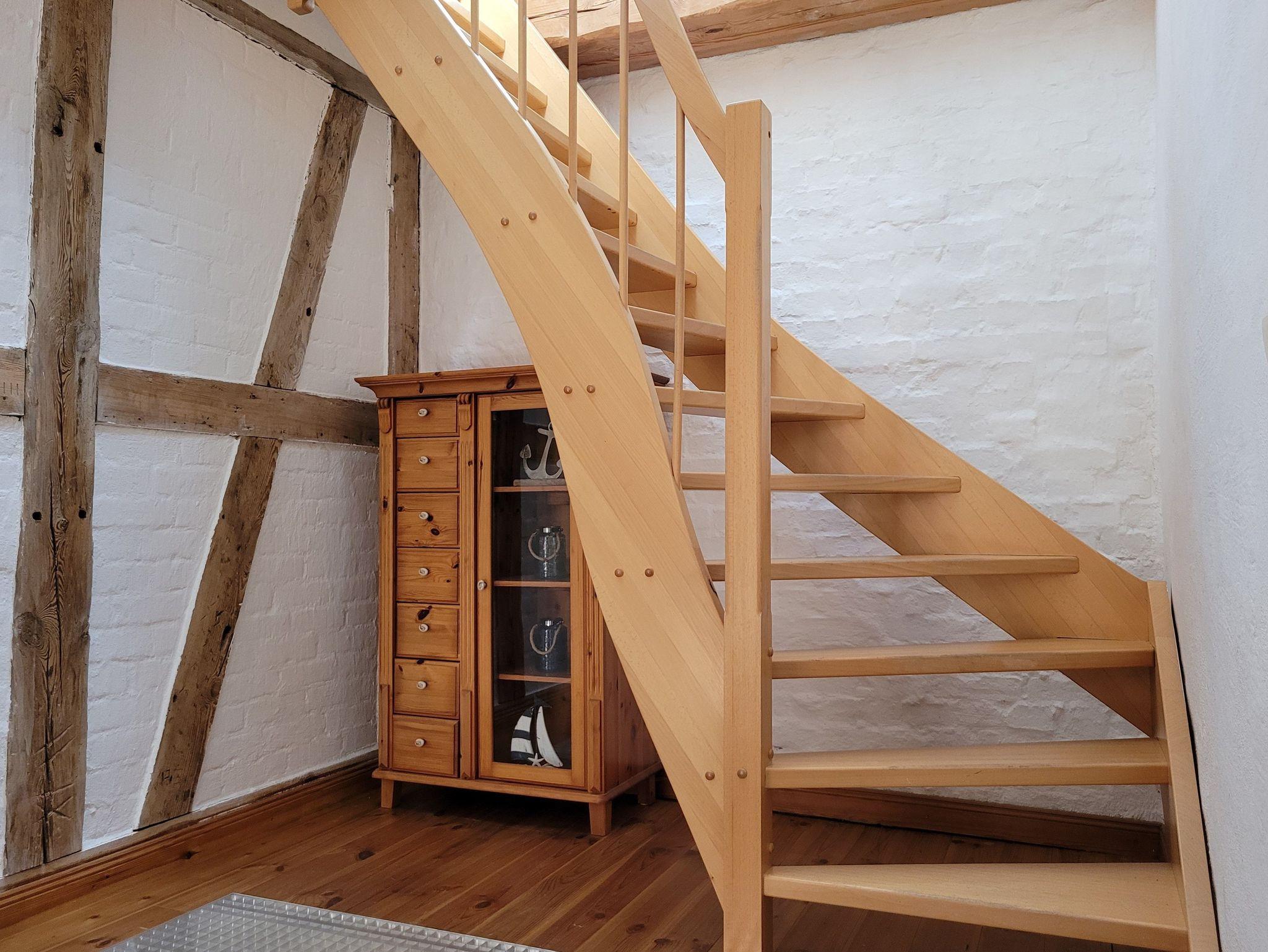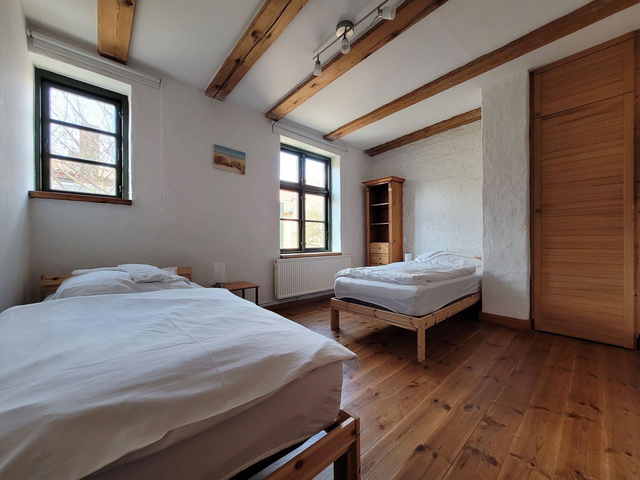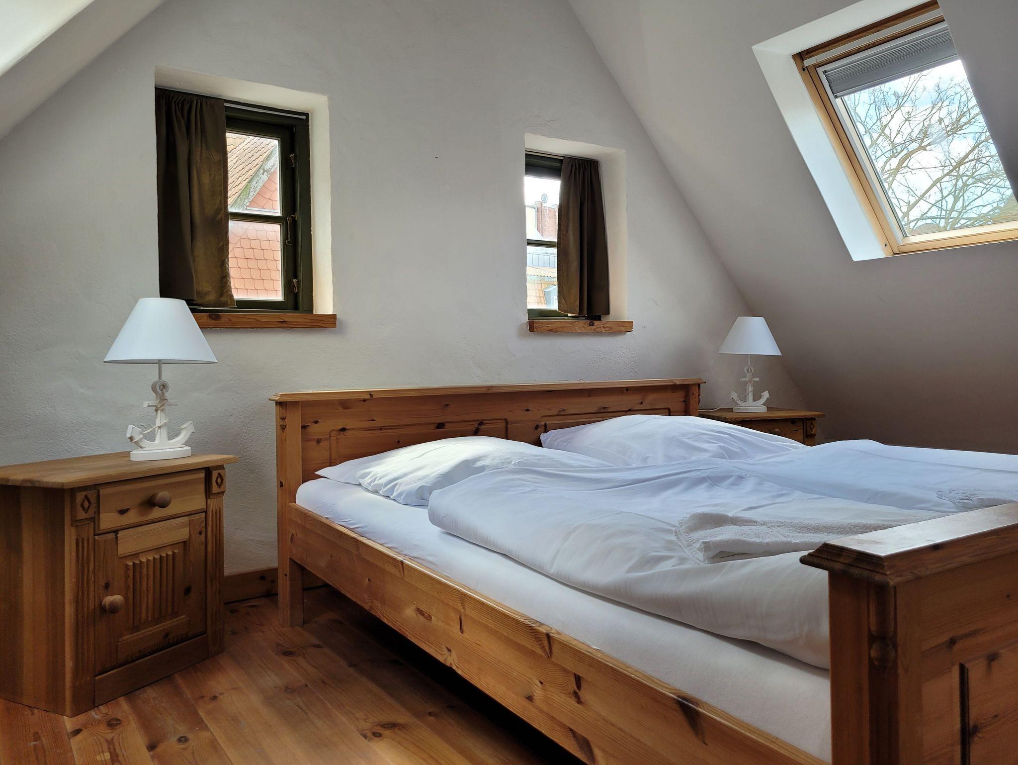 Das Admiralshaus hat ca. 108 qm, mit 1 Schlafzimmer mit Doppelbett + Einzelbett in der 2 Etage, einem Schlafzimmer mit 2 Einzelbetten in der 1. Etage und einem großen Wohnbereich mit Schlafsofa und offener Küche mit Ess-Sitz-Bereich im Erdgeschoss.